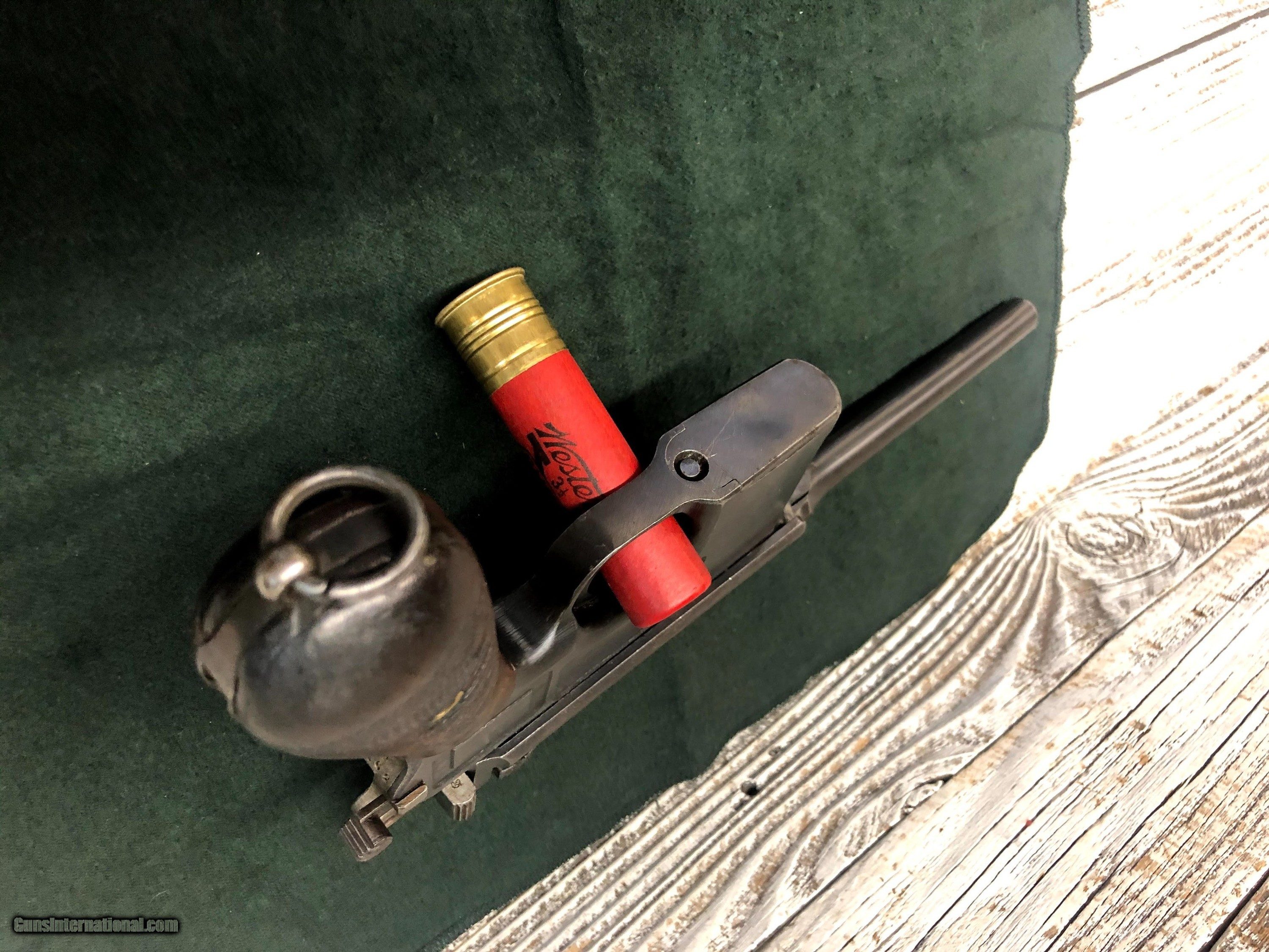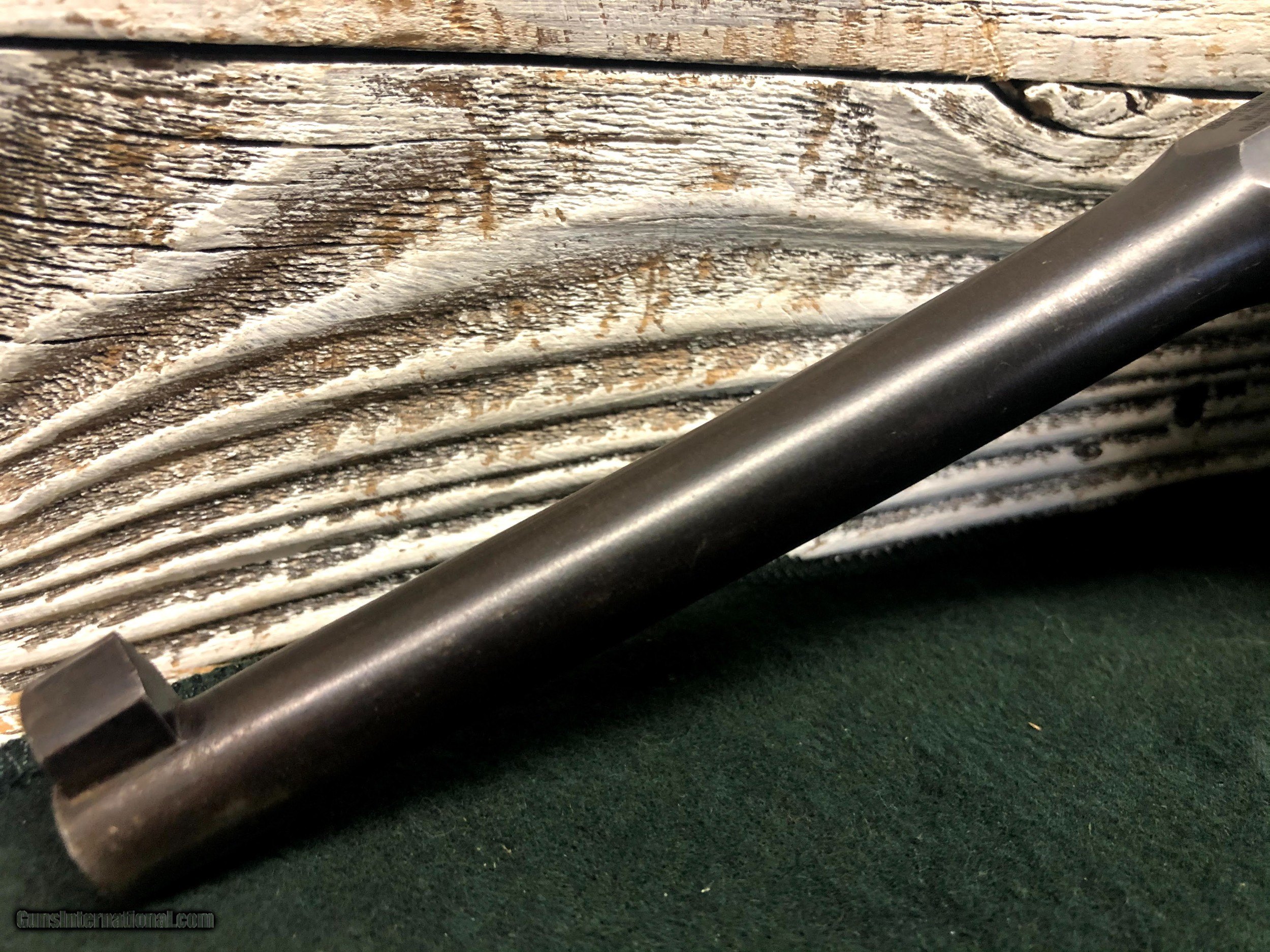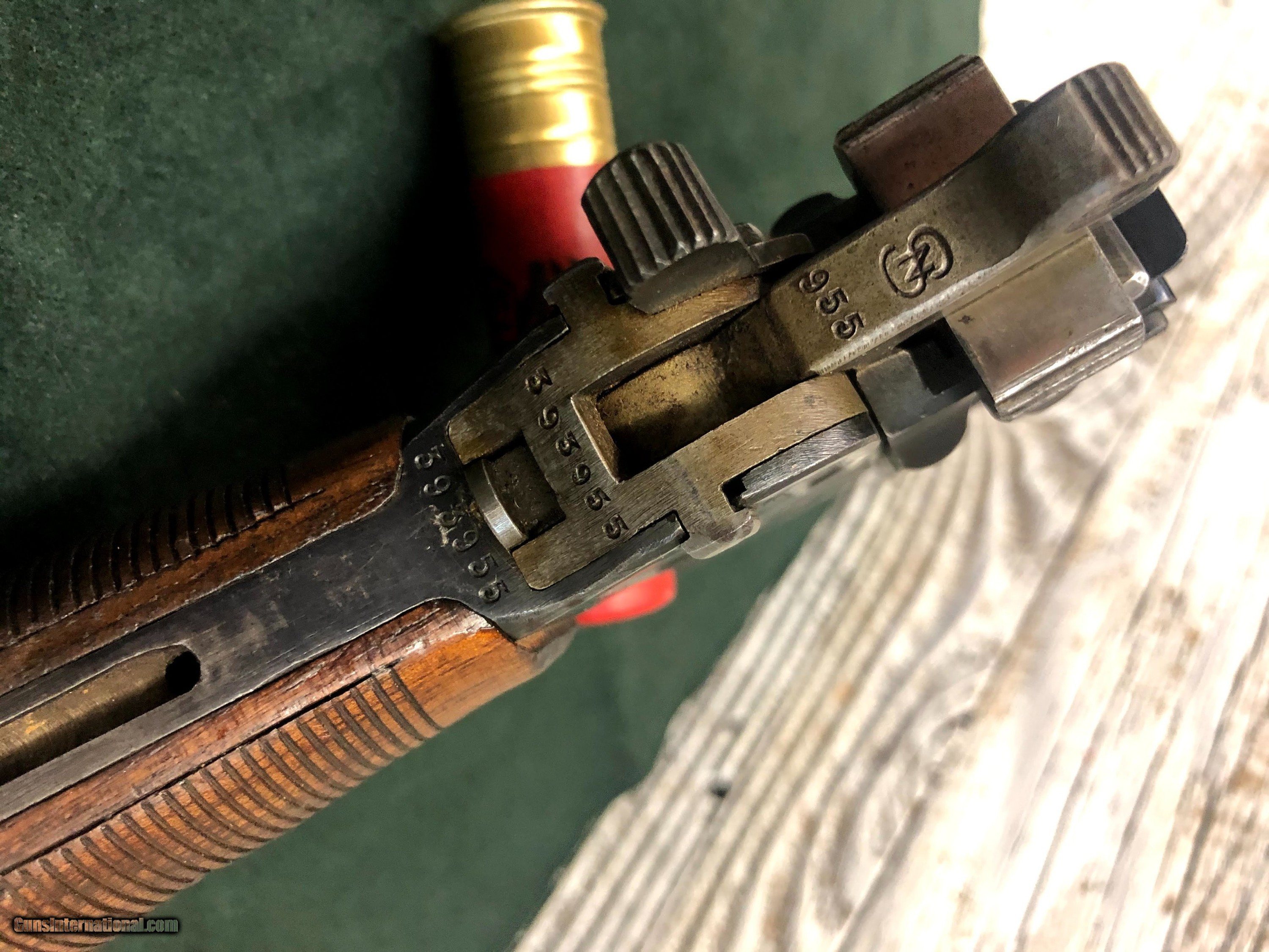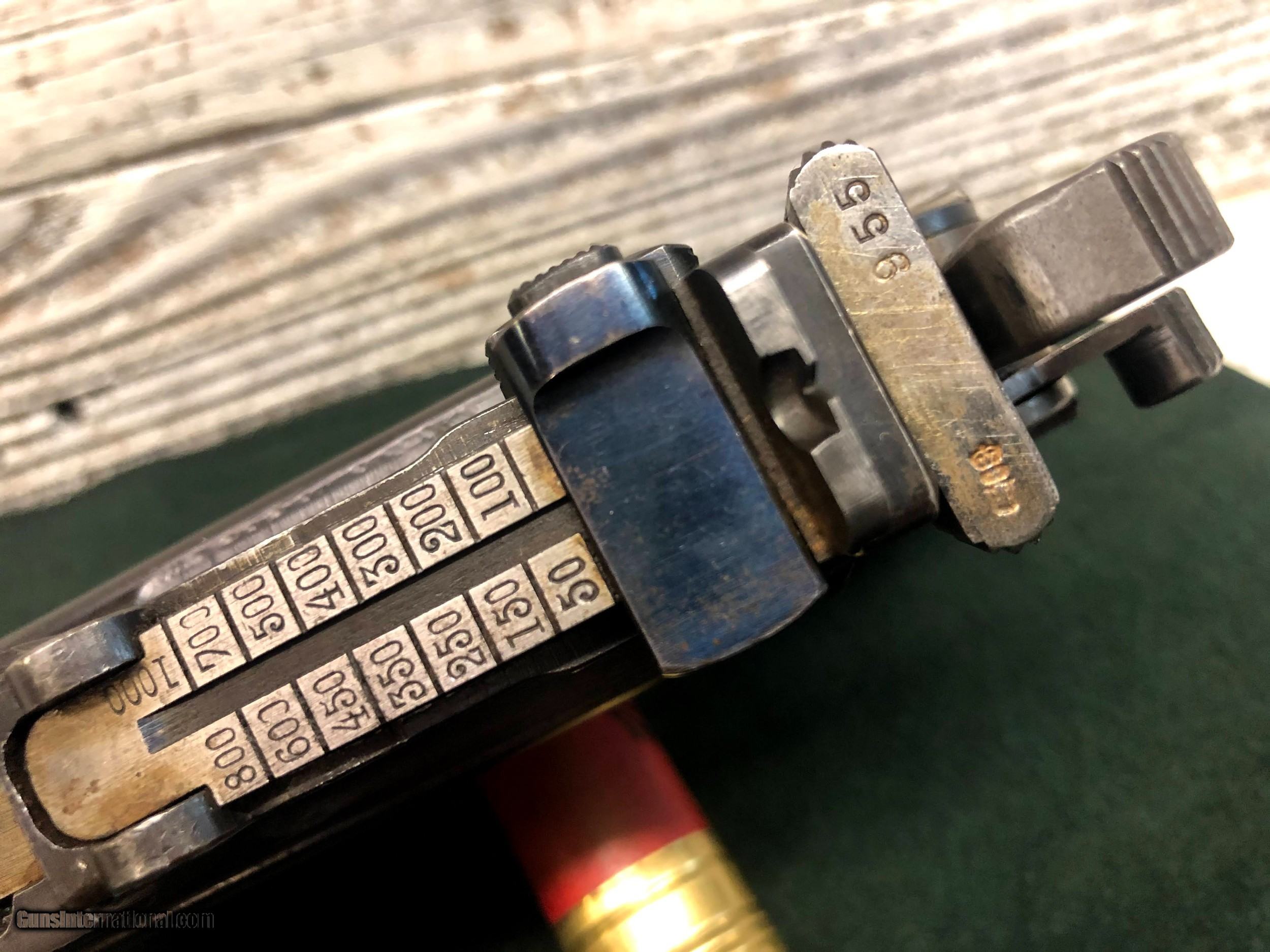 Description: Wartime Commercial Mauser C96 in 30 Luger. Serial number indicates 1915 - 1918 DOM. The top of the barrel chamber is marked “WAFFENFABRIK / MAUSER / OBERNDORF A/N”. The left side of the chamber is marked with a double-crowned “U” definitive proof and the left shoulder with “393955”. The top rear of the bolt is marked with a double-crowned “U” and “955” and the top of the bolt stop is also marked “955”. The back of the lock mechanism and the top of the backstrap are marked “313955” and the back of the hammer is marked “955” and with a “NS”, indicating New Safety, which is the correct safety for this model. The right side of the frame is marked “WAFFENFABRIK MAUSER / OBERNDORF A. NECKAR”. The right side of the barrel at the chamber is marked with a crowned “Gothic R”. The flat on the underside of the barrel is marked “O”, “2”, "S" and “7”. The inside surfaces of the grips are marked “955”. The pistol is mounted with a “V” notch rear sliding elevator sight with markings from “50-1000” that is pinned to the barrel extension. The front sight is an inverted “V” blade fixed to the barrel. The pistol is blued with a fire blue finish on the extractor, bolt stop, safety, rear sight slider, rear sight spring and the rear section of the sight ladder and sight. The cocking piece on the bolt, the hammer, and the lock mechanism are finished “In The White”. The bore is gray with light to moderate wear in the rifling. There is light erosion in the grooves the length of the barrel. This pistol retains about 90% of its original metal finish. There are tiny spots of solid erosion scattered over the sides of the frame and barrel extension, the top of the bolt and rear sight slider, and the front strap. There are minimal tiny dings, a few scratches and thinning in the barrel, and thinning on the magazine floorplate, backstrap, frame rails and edges of the frame and barrel extension. There are a few tiny dings in the barrel extension, scratches at the top of the backstrap and scratches on the sides of the lock frame. The serrations on the hammer are relatively sharp, the serrations on the cocking piece show light wear and tiny nicks on their edges, and those on the safety are sharp. The grip screw is sharp and the markings are clear. Overall, this pistol rates in Very Good condition. PLEASE NOTE WE ARE A GUN STORE LOCATED IN DENVER COLORADO AND AS PER STATE LAW WE ARE REQUIRED TO COLLECT LOCAL SALES TAX OF 7.5% ON ALL OUT OS STATE SALES. SOLD Handgun Caliber: 7.65x22mm Parabellum (7.65x22mm Luger, .30 Luger) |