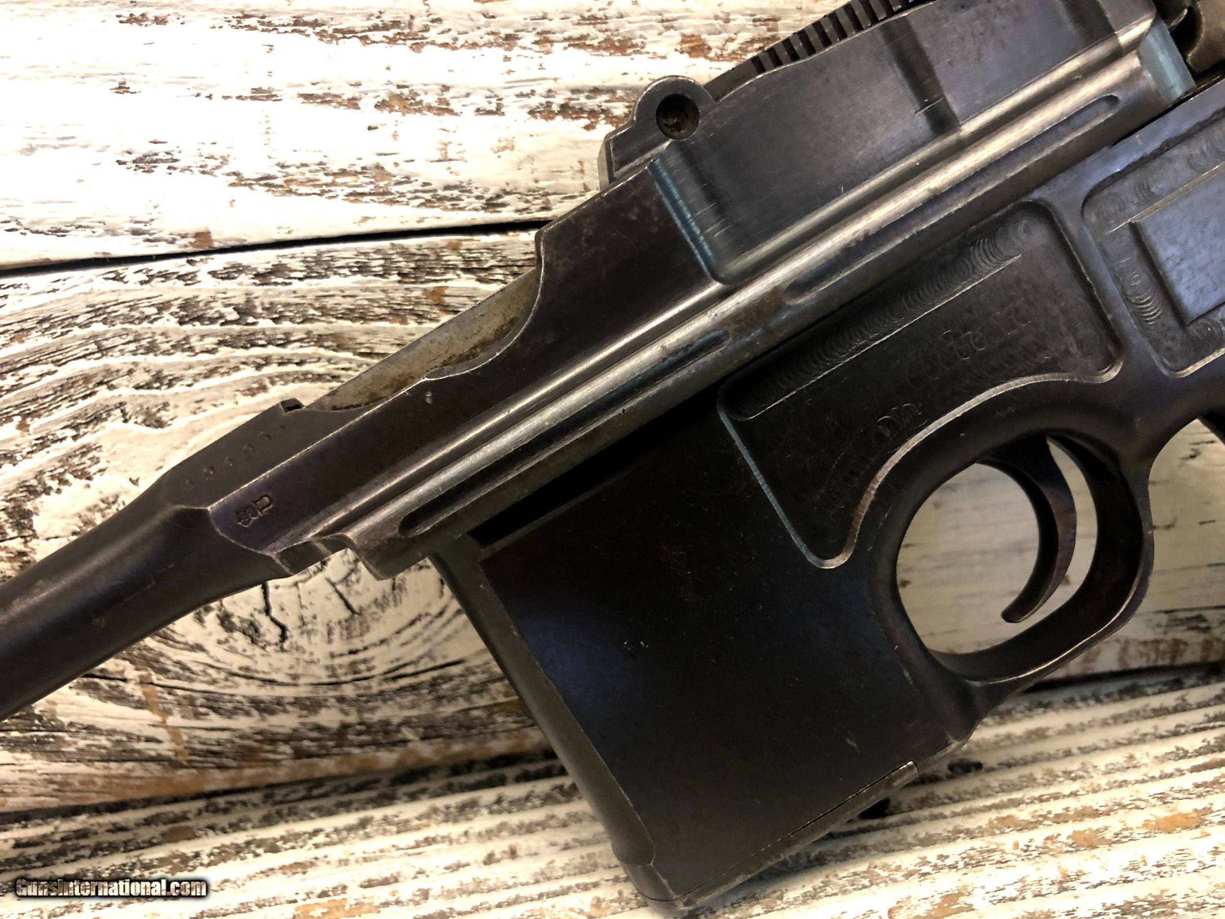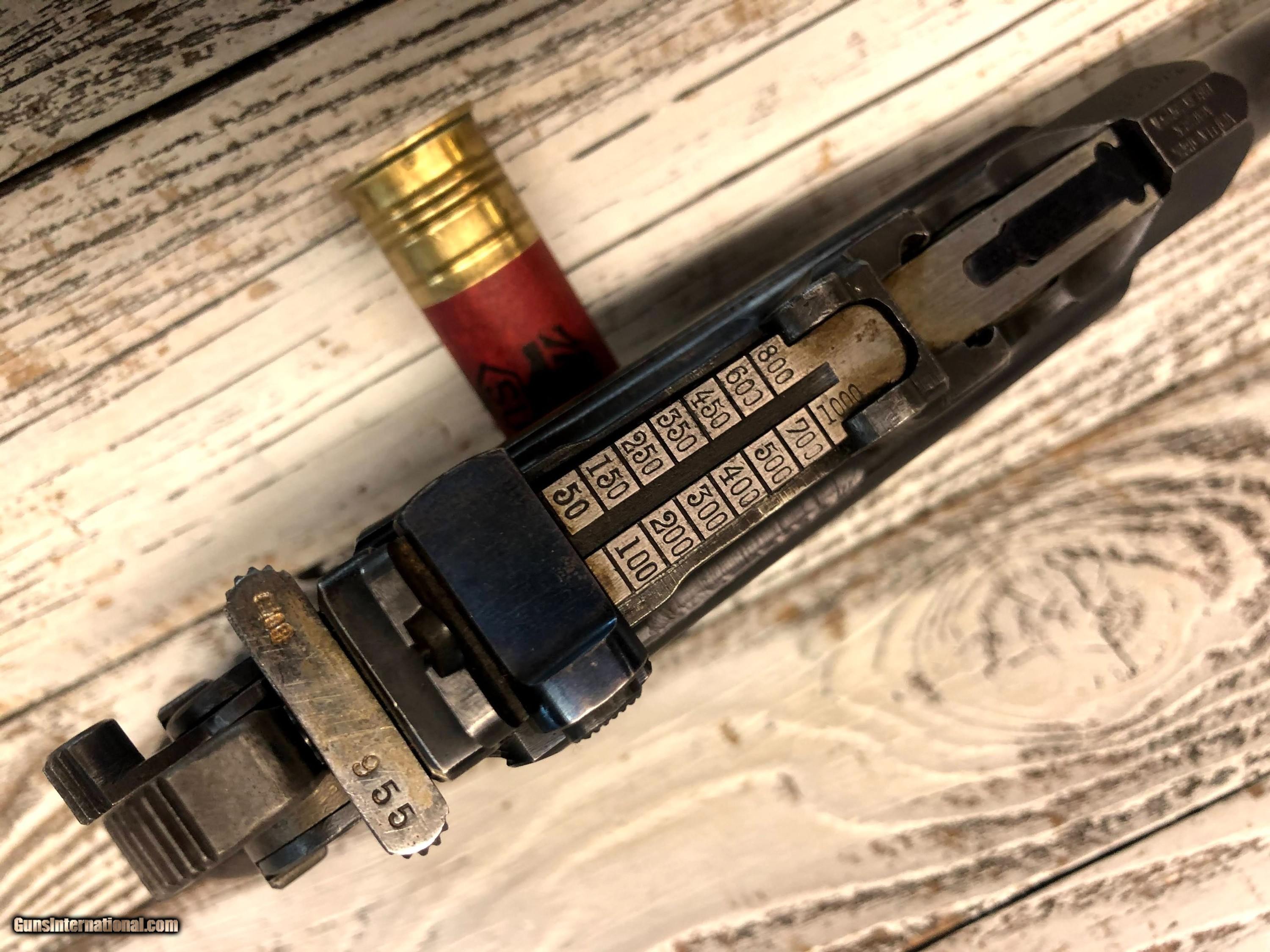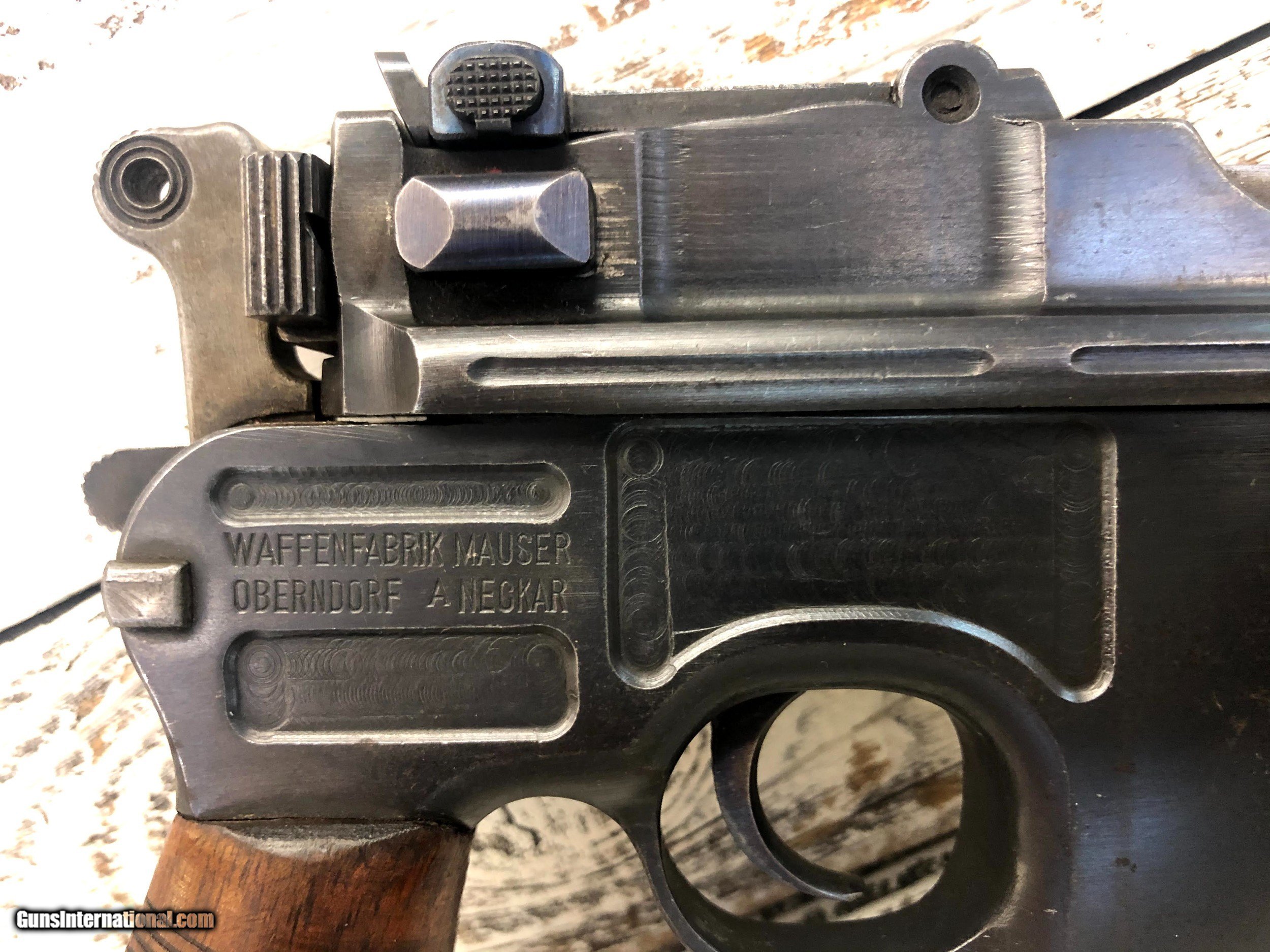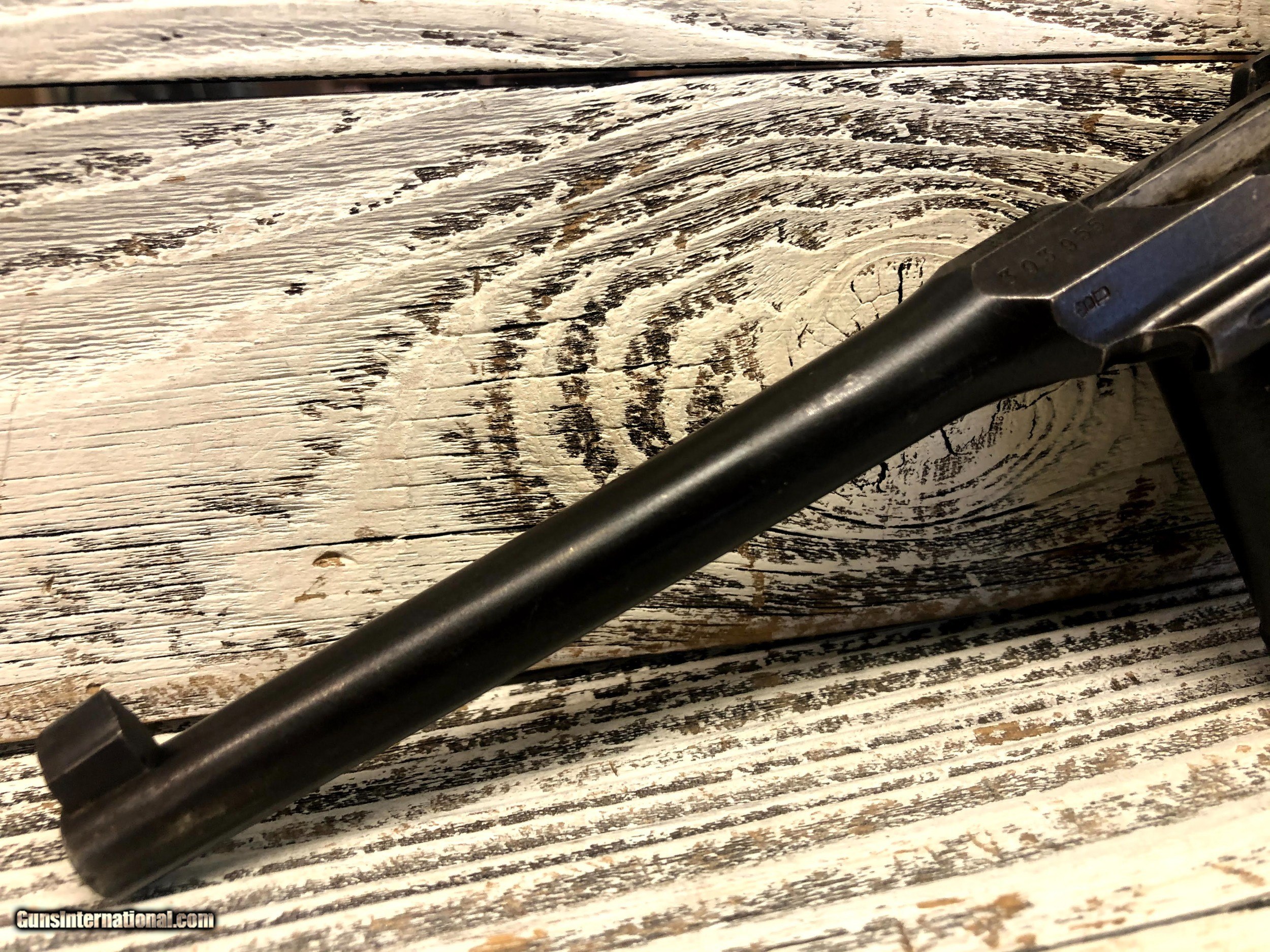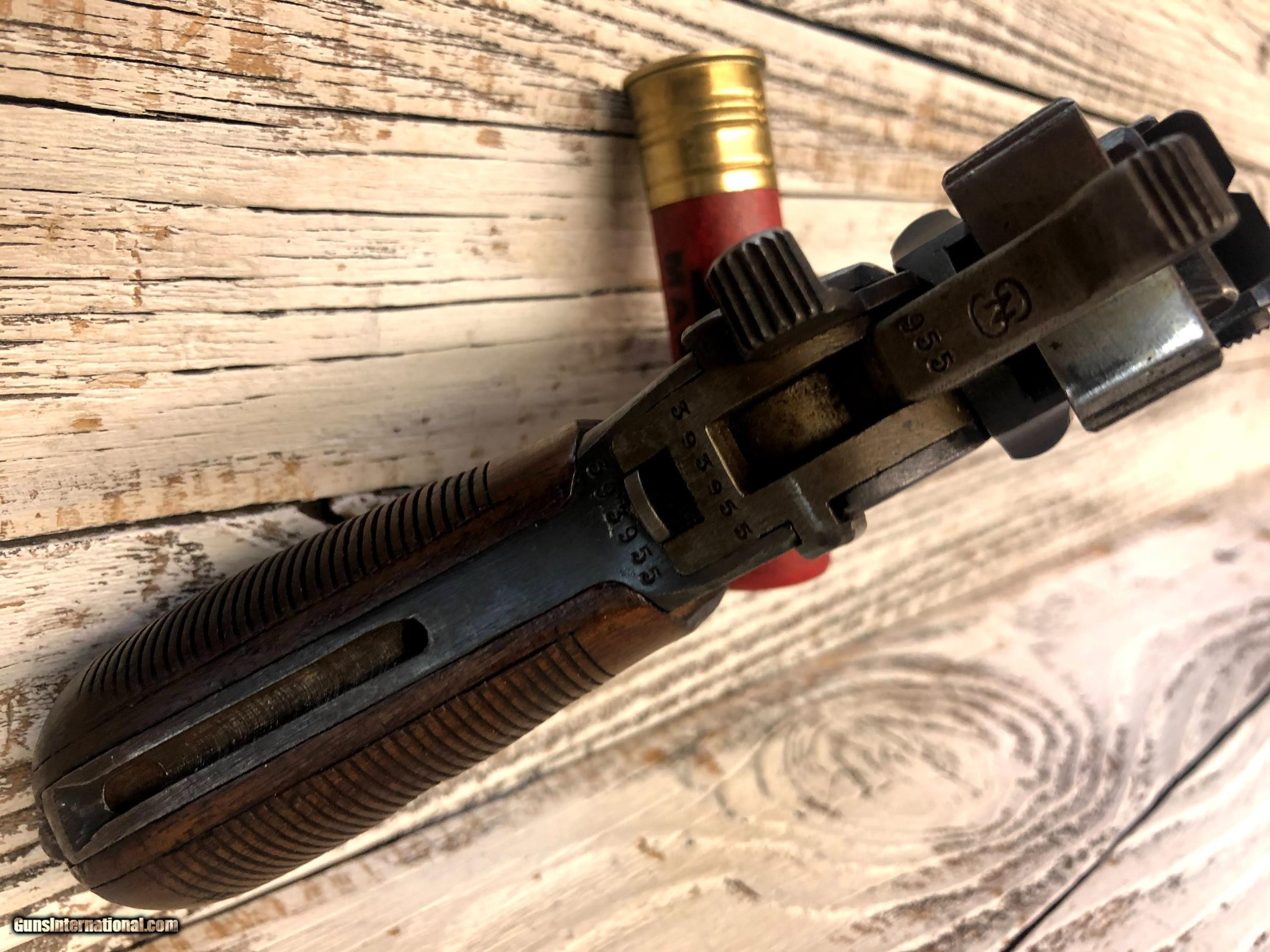 Description: Wartime Commercial Mauser C96 in 30 Luger. Serial number indicates 1915 - 1918 DOM. The top of the barrel chamber is marked “WAFFENFABRIK / MAUSER / OBERNDORF A/N”. The left side of the chamber is marked with a double-crowned “U” definitive proof and the left shoulder with “393955”. The top rear of the bolt is marked with a double-crowned “U” and “955” and the top of the bolt stop is also marked “955”. The back of the lock mechanism and the top of the backstrap are marked “313955” and the back of the hammer is marked “955” and with a “NS”, indicating New Safety, which is the correct safety for this model. The right side of the frame is marked “WAFFENFABRIK MAUSER / OBERNDORF A. NECKAR”. The right side of the barrel at the chamber is marked with a crowned “Gothic R”. The flat on the underside of the barrel is marked “O”, “2”, "S" and “7”. The inside surfaces of the grips are marked “955”. The pistol is mounted with a “V” notch rear sliding elevator sight with markings from “50-1000” that is pinned to the barrel extension. The front sight is an inverted “V” blade fixed to the barrel. The pistol is blued with a fire blue finish on the extractor, bolt stop, safety, rear sight slider, rear sight spring and the rear section of the sight ladder and sight. The cocking piece on the bolt, the hammer, and the lock mechanism are finished “In The White”. The bore is gray with light to moderate wear in the rifling. There is light erosion in the grooves the length of the barrel. This pistol retains about 90% of its original metal finish. There are tiny spots of solid erosion scattered over the sides of the frame and barrel extension, the top of the bolt and rear sight slider, and the front strap. There are minimal tiny dings, a few scratches and thinning in the barrel, and thinning on the magazine floorplate, backstrap, frame rails and edges of the frame and barrel extension. There are a few tiny dings in the barrel extension, scratches at the top of the backstrap and scratches on the sides of the lock frame. The serrations on the hammer are relatively sharp, the serrations on the cocking piece show light wear and tiny nicks on their edges, and those on the safety are sharp. The grip screw is sharp and the markings are clear. Overall, this pistol rates in Very Good condition. SOLD Handgun Caliber: 7.65x22mm Parabellum (7.65x22mm Luger, .30 Luger) Manufacturer: DWM Model: C96 |