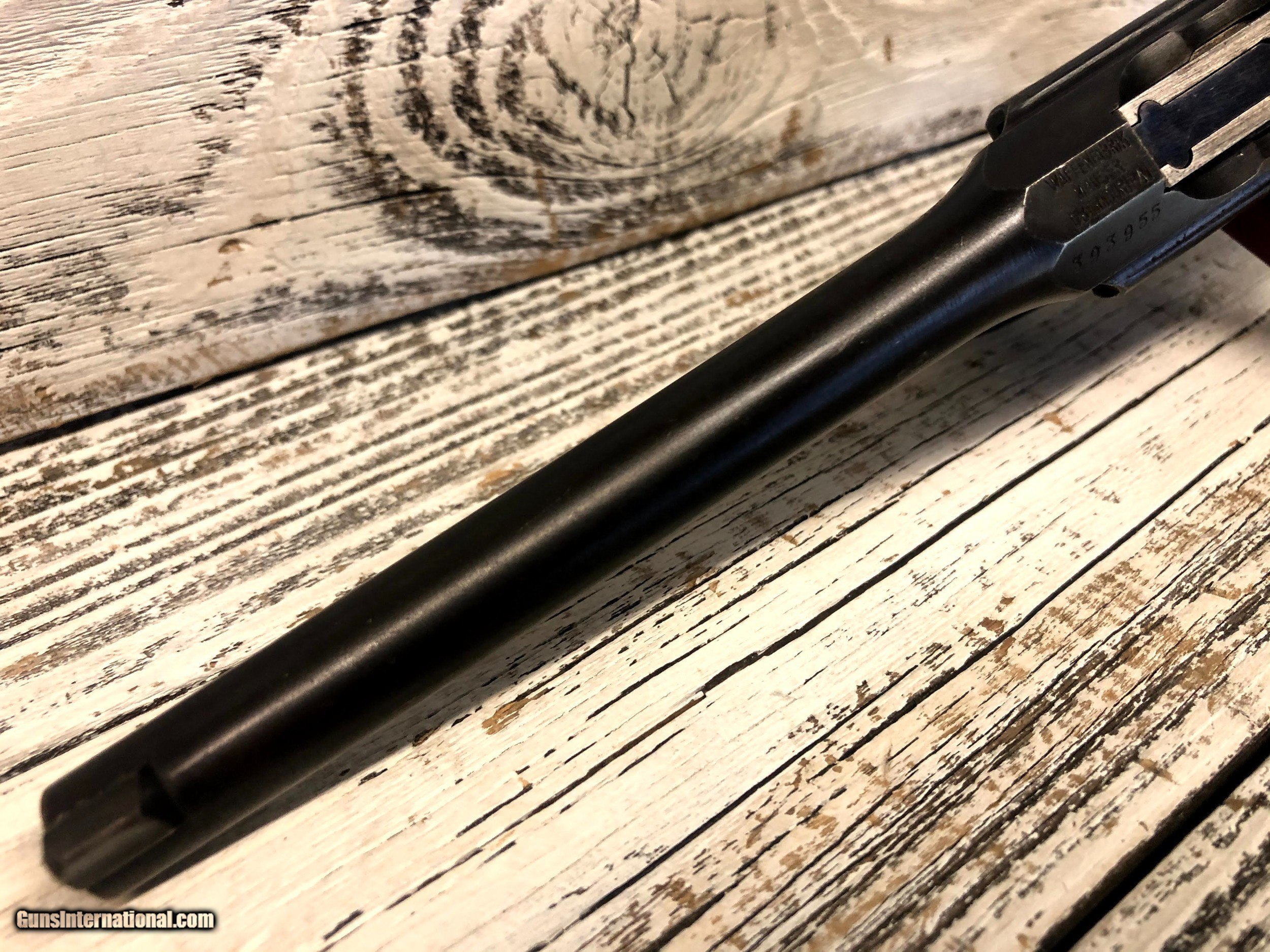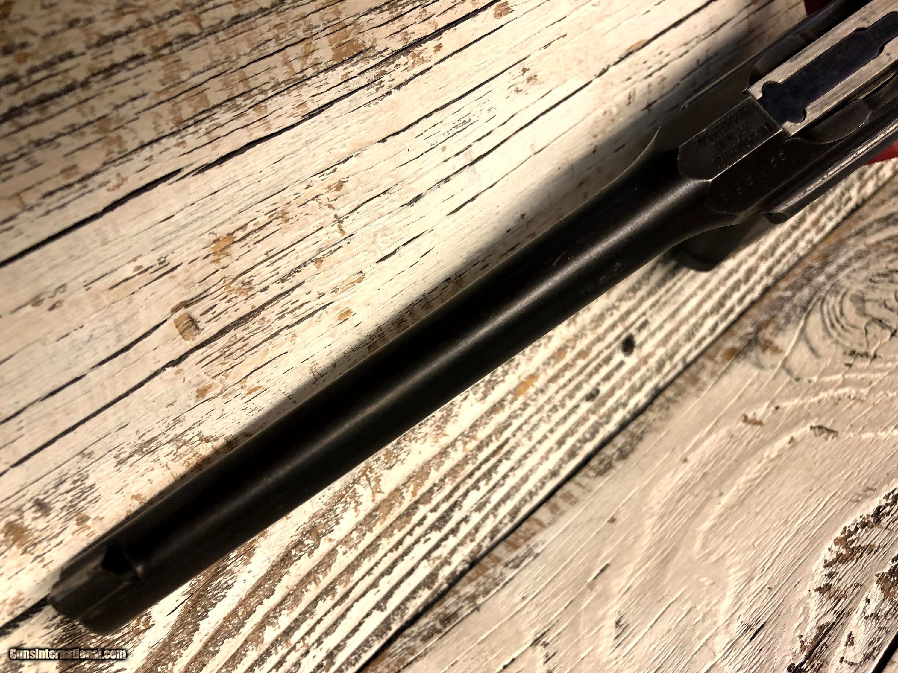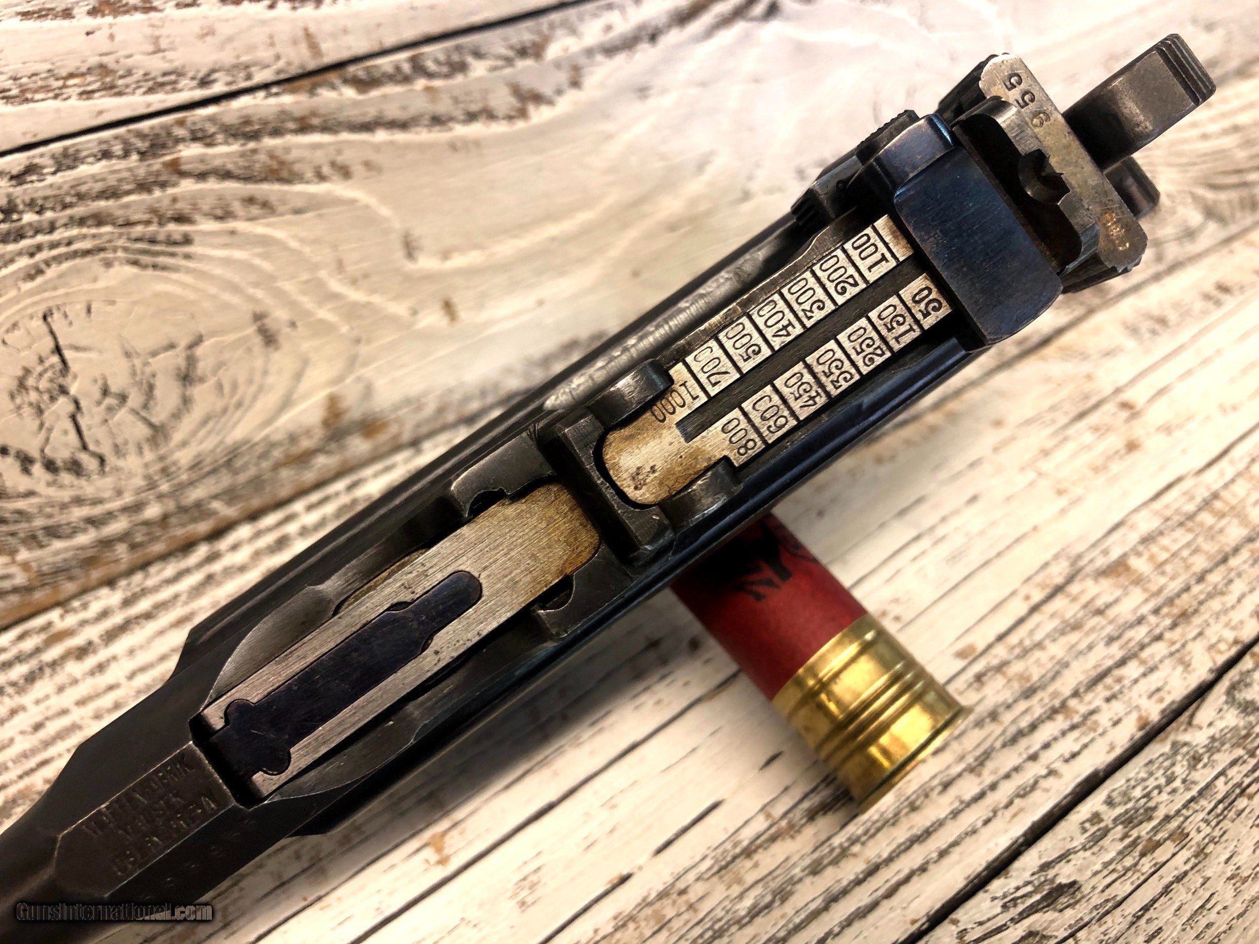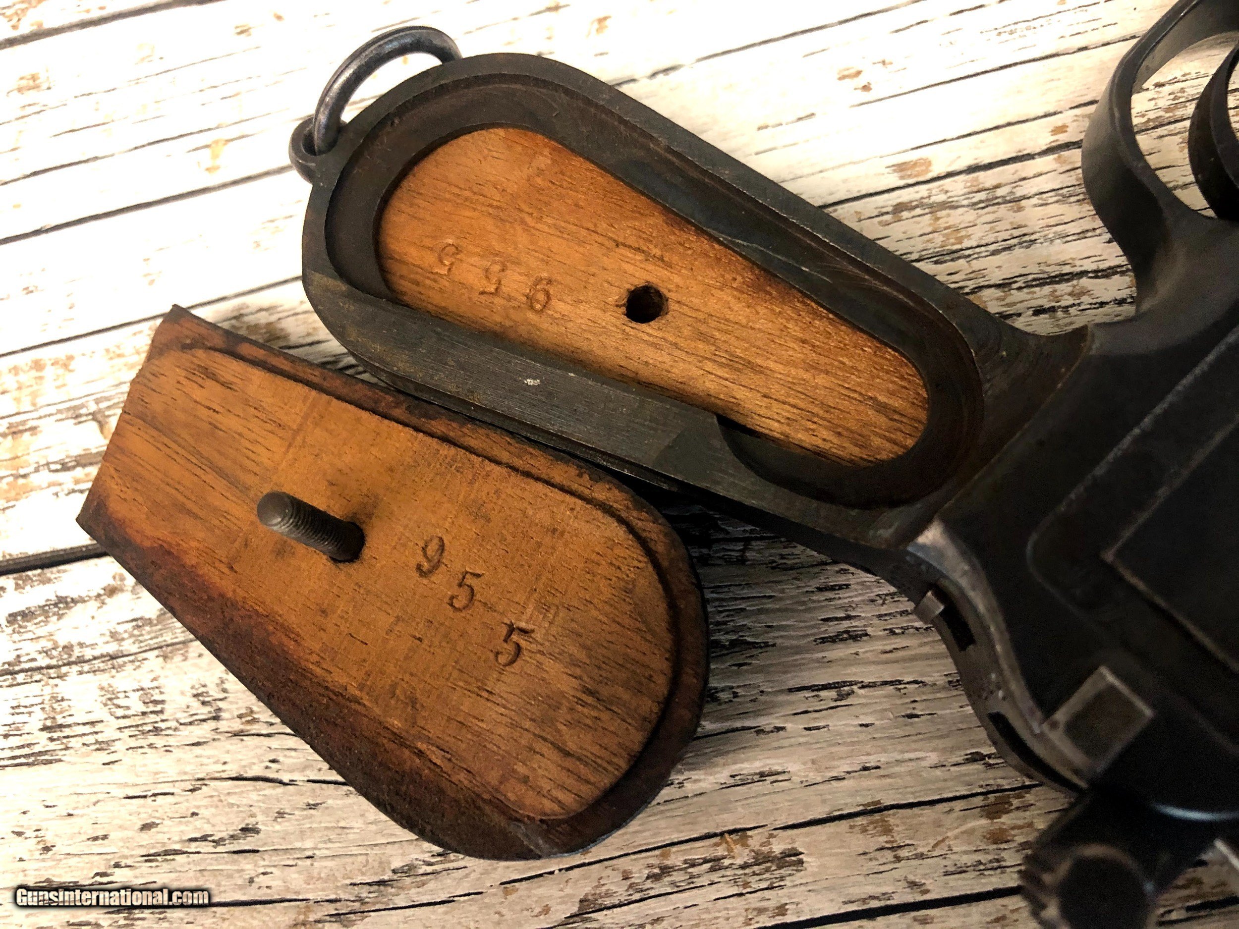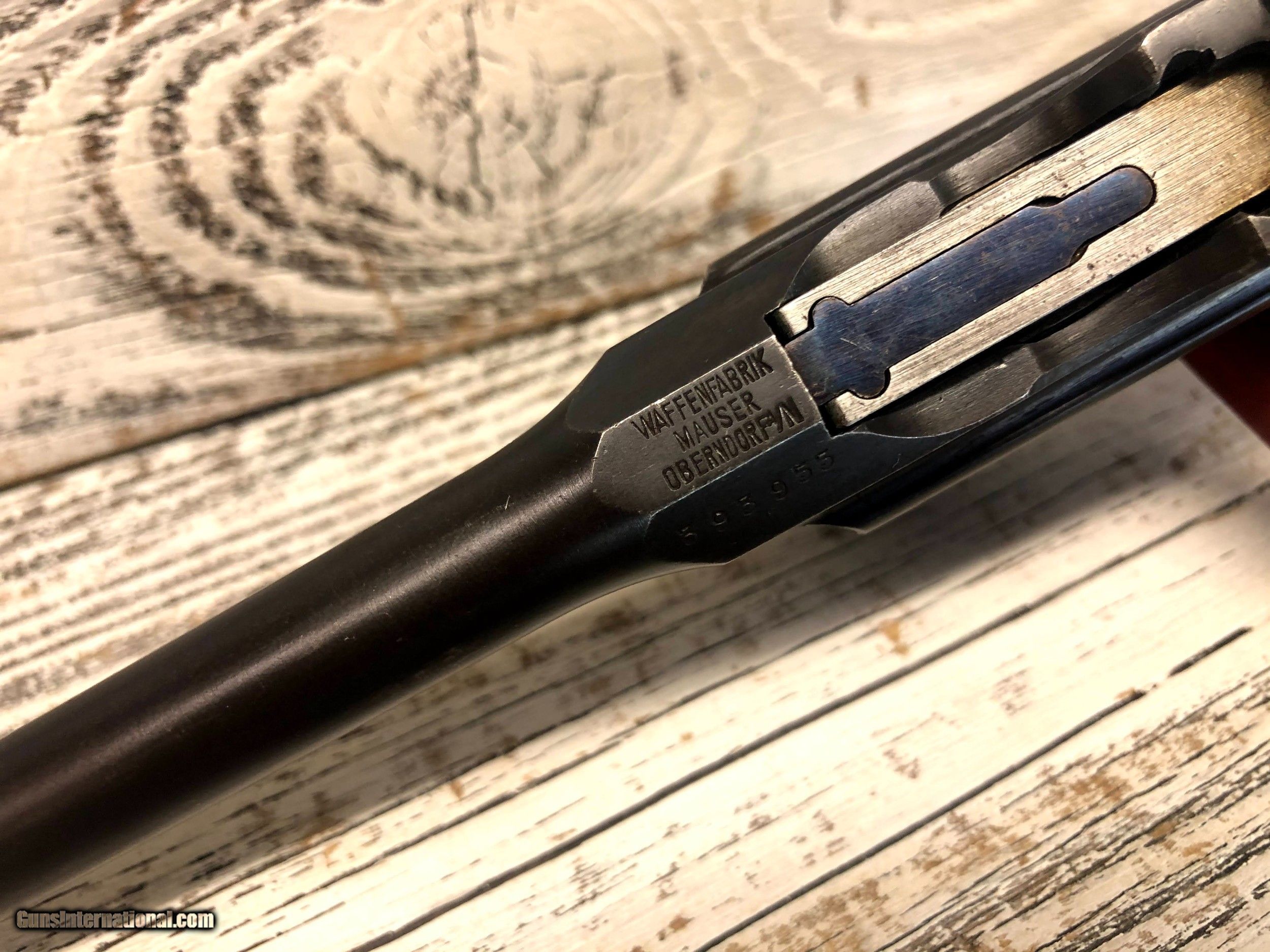 Description: Wartime Commercial Mauser C96 in 30 Luger. Serial number indicates 1915 - 1918 DOM. The top of the barrel chamber is marked “WAFFENFABRIK / MAUSER / OBERNDORF A/N”. The left side of the chamber is marked with a double-crowned “U” definitive proof and the left shoulder with “393955”. The top rear of the bolt is marked with a double-crowned “U” and “955” and the top of the bolt stop is also marked “955”. The back of the lock mechanism and the top of the backstrap are marked “313955” and the back of the hammer is marked “955” and with a “NS”, indicating New Safety, which is the correct safety for this model. The right side of the frame is marked “WAFFENFABRIK MAUSER / OBERNDORF A. NECKAR”. The right side of the barrel at the chamber is marked with a crowned “Gothic R”. The flat on the underside of the barrel is marked “O”, “2”, "S" and “7”. The inside surfaces of the grips are marked “955”. The pistol is mounted with a “V” notch rear sliding elevator sight with markings from “50-1000” that is pinned to the barrel extension. The front sight is an inverted “V” blade fixed to the barrel. The pistol is blued with a fire blue finish on the extractor, bolt stop, safety, rear sight slider, rear sight spring and the rear section of the sight ladder and sight. The cocking piece on the bolt, the hammer, and the lock mechanism are finished “In The White”. The bore is gray with light to moderate wear in the rifling. There is light erosion in the grooves the length of the barrel. This pistol retains about 90% of its original metal finish. There are tiny spots of solid erosion scattered over the sides of the frame and barrel extension, the top of the bolt and rear sight slider, and the front strap. There are minimal tiny dings, a few scratches and thinning in the barrel, and thinning on the magazine floorplate, backstrap, frame rails and edges of the frame and barrel extension. There are a few tiny dings in the barrel extension, scratches at the top of the backstrap and scratches on the sides of the lock frame. The serrations on the hammer are relatively sharp, the serrations on the cocking piece show light wear and tiny nicks on their edges, and those on the safety are sharp. The grip screw is sharp and the markings are clear. Overall, this pistol rates in Very Good condition. SOLD Handgun Caliber: 7.65x22mm Parabellum (7.65x22mm Luger, .30 Luger) Manufacturer: DWM Model: C96 |