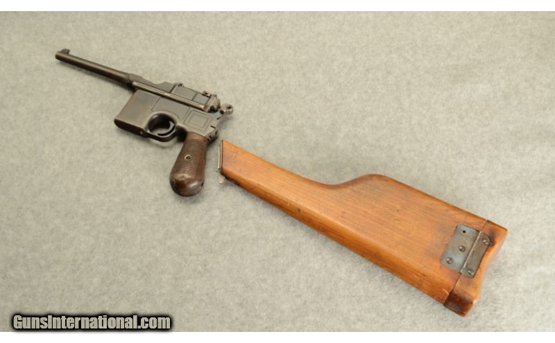 Description: This is the Mauser 1896 "Broomhandle" Pistol with Wooden Shoulder Stock / Holster. SOLD Manufacturer: 1915-1921 Caliber Info: 7.63x25 Metal Condition: Good Wood Condition: Good Bore Condition: Good to Very Good Barrels: 5 1/4 inches Weight: 40 ozs. Sights: V-Notch Rear Tangent Adjustable Sight, Inverted V Front Sight Item Location: Garner, NC |