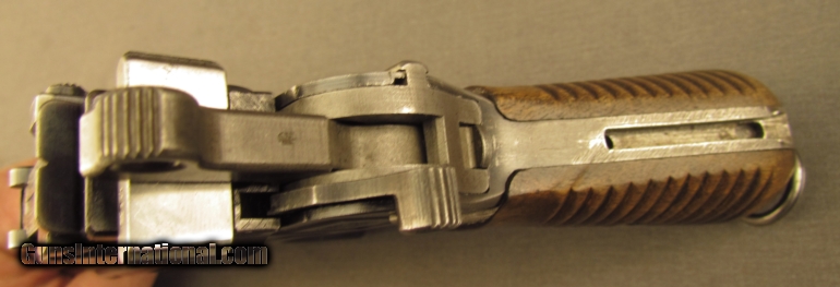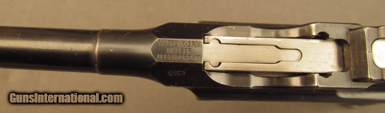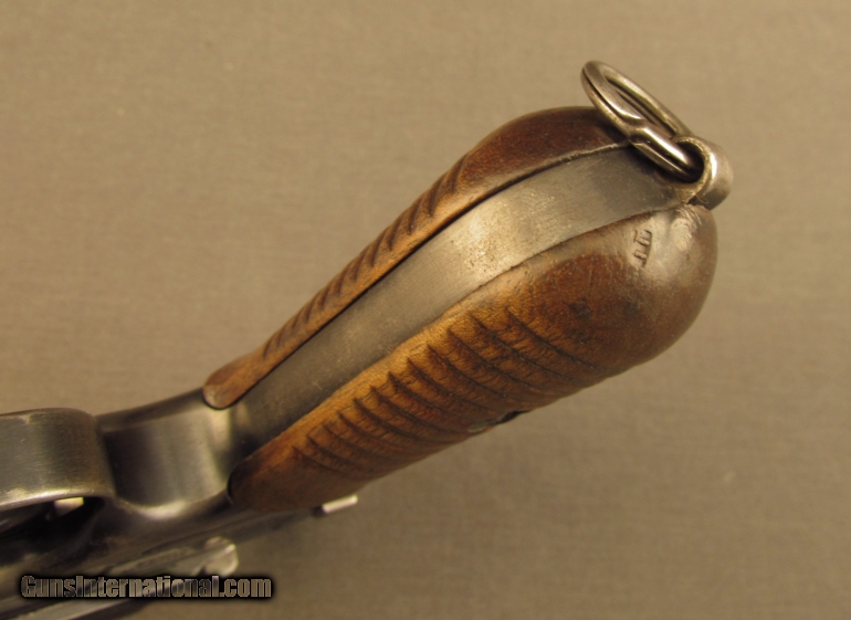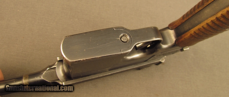 Description: Serial #855516, 7.63mm Mauser, 5 1/4? barrel with a fine, bright bore that has a touch of light freckling within the grooves at the muzzle. This is a handsome pistol that retains 95-97% of the original blue finish that has silvered and faded at the muzzle as well as on some of the other projecting edges and surfaces. There is some light pinprick pitting on the sides of the receiver rails on either side of the ejection port as well, but these are quite minor. The bolt and hammer have some mild freckling on the otherwise pewter gray patina and there are some faint traces of the original bright fire blue on the extractor. The 12 groove wooden grips are not numbered on the interior and are in fine shape with a few minor handling marks and surface blemishes on both panels but no cracks or chips. A small ?6? stamp is present at the butt on the left side. The mechanism has tight lock-up, the action functions flawlessly, and this is a fine plus example of a 1930 Broomhandle overall. {Ref. The Broomhandle Pistol 1896-1936, Erickson & Pate; 2000} FFL or C&R SOLD Curio/Relic: Yes Manufacturer: Mauser Model: 1930 Serial Number: 855516 Caliber Info: .30 Mauser Gauge Info: .30 Mauser |