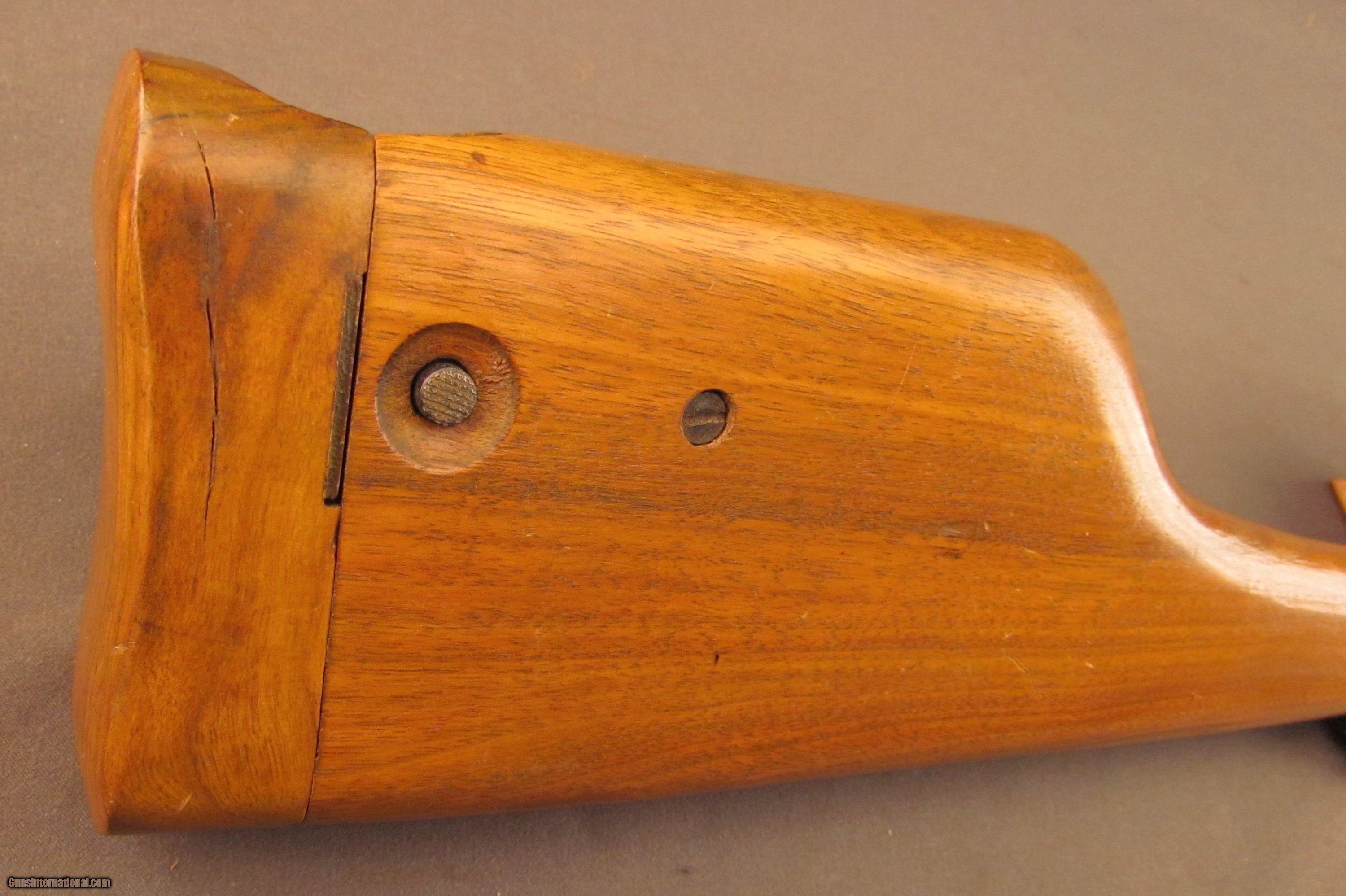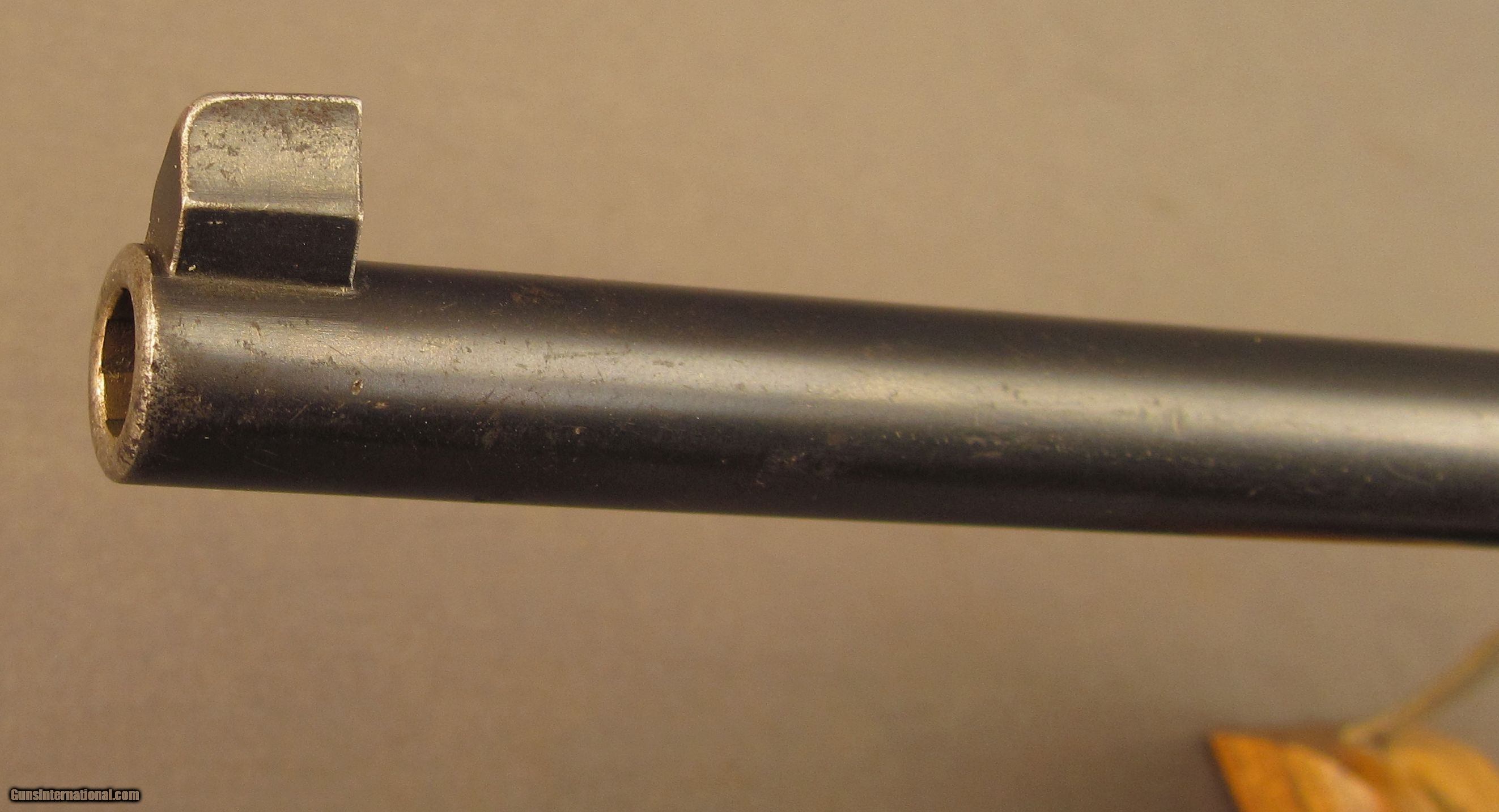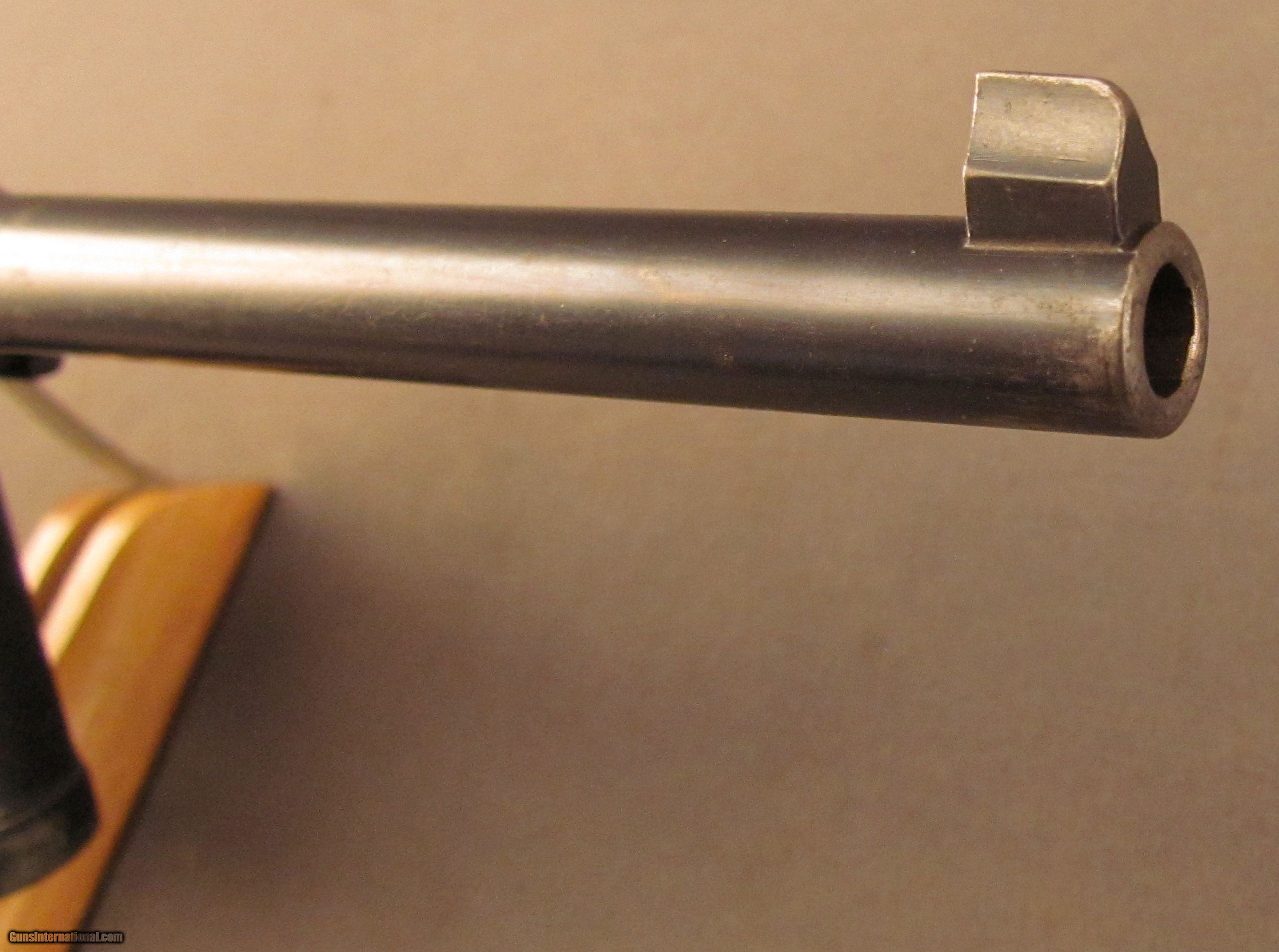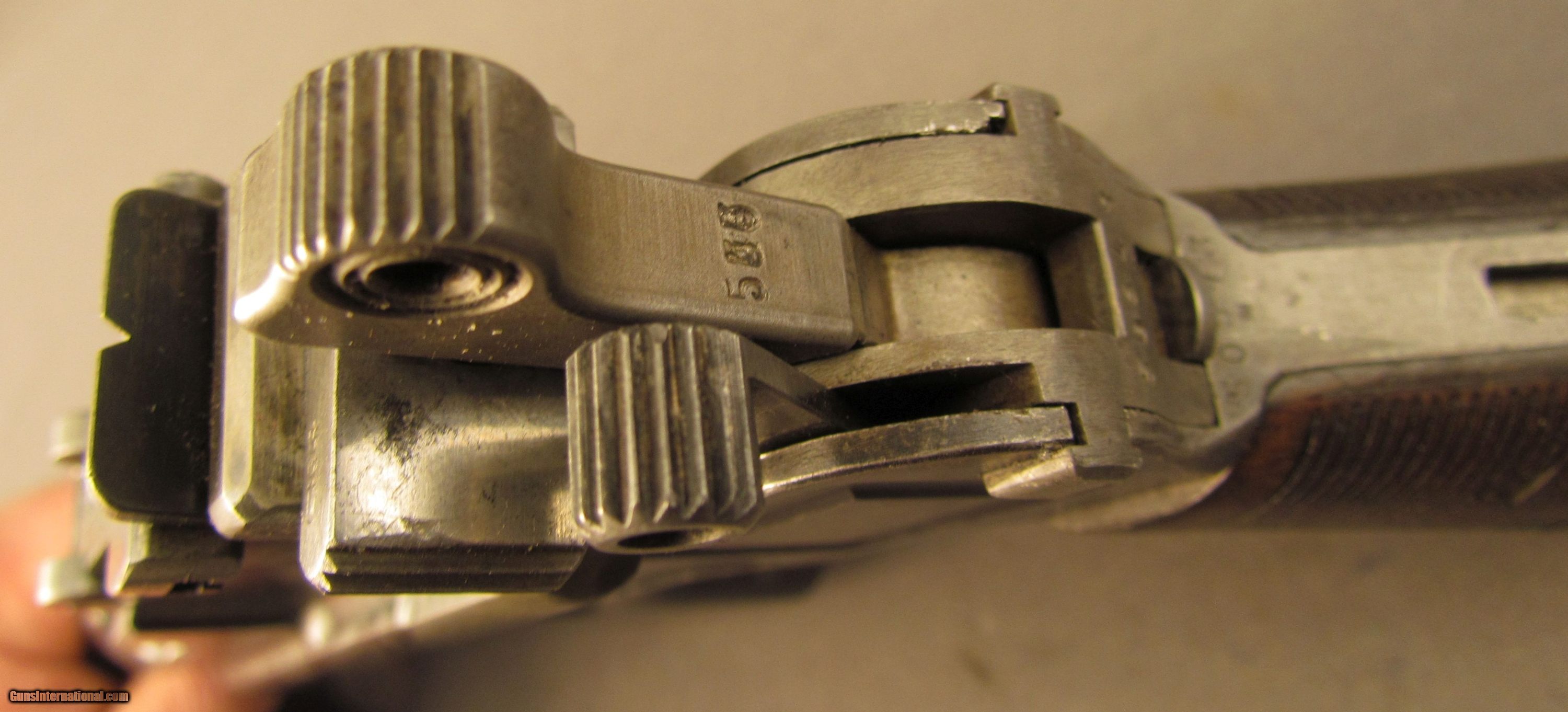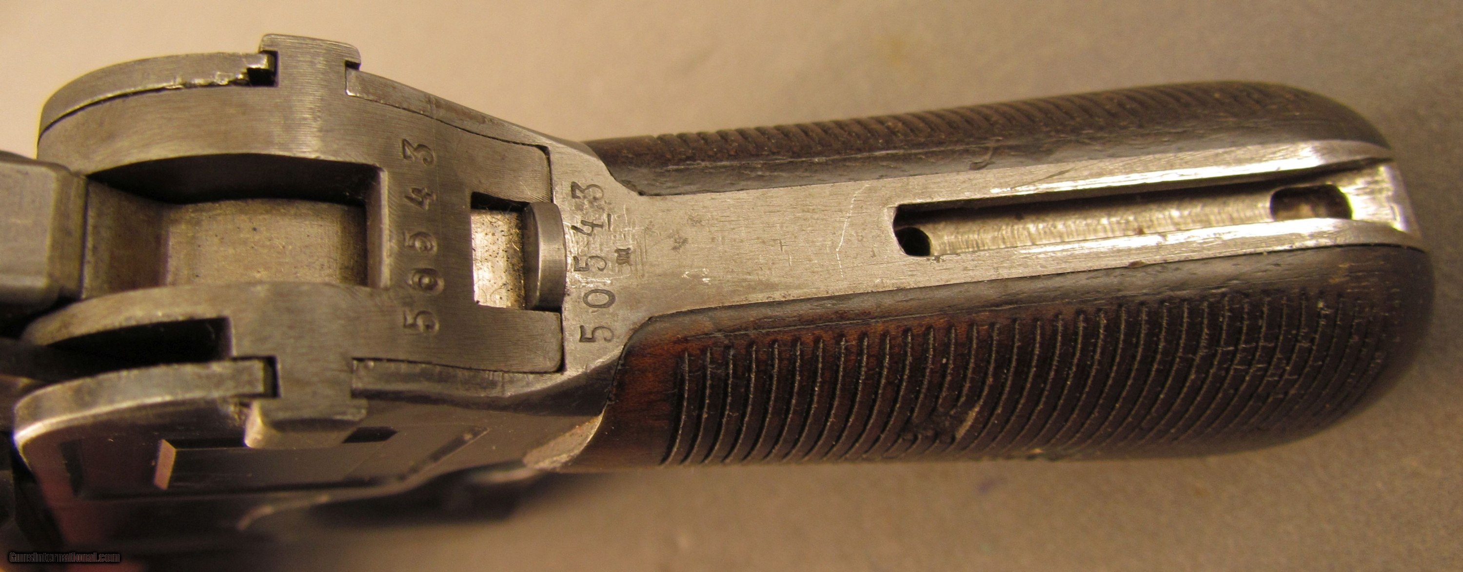 Description: Serial #50543, 7.63mm (.30 Mauser), 5 1/2" barrel with a very good bore that has mild freckling within the grooves. This pistol has mixed numbers and retains 80-85% of the original dull blue finish with some fading to slightly mottled gray along the exposed edges and bearing surfaces, as well as a swath of smooth, unpitted gray metal at the rear of the frame and receiver. The walnut 36 groove grips are not numbered, and have small handling marks and minor blemishes in the dark oil finish on either side. The pistol is housed in a matching numbered, modern-made wooden holster/stock that has scattered small handling marks and minor blemishes throughout. This is a very good example of a Pre-War Broomhandle Mauser with a great accessory, and would make a splendid addition to any collection. FFL or C&R SOLD Curio/Relic: Yes Manufacturer: Mauser Model: Broomhandle Serial Number: 50543 Caliber Info: 7.63mm Gauge Info: 7.63mm |