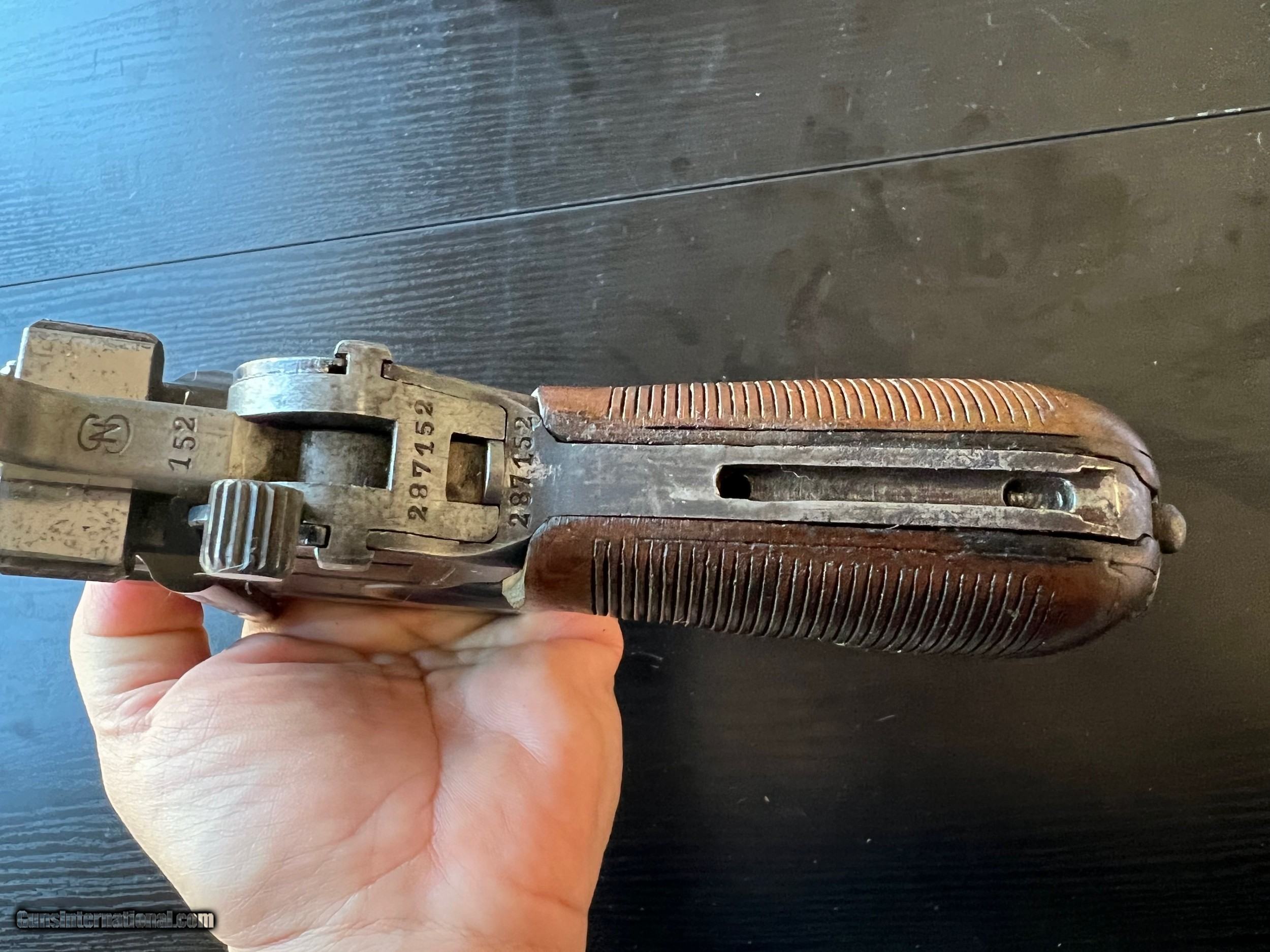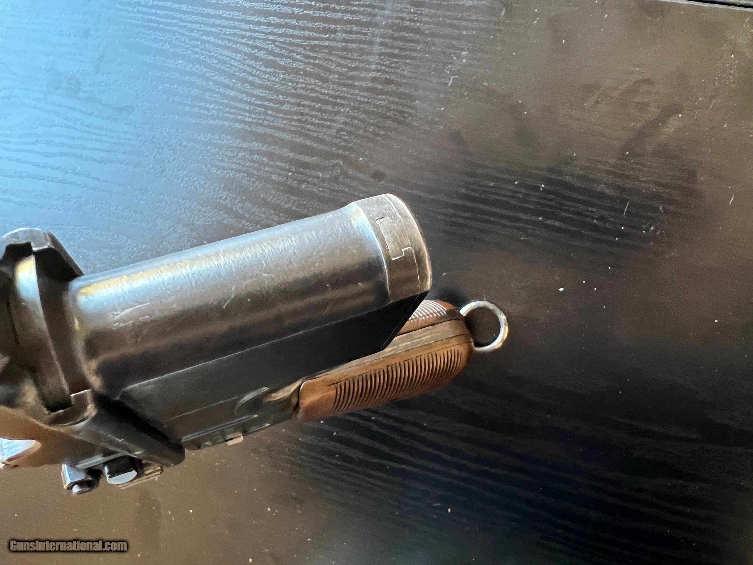 Description: SOLD This is a fantastic example of an Imperial German Army WWI contract Mauser Broomhandle pistol, made around 1915 and chambered in hard hitting 7.63 Mauser. It is a complete all matching set that includes a matching numbered shoulder stock. The gun retains around 97% of its original blueing with minor wear from sliding in and out of the stock - on the sides of the mag well and under the barrel. There is no pitting. All numbers match both externally and internally, including the grips. Beautiful fire blue on the extractor, rear sight cursor, safety lever and the trigger. Excellent bore and grips. Both, the gun and the stock are proofed with an imperial army proof - a crown over a gothic letter. The stock is all original with no cracks or pieces missing. It is numbered to the gun on the attaching iron. Very difficult to find all matching rig that is over 100 years old! 3-day inspection FFL or C&R(where allowed). $45 shipping in CONUS SOLD Curio/Relic: Yes |