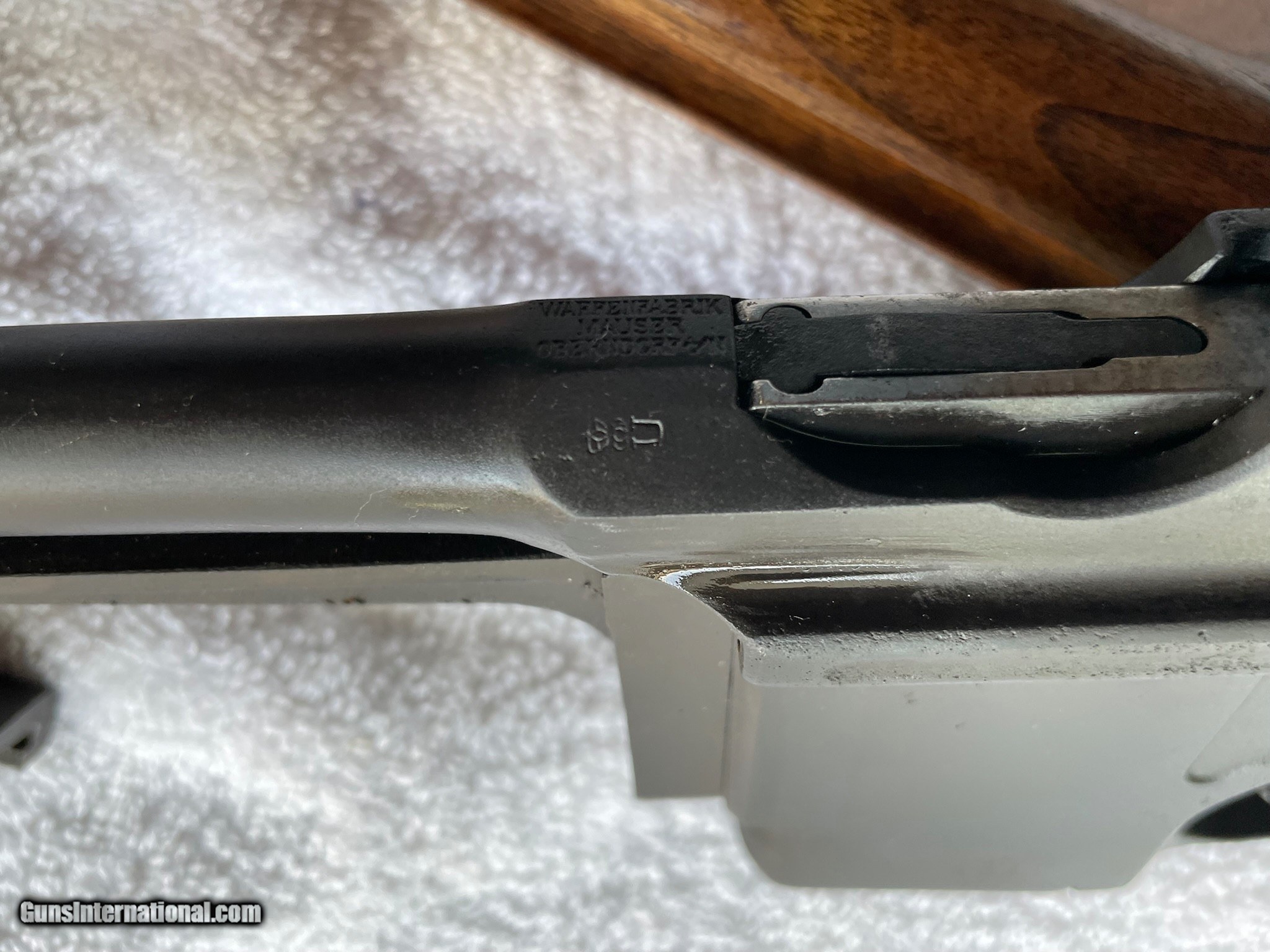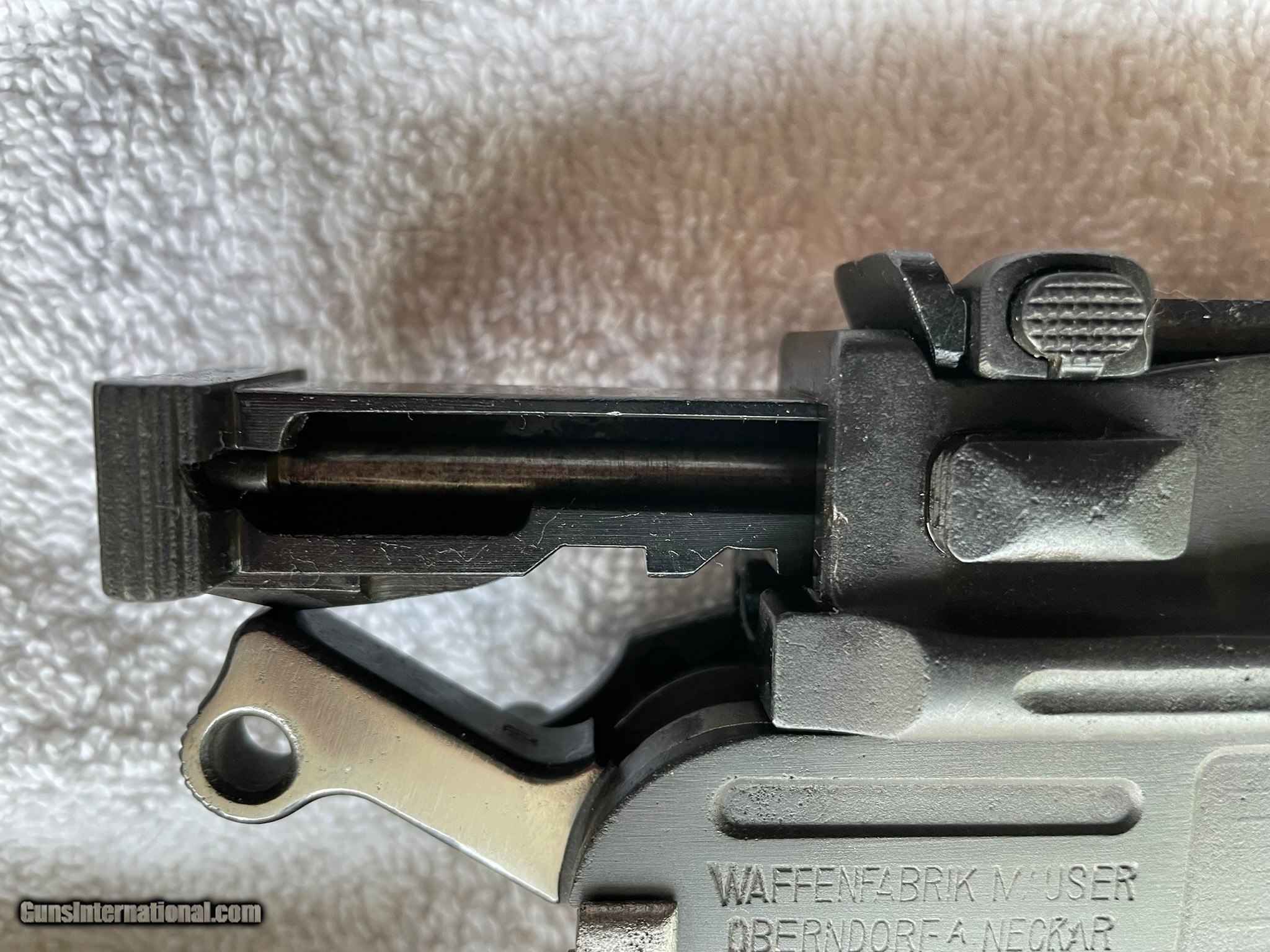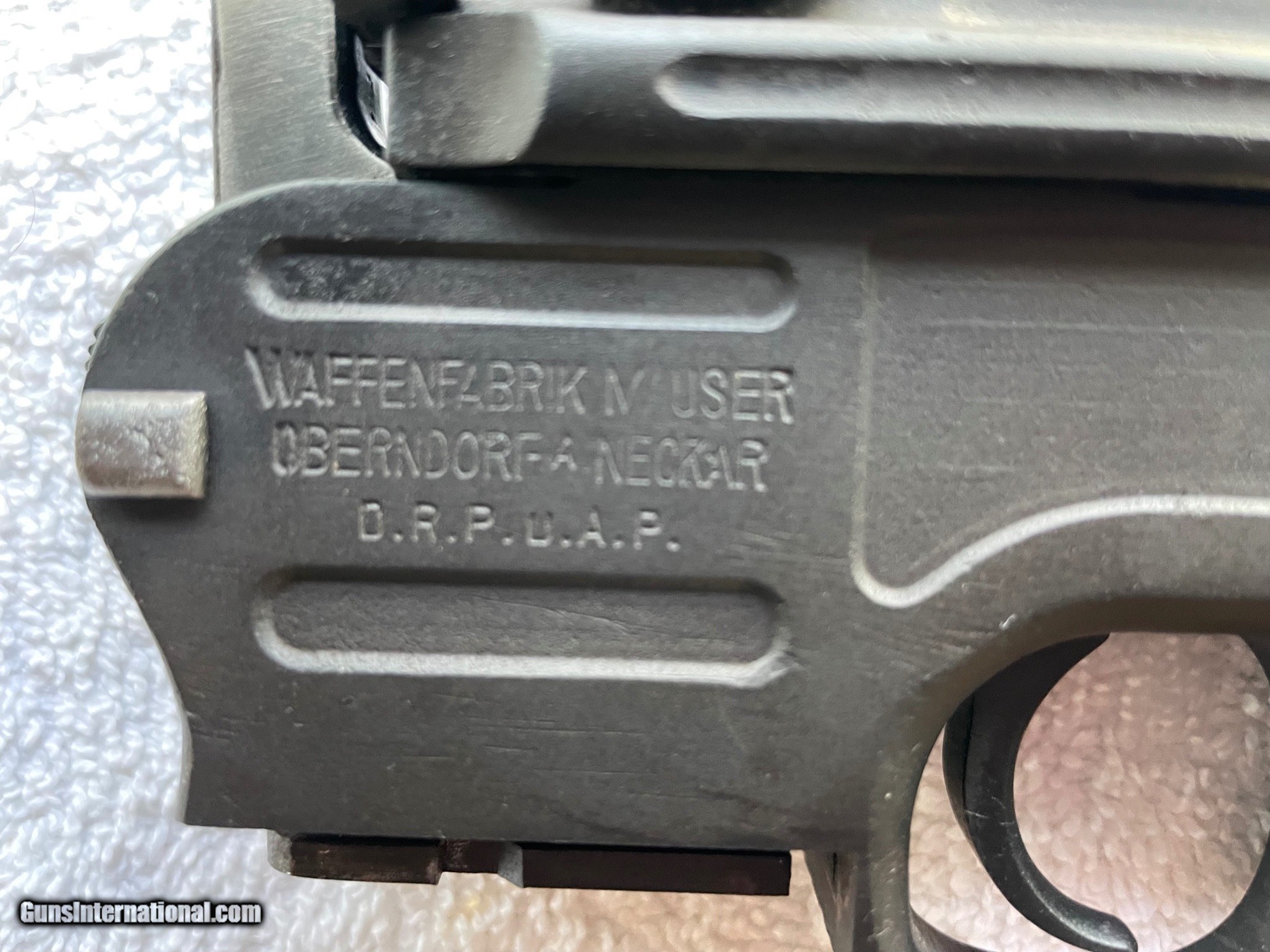Description: SCARCE MODEL C96 WAFFENFABRIKE MAUSER 1930'S SEMI-AUTO CARBINE,16" BRL SMALL RING HAMMER CAL. 7.63X25, LADDER SIGHTS 50-1000 METERS THIS MODEL, MADE FROM A 1930'S COMMERCIAL MODEL MAUSER.. IT HAS A MAUSER BANNER ON LEFT SIDE OF FRAME, WITH MATCHING SN'S STAMPED BELOW THAT. CHAMBER IS MARKED WITH 3 LINE ADDRESS, WAFFENFABRIKE MAUSER OBERNDORF A/N. LEFT SIDE OF RECEIVER IS STAMPED WAFFENFABRIKEMAUSER OBERNDORF A NECKAR, D.R.P.U.A.P. (NO OTHER MANUFACTURER MARKINGS) METAL COMPONENTS ARE FLAT GRAY RUST BLUED RATING 98% WITH AREAS OF RUST PITTING UNDER FINISH. THE WOOD STOCKS ARE EXCELLENT, THE STOCK IS REMOVED FOR TAKE-DOWN STORAGE BY PUSHING A SPRING LOADED BUTTON LOCATED ON THE LEFT SIDE OF THE MOUNTING BRACKET, STOCK SLIDES APART FROM THE DOVETAILED SLOT. INTEGRAL BOX MAG. EXCELLENT BORE, BLACK RUBBER RECOIL PAD, SLING SWIVELS. A VERY UNIQUE AND RARE, RESTORED, MAUSER BROOMHANDLE CARBINE VARIATION, WHICH IS HIGHLY COLLECTABLE. SOLD Curio/Relic: Yes Rifle Caliber: 7.63x25mm Mauser Handgun Caliber: 7.63x25mm Mauser (30 Mauser) Manufacturer: mauser Model: C96 Serial Number: 2412 Barrel Length: 16 Bore: GOOD Wood Condition: EXCELLENT Bore Condition: GOOD Action: SEMIAUTO Stock: REMOVABLE Finish: BLACK Manufacture Date: 1930'S Item Location: DALLAS,OREGON |