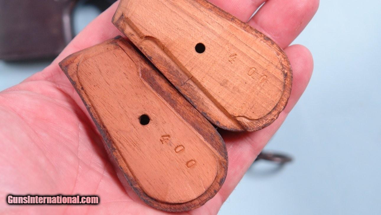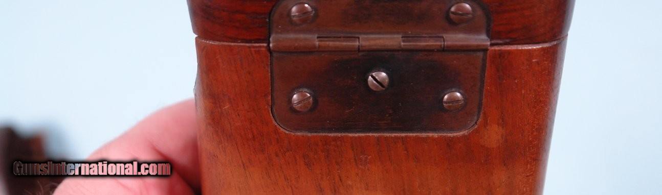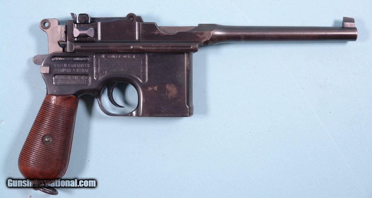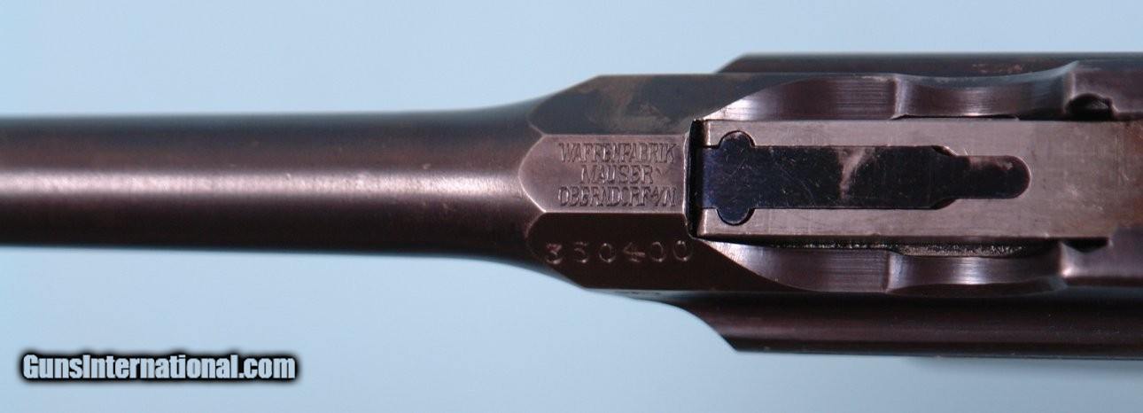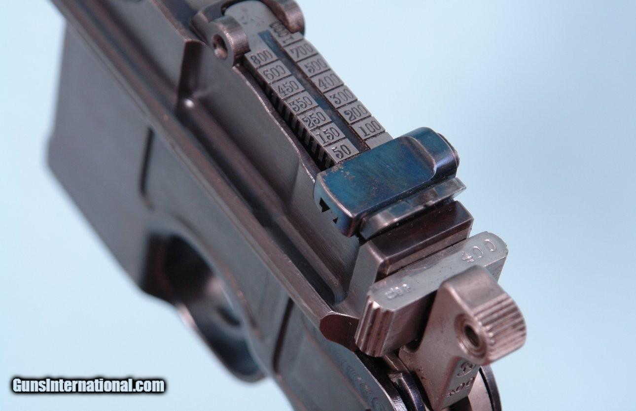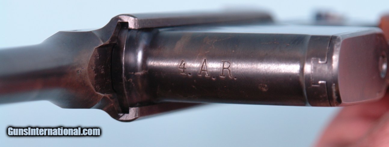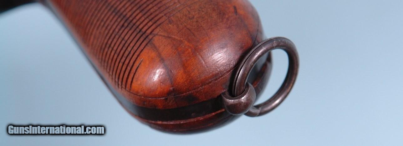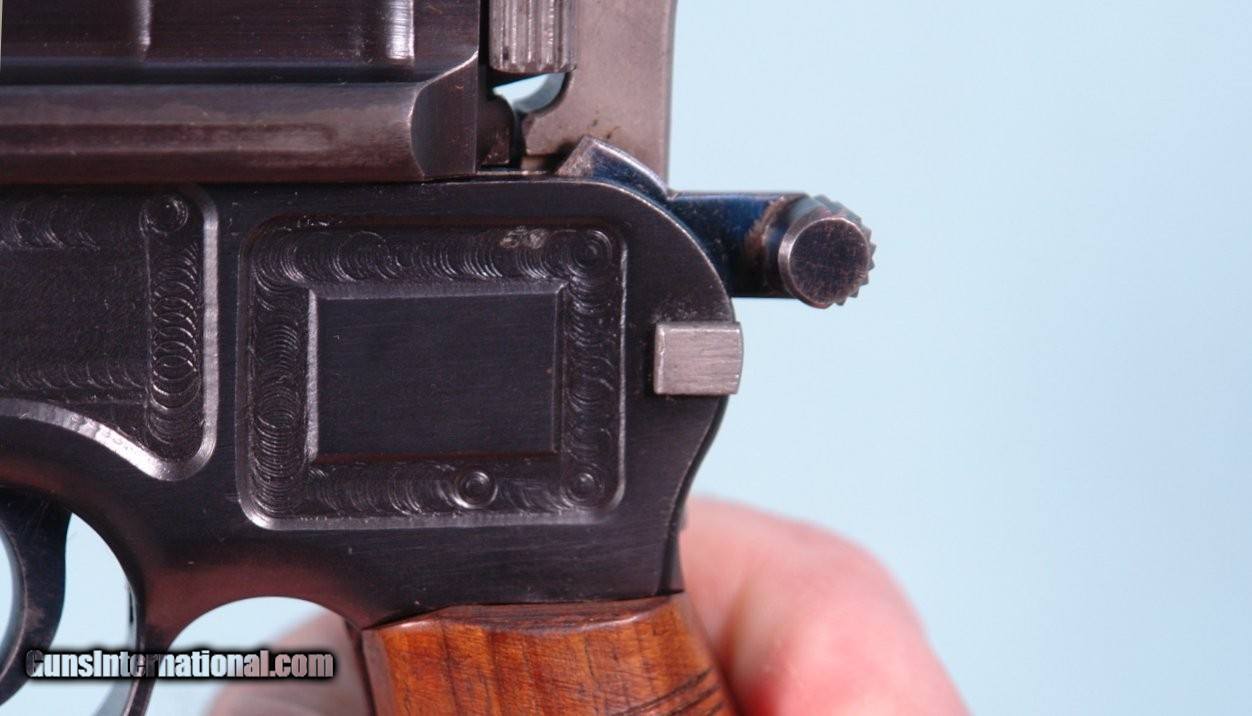 Description: WW1 WWI IMPERIAL GERMAN MAUSER C96 7.63X25 BROOMHANDLE PISTOL 4TH ARTILLERY REGT. MARKED WITH MATCHING STOCK & HARNESS CA. 1918. Original all matching (350,xxx range) Broomhandle with Imperial German Ordnance acceptance stamp on right chamber flat. Regiment stamp on front of magazine well “4. A. R.” for 4 th Artillery Regiment. Shoulder stock holster with matching serial number stamp on yolk. Leather harness maker stamped “ALF. BUHLER/STUTTGART/1918” with Ordnance stamps. Original cleaning rod and extra magazine spring.Excellent with most of the blue and finish on the grips (also numbered on underside with last three digits of serial number. Perfect working order and very near mint bore. Superior example. SOLD Curio/Relic: Yes Handgun Caliber: 7.63x25mm Mauser (30 Mauser) |