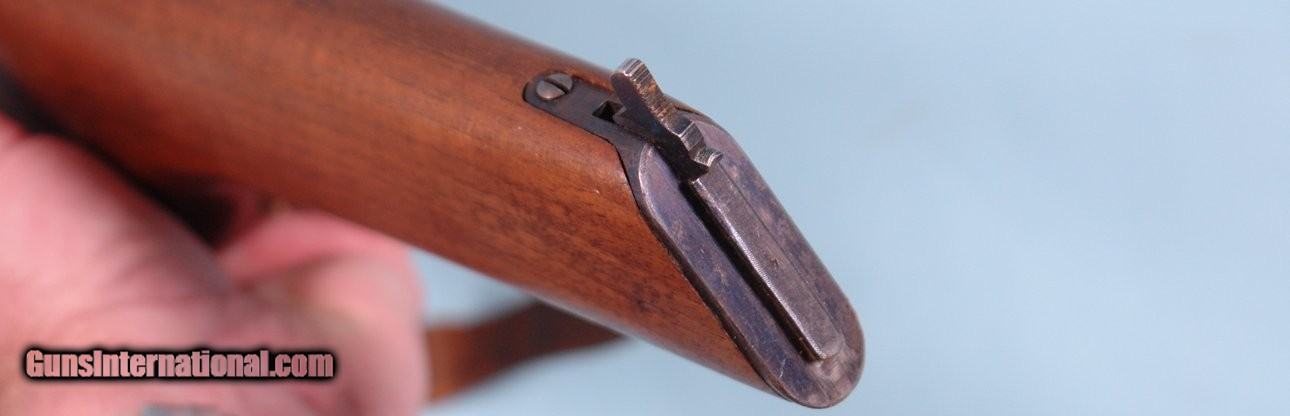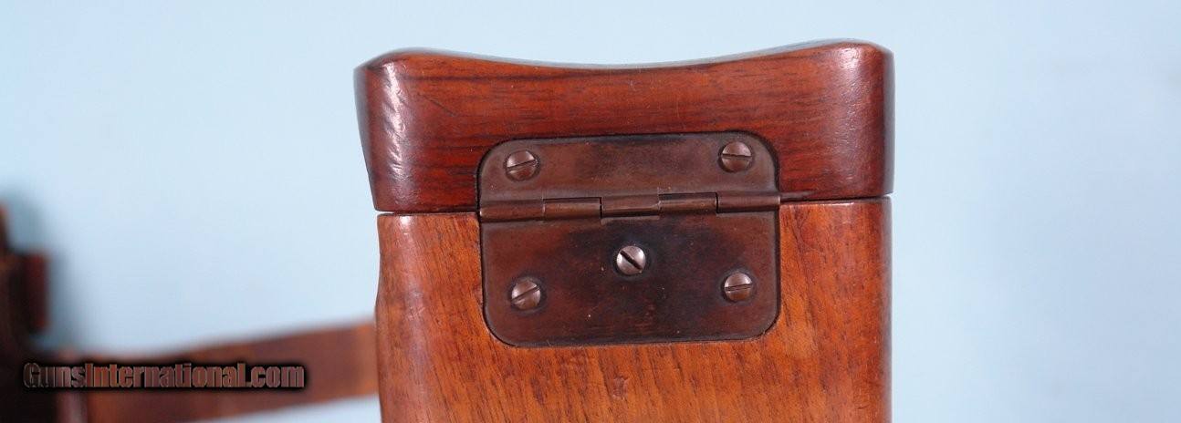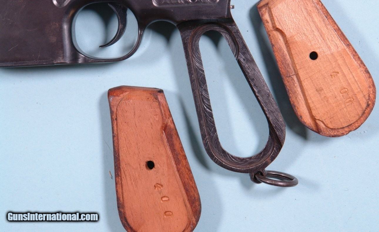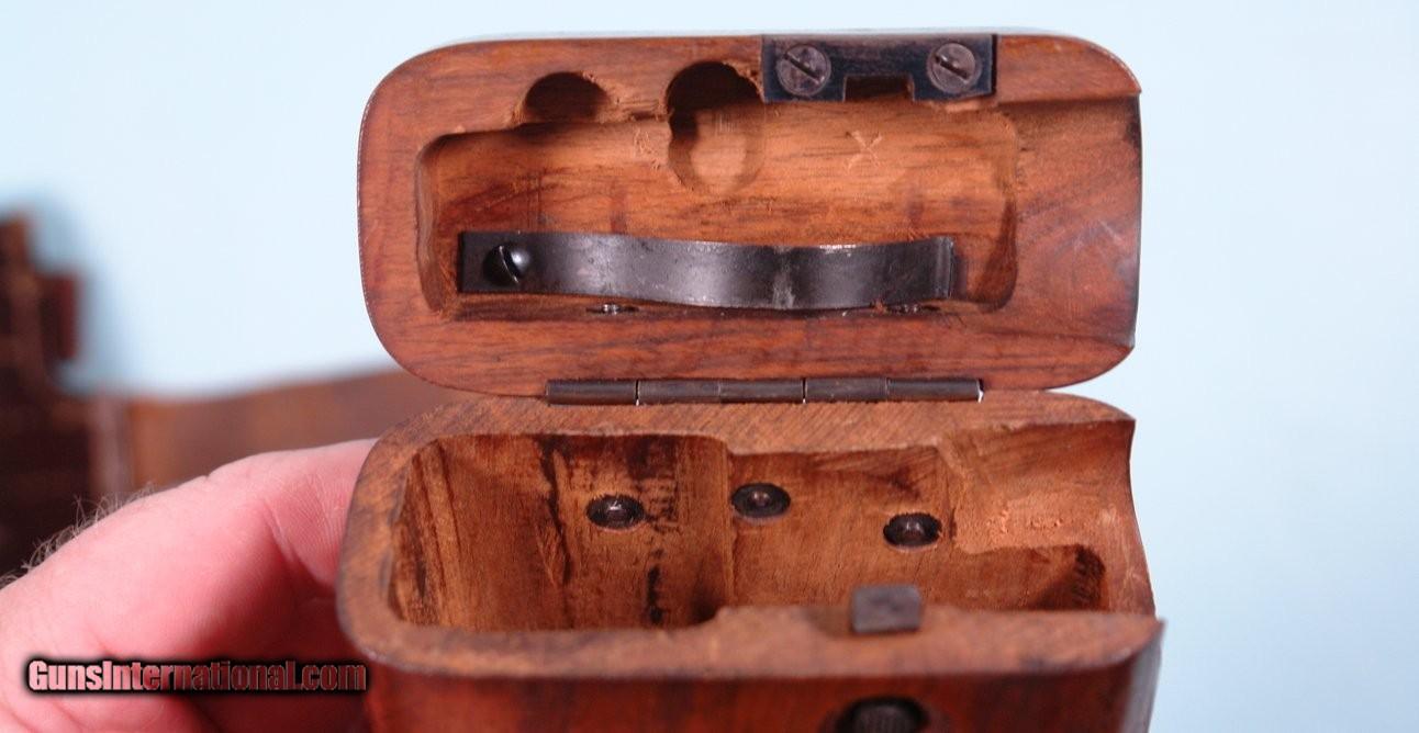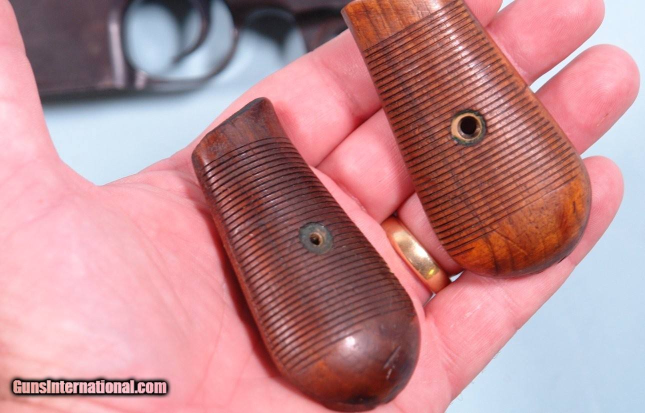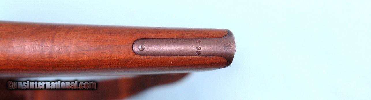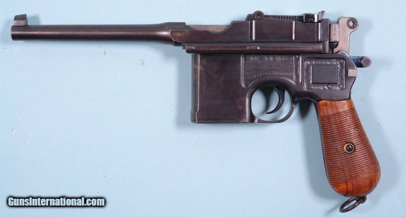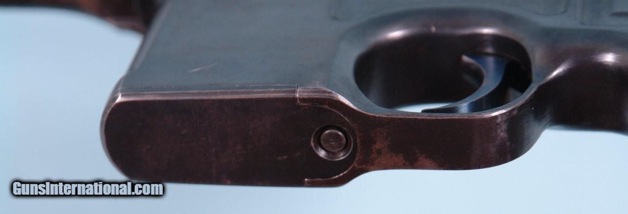 Description: WW1 WWI IMPERIAL GERMAN MAUSER C96 7.63X25 BROOMHANDLE PISTOL 4TH ARTILLERY REGT. MARKED WITH MATCHING STOCK & HARNESS CA. 1918. Original all matching (350,xxx range) Broomhandle with Imperial German Ordnance acceptance stamp on right chamber flat. Regiment stamp on front of magazine well “4. A. R.” for 4 th Artillery Regiment. Shoulder stock holster with matching serial number stamp on yolk. Leather harness maker stamped “ALF. BUHLER/STUTTGART/1918” with Ordnance stamps. Original cleaning rod and extra magazine spring.Excellent with most of the blue and finish on the grips (also numbered on underside with last three digits of serial number. Perfect working order and very near mint bore. Superior example. SOLD Curio/Relic: Yes Handgun Caliber: 7.63x25mm Mauser (30 Mauser) |