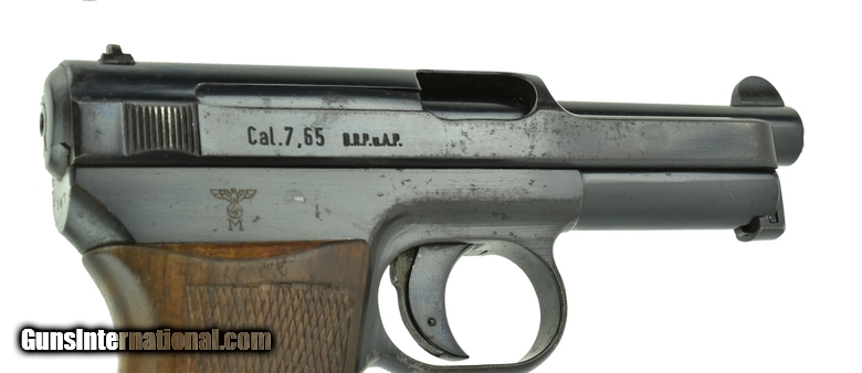 Mauser 1934 7.65mm caliber pistol. Naval Issue. Eagle M marked on frame (Marinen). Front grip strap marked “04362” and Mauser banner magazine also marked “04362”. Action works perfectly. Bore is excellent. Gun has approximately 92-93% blue with some very light speckling on the left side of the pistol. Grips are very good showing handling wear. Scarce Navy Model 1934 for the Eastern Fleet (“O” with property number) O for OST or Eastern. In our experience over 50 years the Fleet property number is seldom marked on the pistol and the correct numbered magazine is very rare.