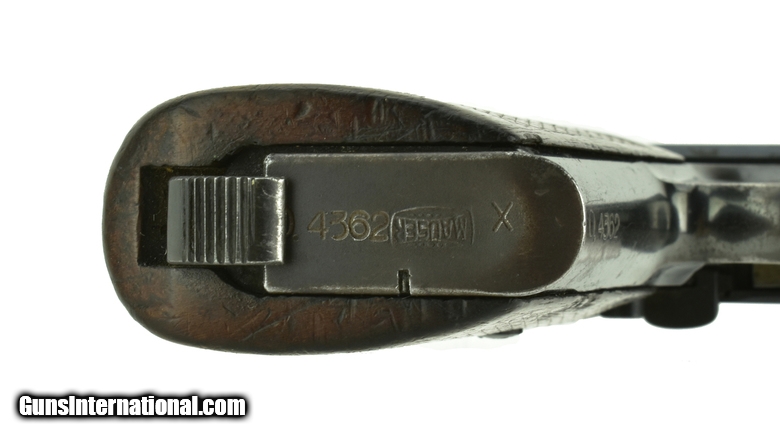 Description: Mauser 1934 7.65mm caliber pistol. Naval Issue. Eagle M marked on frame (Marinen). Front grip strap marked “04362” and Mauser banner magazine also marked “04362”. Action works perfectly. Bore is excellent. Gun has approximately 92-93% blue with some very light speckling on the left side of the pistol. Grips are very good showing handling wear. Scarce Navy Model 1934 for the Eastern Fleet (“O” with property number) O for OST or Eastern. In our experience over 50 years the Fleet property number is seldom marked on the pistol and the correct numbered magazine is very rare.