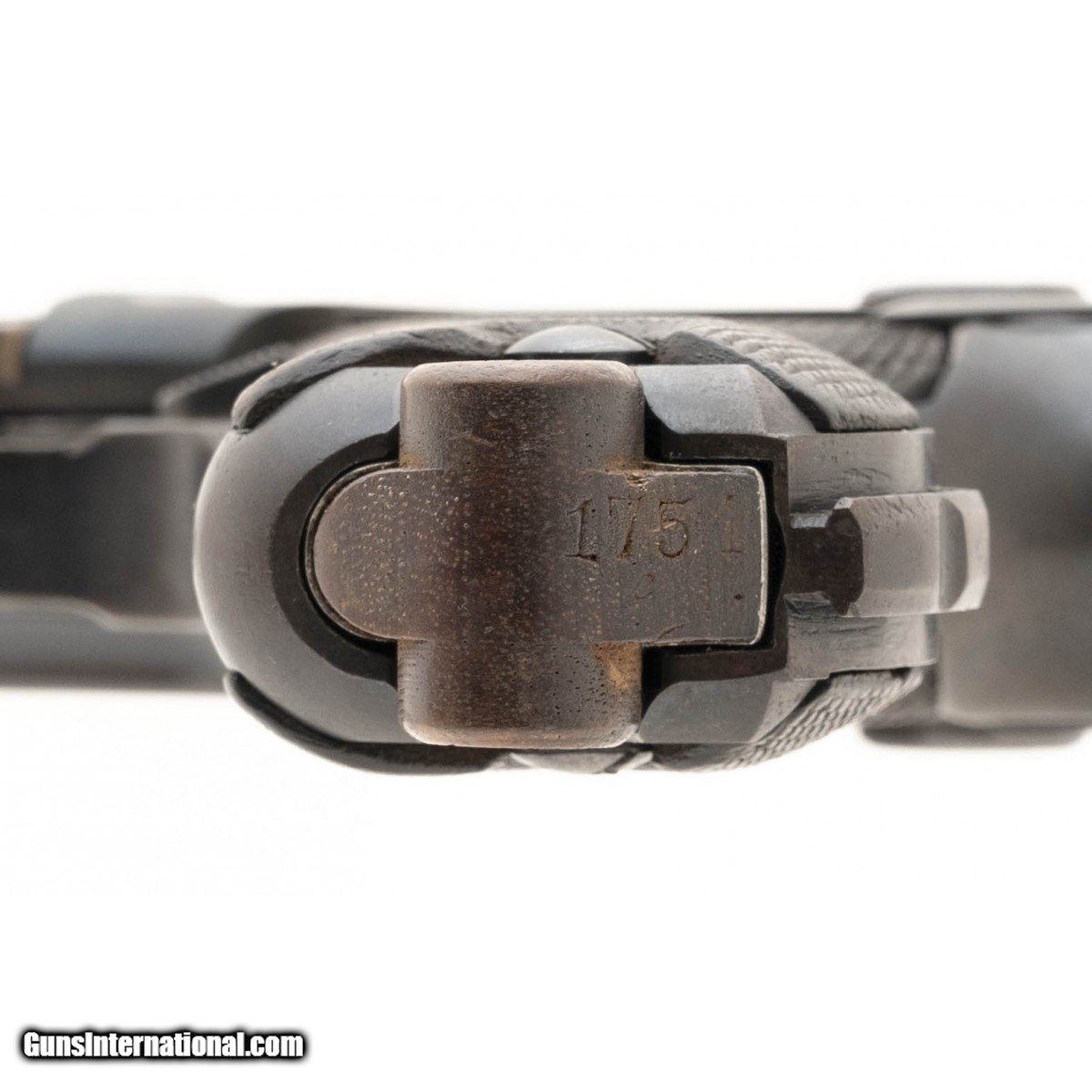 Description: " BYF Code luger manufactured in 1942. The bore is excellent and the action works perfectly. The grips are very good with chips or cracks, and only light wear. This luger does have some unnumbered parts which include the side plate and firing pin. The trigger and takedown lever have good straw colors and is also unnumbered. Overall this is a very good looking pistol with approximately 95% of its blue. SOLD Curio/Relic: Yes |