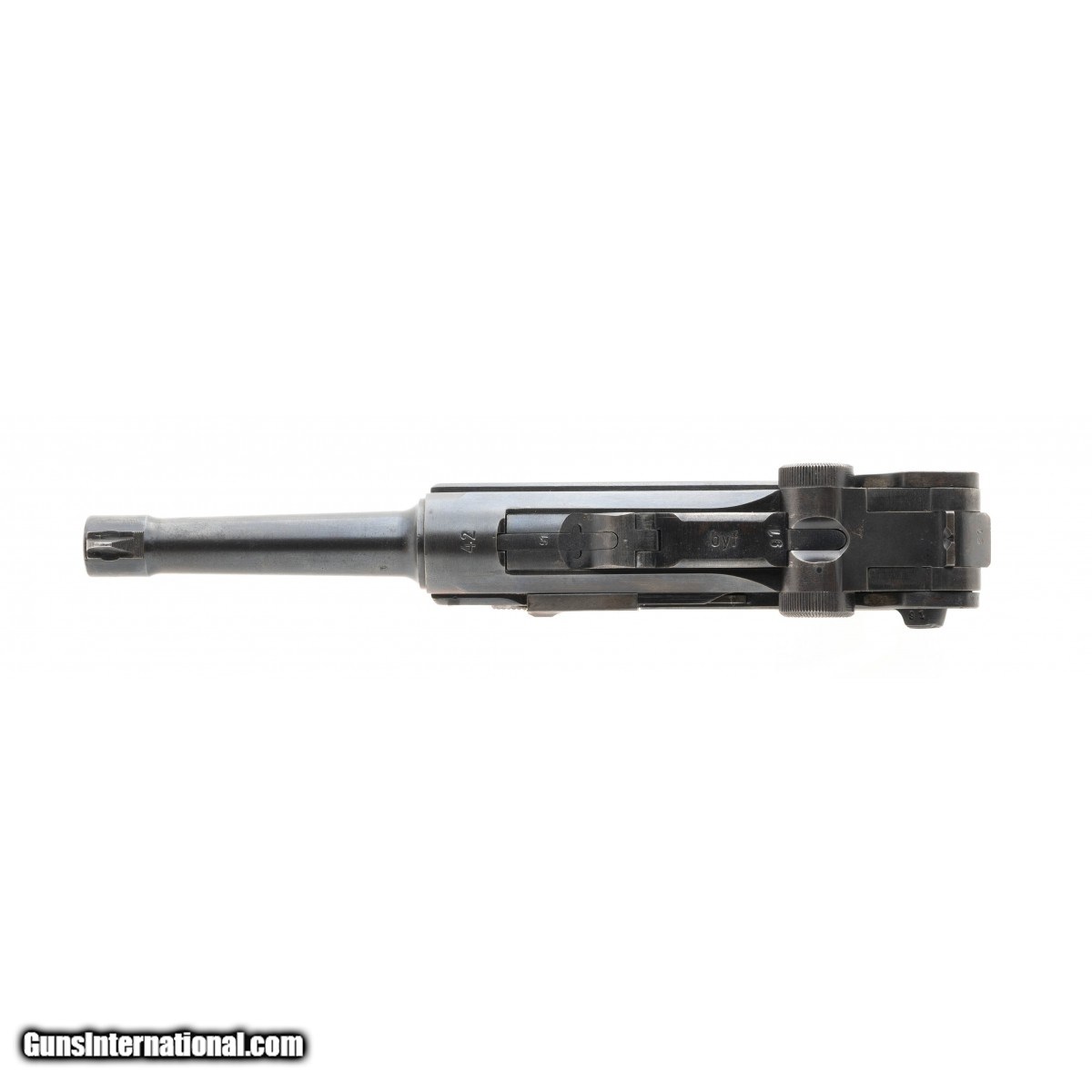 BYF Code luger manufactured in 1942. The bore is excellent and the action works perfectly. The grips are very good with chips or cracks, and only light wear. This luger does have some unnumbered parts which include the side plate and firing pin. The trigger and takedown lever have good straw colors and is also unnumbered. Overall this is a very good looking pistol with approximately 95% of its blue.