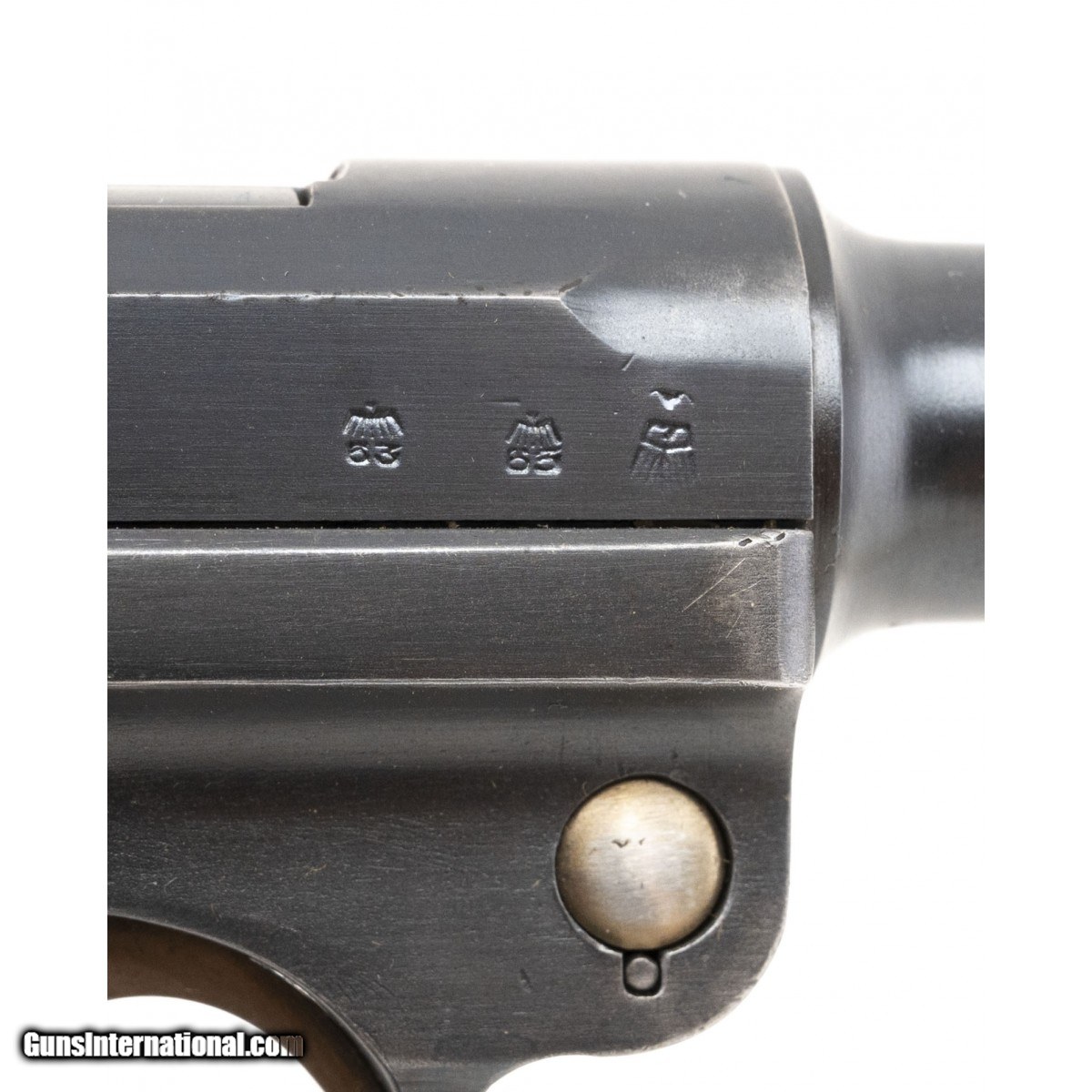 Description: " This G date (1935) S/42 (Mauser) Police Luger has the late eagle over 63 acceptance marks. It also has the police sear safety spring. The 4"" 9mm barrel has an excellent bore with bright, strong rifling. The full serial number 1409f (less the f) is found on the bottom of the barrel, the front of the frame (with the f), Haenel Schmeisser magazine (with a 1) and the left side of the receiver. The last two digits, 09, are on the small parts. The firing pin and grips are not numbered. The gun retains approx. 98% blue and 90% straw finish. The grips are fine with light wear. The action functions correctly. The holster is fine with intact stitching. The takecdown tool tab has broken through its flap. It is marked FRANZ COBAU over BERLIN over 1935 with a sunburst symbol with what appears to be a K in the center below the maker's marking. The numbers, 9532, are on the top right rear. A like new unmarked takedown tool and spare mismatched Hanel Schmeisser magazine complete the rig. This is a great Luger police rig, especially given the matching magazine and 1935 holster. SOLD Curio/Relic: Yes |