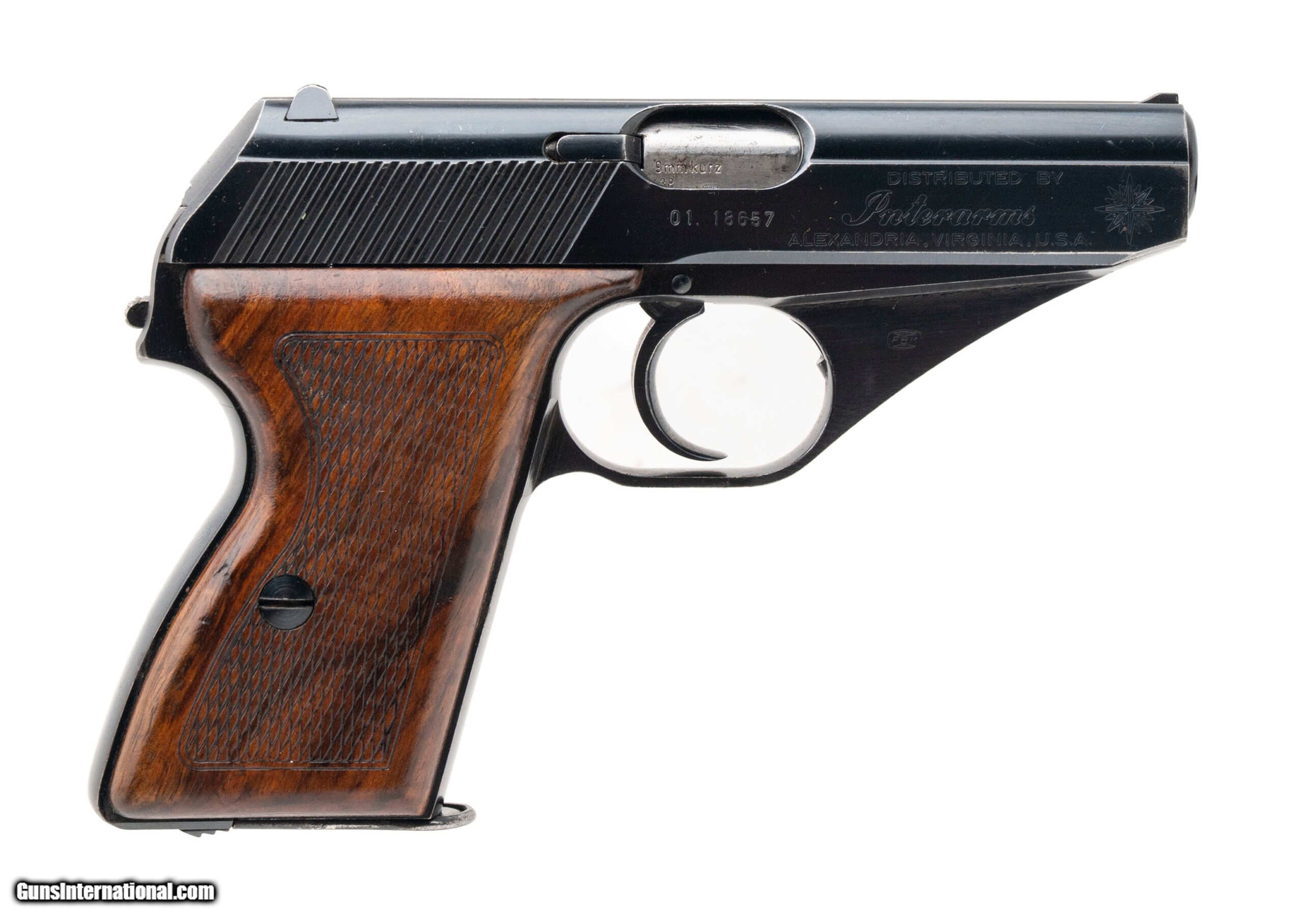 Description: "SN: 0118657. Made circa 1960s, .380 Auto with a 3.3"" barrel. Bore is bright with strong rifling. German made steel frame double action only pistol. Blued finish is in good condition. Checkered wood grips are in very good condition. Overall condition is good. (Consignment) SOLD |