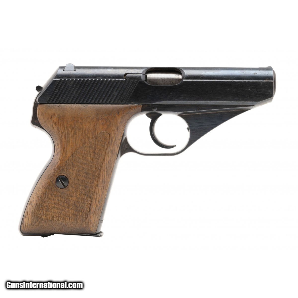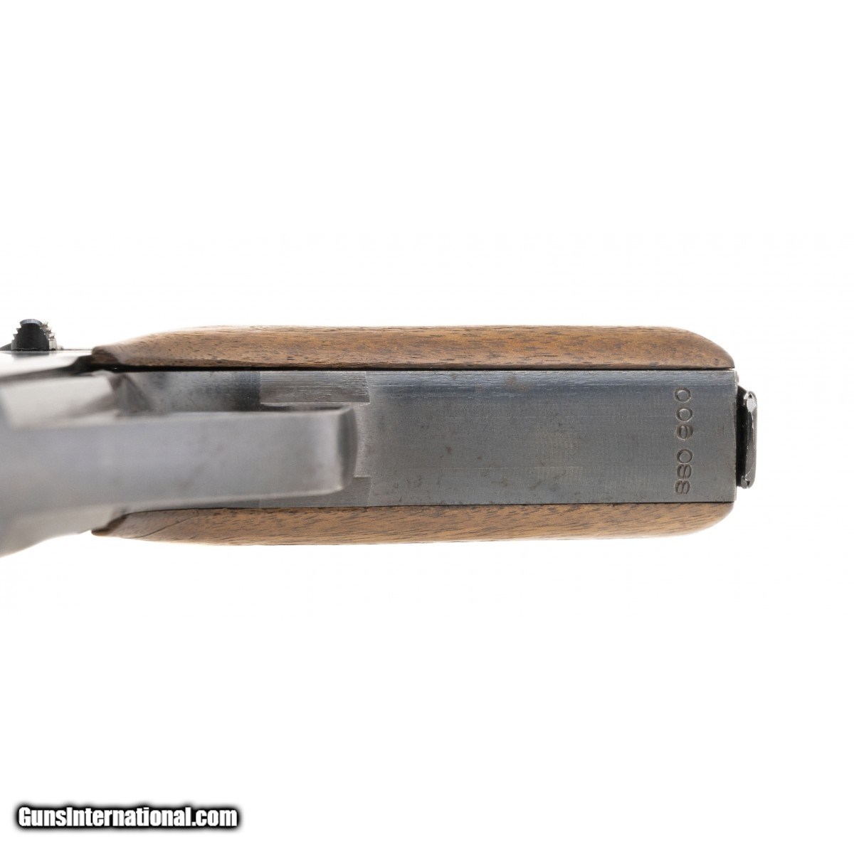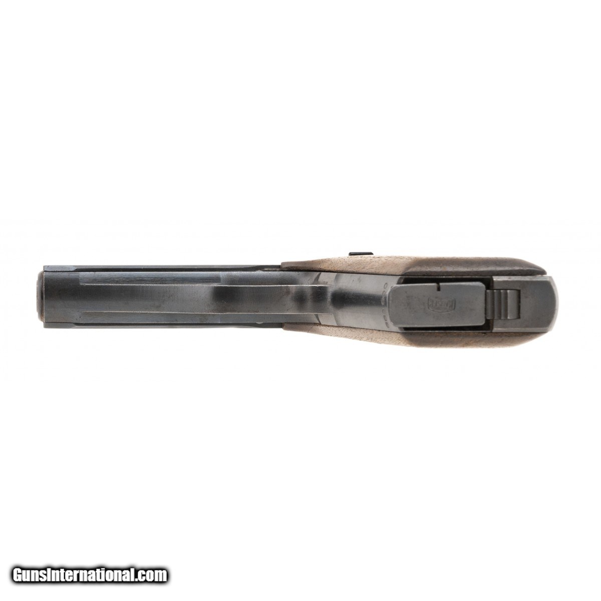 The 7.65mm (32ACP) Mauser HSc WWII military manufacture Swiss commercial pistols fall in the 800,000 to 900,000 serial number range. This pistol is serial number 880,900. It has an excellent bore with bright, strong rifling and retains approx.92% wartime blue finish with some freckling. The lefft side of the slide is marked with the Mauser oval logo followed by Mauser-Werke A.G. Oberndorf a.N. over Mod. HSc followed by three parallel lines followed by Kal. 7,65 mm. The trigger guard bow has the eagle over N commercial proof. The checkered wood grips are very good with the left panel showing light wear. The magazine has the correct Mauser logo on the base. The action functions correctly. Don't miss this scarce pistol!