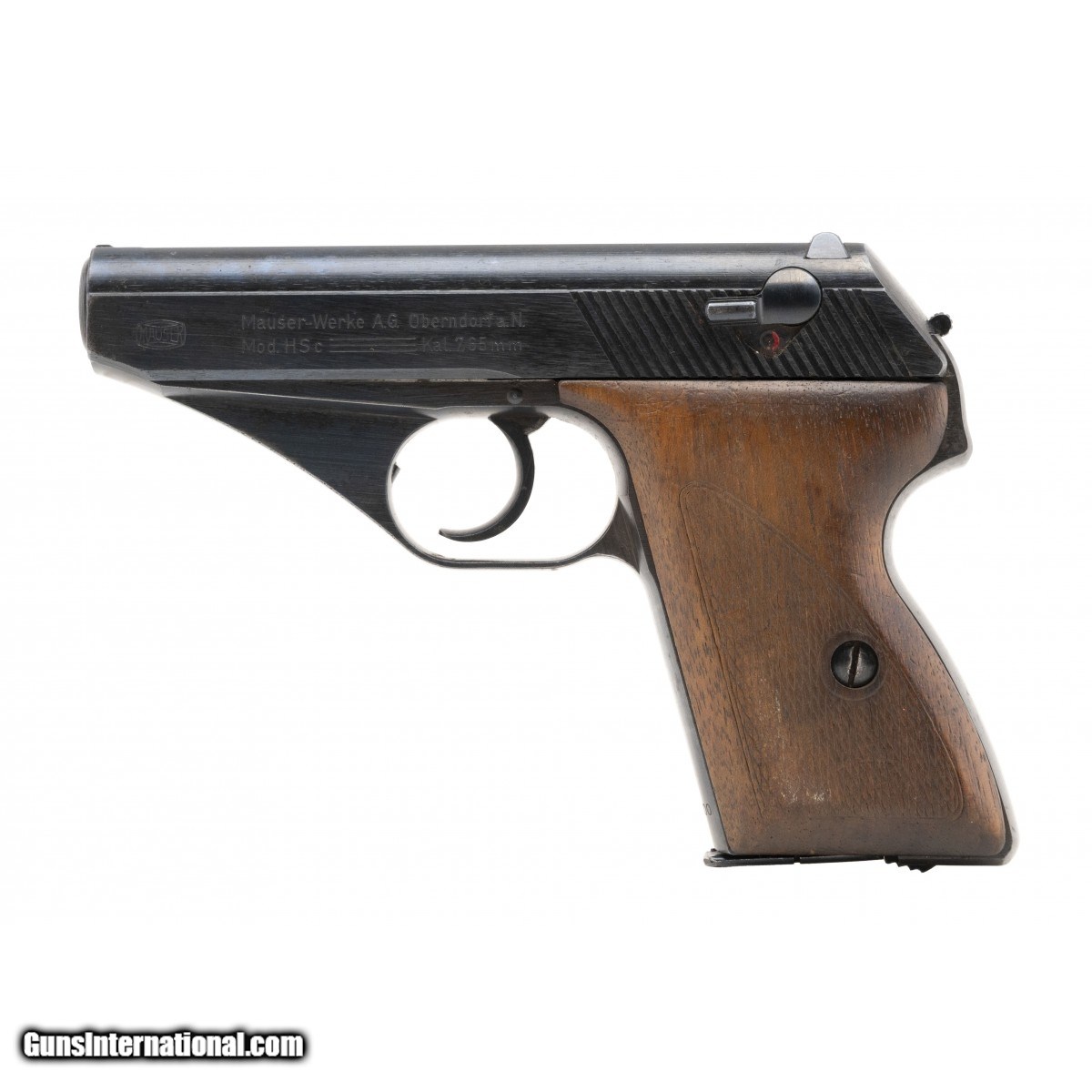 Description: " The 7.65mm (32ACP) Mauser HSc WWII military manufacture Swiss commercial pistols fall in the 800,000 to 900,000 serial number range. This pistol is serial number 880,900. It has an excellent bore with bright, strong rifling and retains approx.92% wartime blue finish with some freckling. The lefft side of the slide is marked with the Mauser oval logo followed by Mauser-Werke A.G. Oberndorf a.N. over Mod. HSc followed by three parallel lines followed by Kal. 7,65 mm. The trigger guard bow has the eagle over N commercial proof. The checkered wood grips are very good with the left panel showing light wear. The magazine has the correct Mauser logo on the base. The action functions correctly. Don't miss this scarce pistol! SOLD |