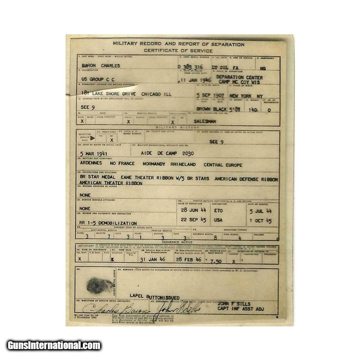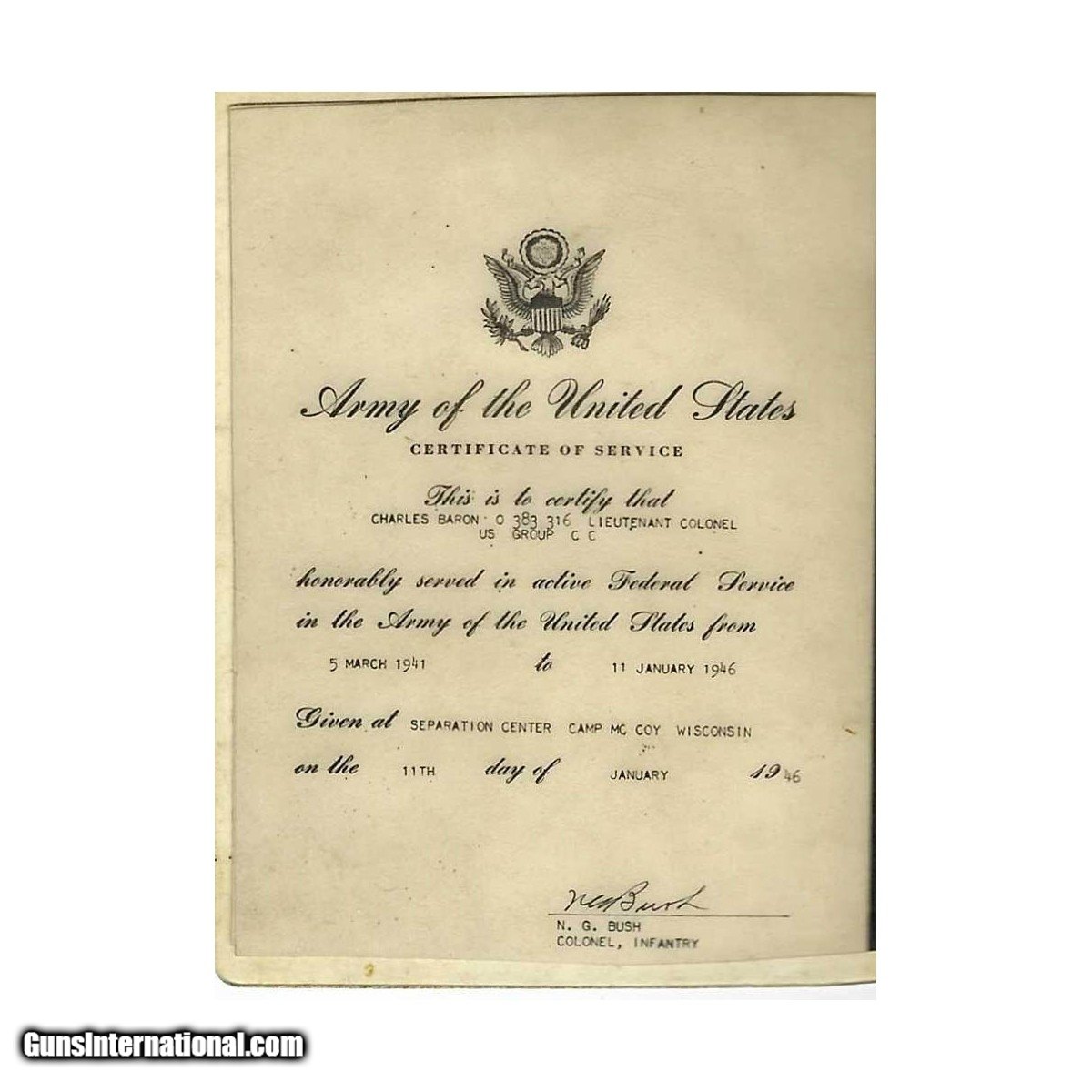Description: "Serial number 6702B. Made in 1943, 9mm with a 5" barrel. Excellent condition with 97% of the original blued finish. The right hand side of the frame is inscribed “Brig. Gen. Charles Baron/ U. S. Army 0383316" This gun comes with a laminated certificate of service card for General Charles Baron. General Baron was a larger than life character who lived in Las Vegas, had connections to the mob and was a casino owner among other things. He had a large gun collection and had almost every single one of them inscribed with his name. SOLD Curio/Relic: Yes |