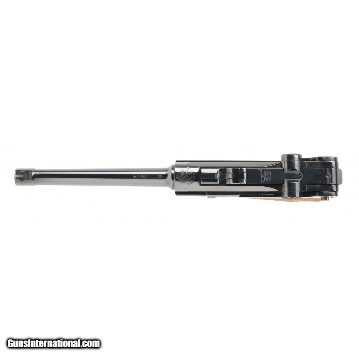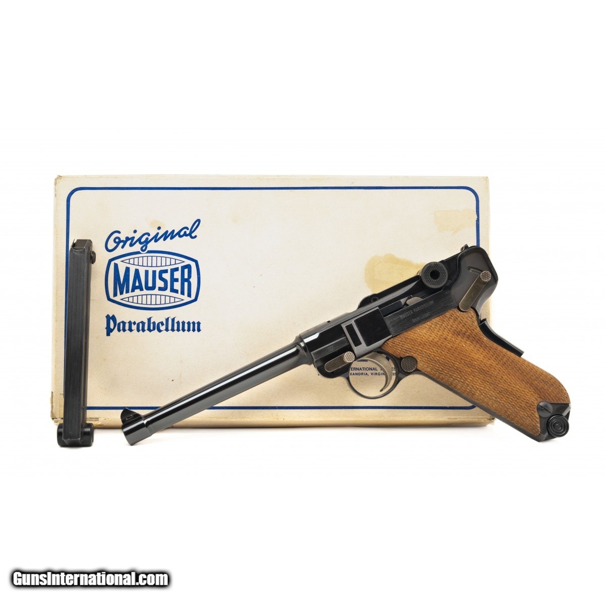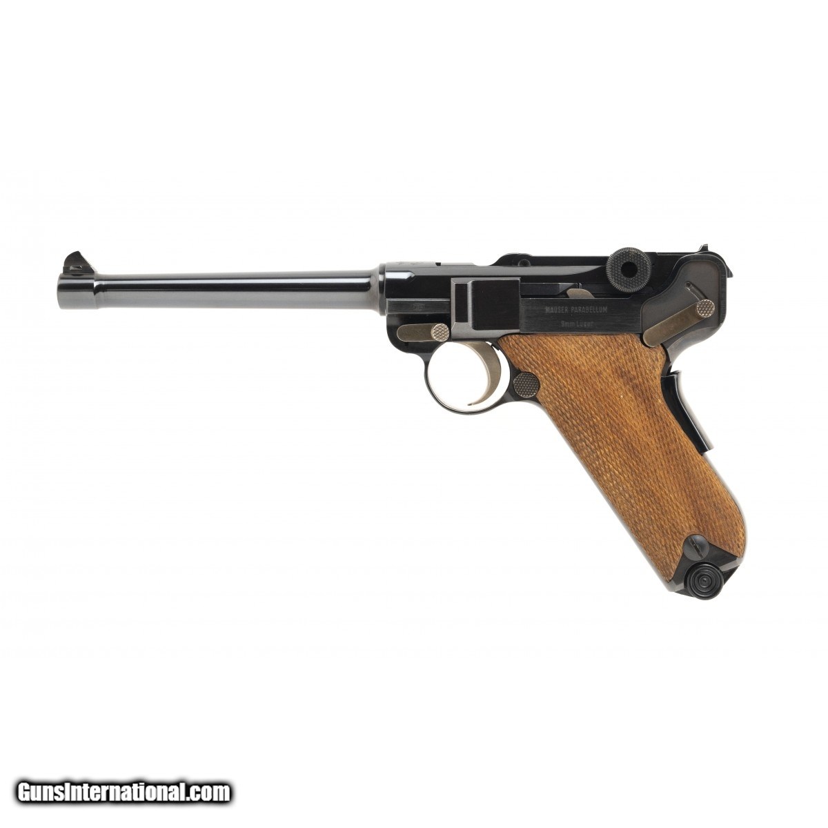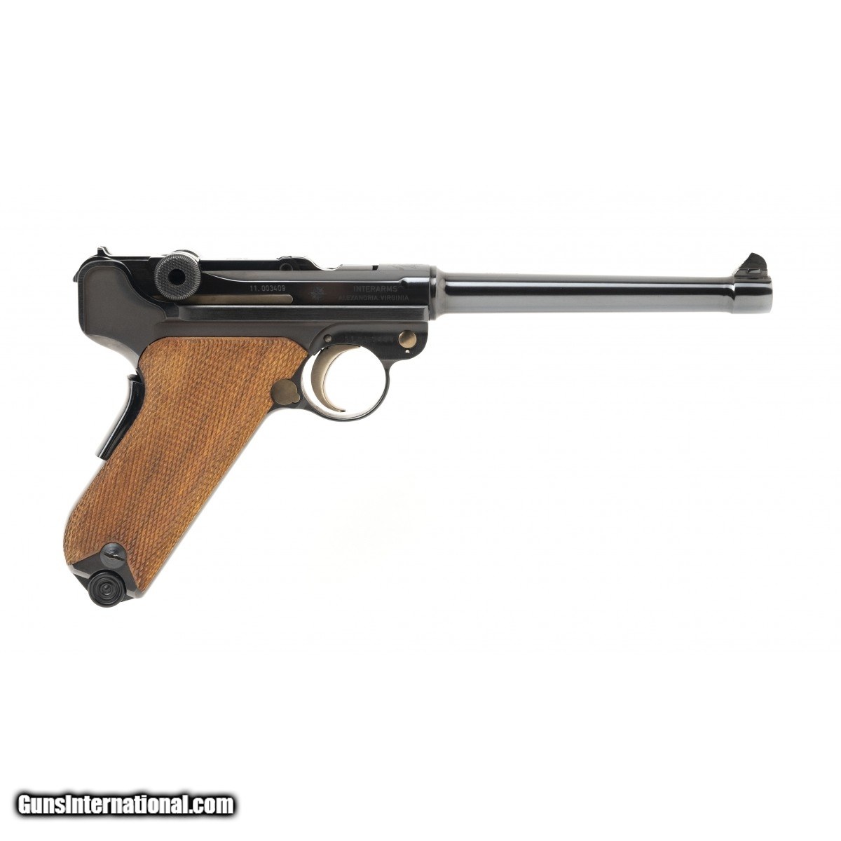 Post war commercial Luger imported by Interarms in the 1970's. Beautiful high luster blue model with American Eagle on chamber and 6"" barrel like the model 1900 and 1906 Lugers. Excellent condition with box and extra magazine.