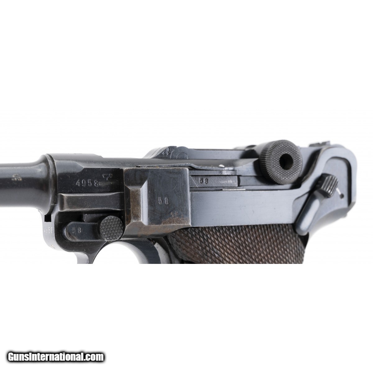Description: " Scarce Police marked variation. 1940 dated ""Mauser Banner"" Luger. Right side of slide is eagle L marked. Serial numbers are matching including the magazine. Metal has approximately 97% original blue with some patina on the side plate. Bore is excellent. Left grip has a small chip by safety. Near excellent overall condition. A desirable Police pistol. SOLD Curio/Relic: Yes |