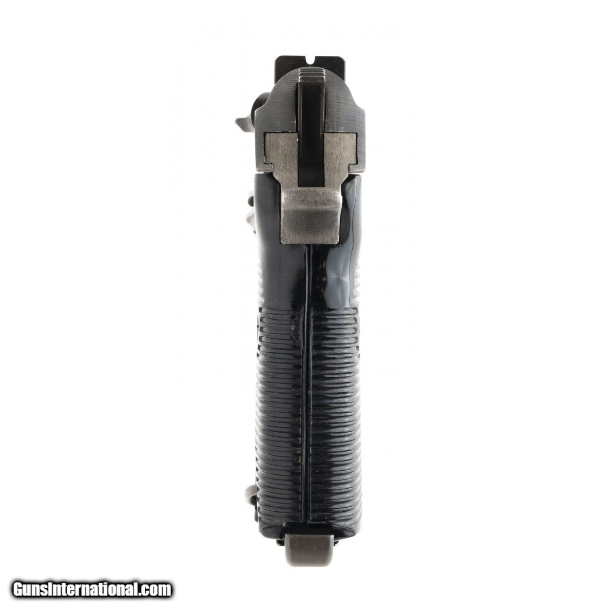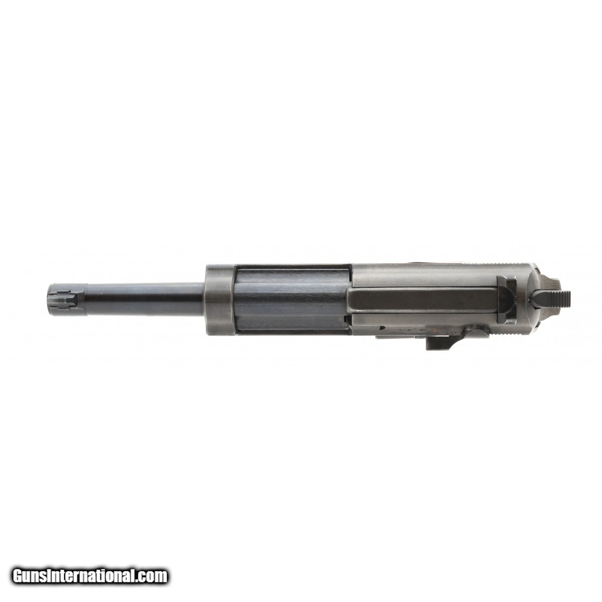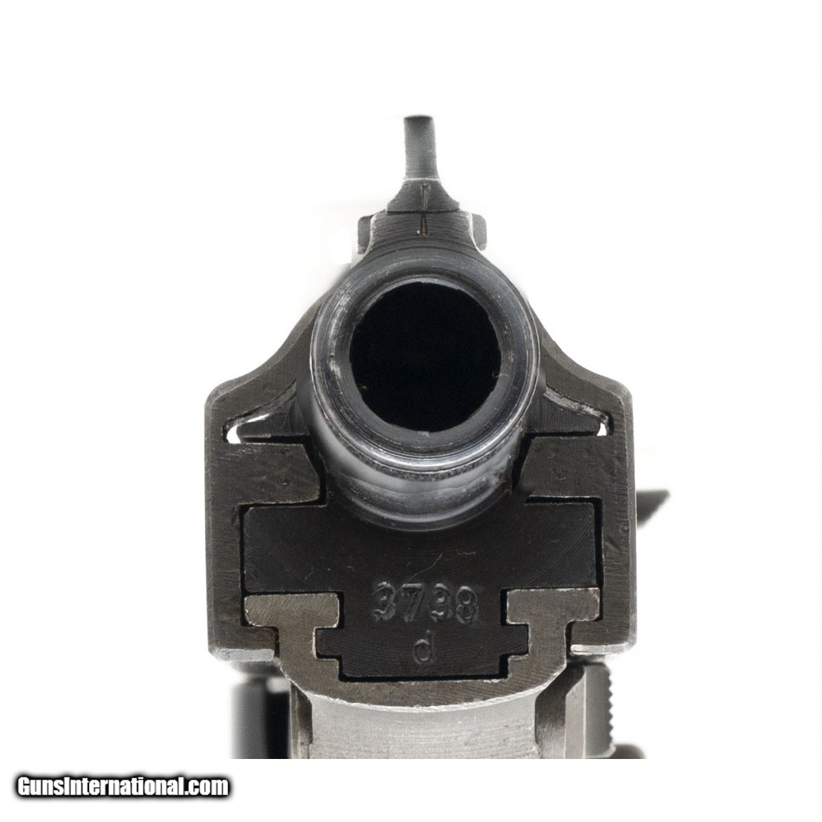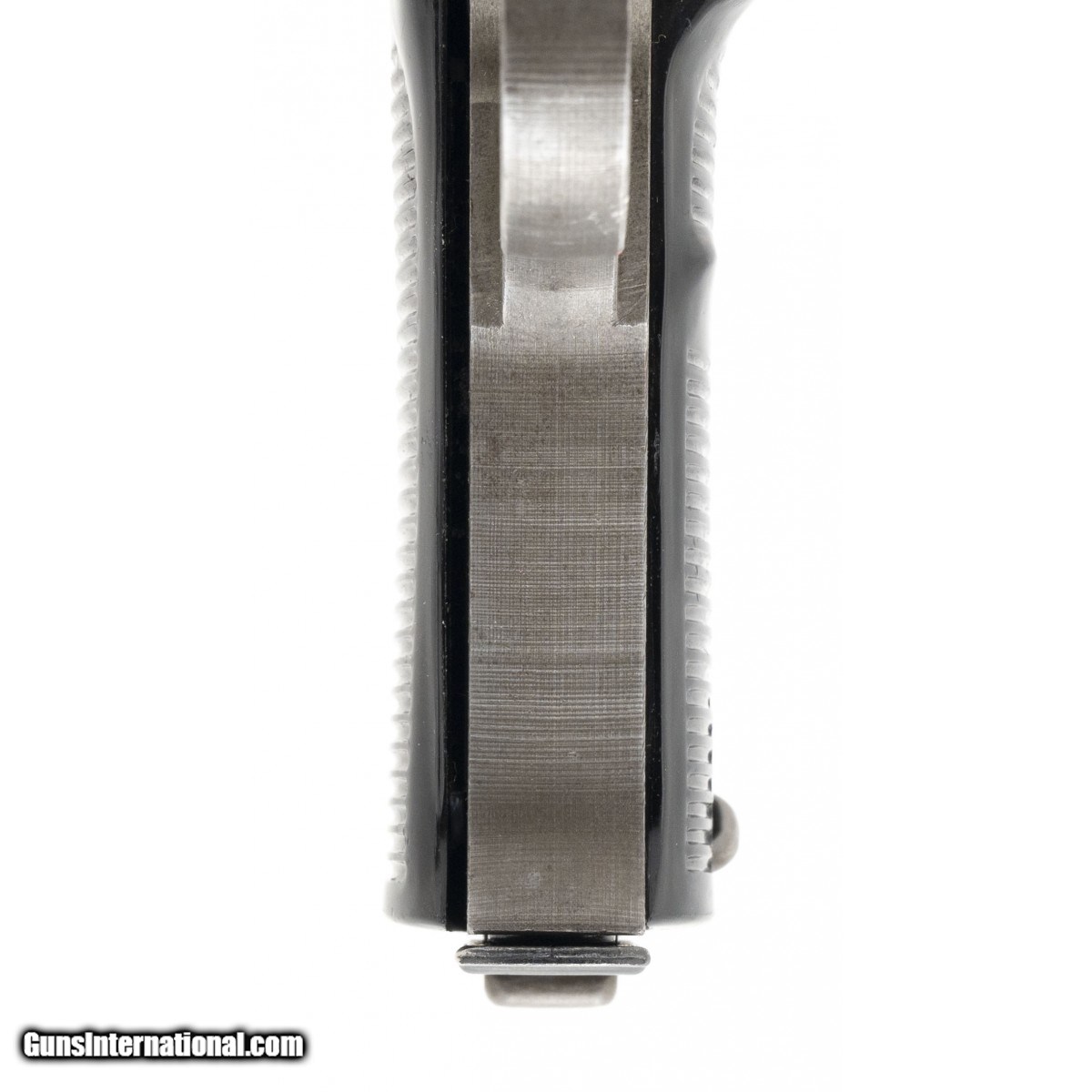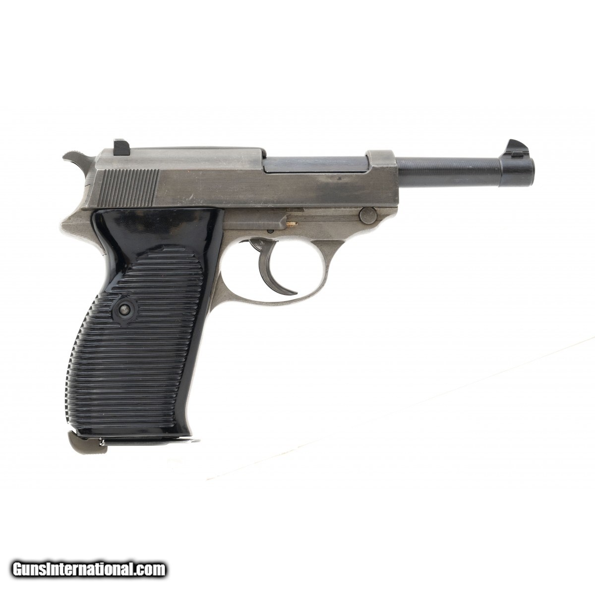 Description: " This is an excellent example of a two tone Mauser P.38 manufactured between July and December 1944.. It gets its two tone appearance from its phosphate frame and slide and a blued barrel. Collectors call these the second alphabet run, second variation. It is all matching and has the correct eagle over WaA135 military proofs. It has approx. 97% of its original phosphate and blue finish. The bore is excellent with bright, strong rifling. The unnumbered P.38 marked magazine is blued and has an eagle over WaA135 on the spine. The black plastic grips are excellent. The action functions correctly. These two tone P.38 byf 44 pistols are very hard to find in the condition that this gun is in. SOLD Curio/Relic: Yes |