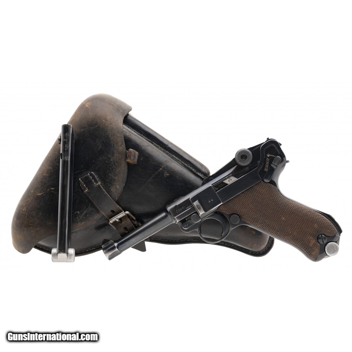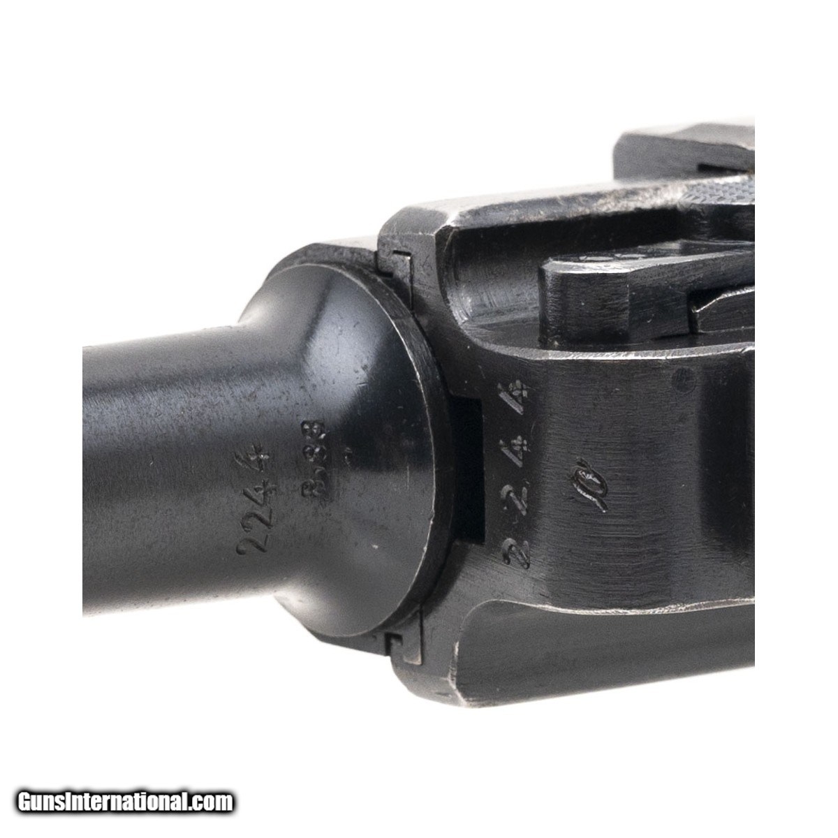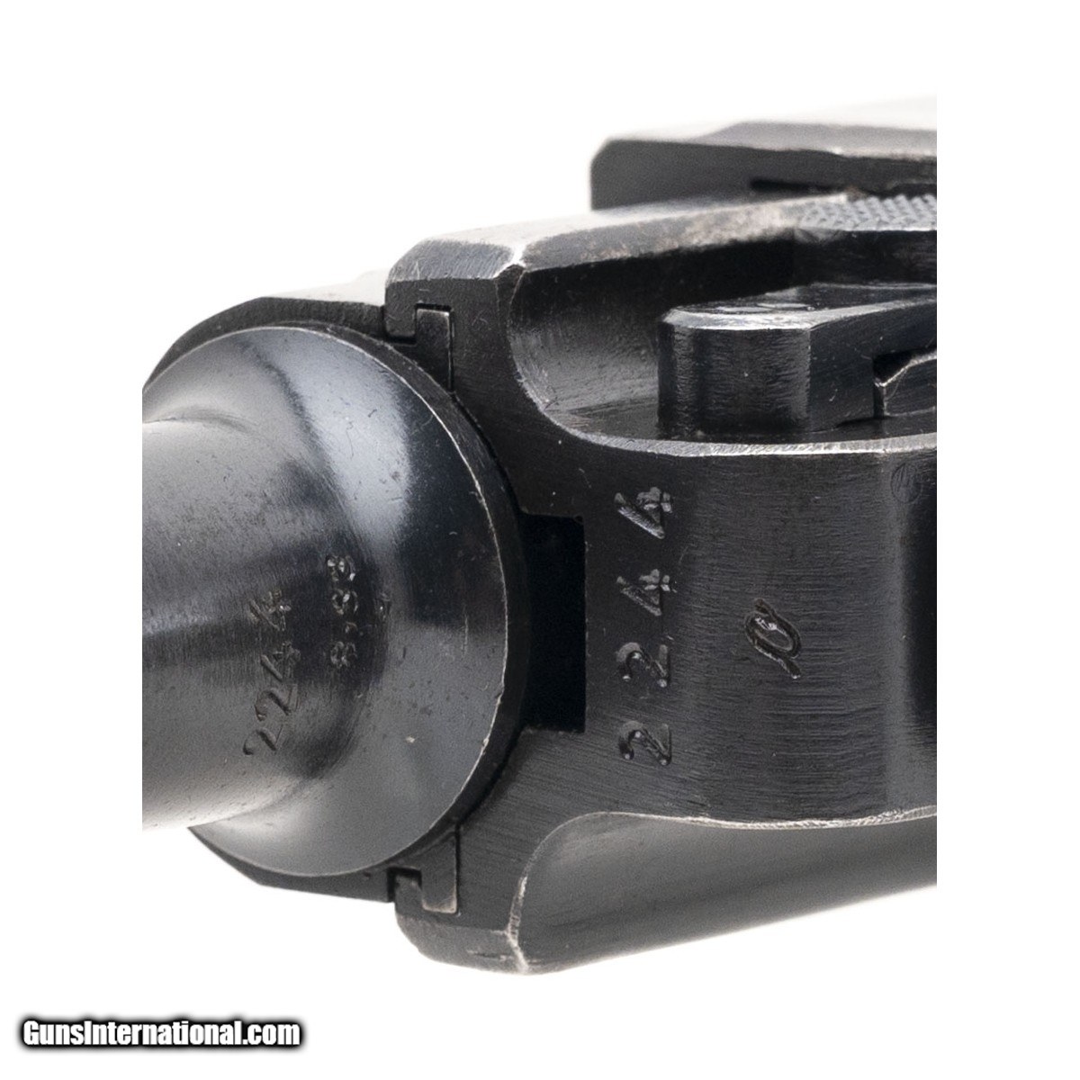 Serial No. 2244o, made in 1939, 9mm, 4"" round barrel. Finish rates 96% with thinning visible along the sharp edges. Serial numbers are matching including grips and extra magazine, left side grip has a light strike of ""4"" while the right side has a strong ""44"" . Bore is bright and shiny with strong rifling visible. Wooden checkered grips show very light handling wear, texture is crips. Holster is overall very good plus condition with minor wear visible, take down tool is included inside with extra matching magazine!