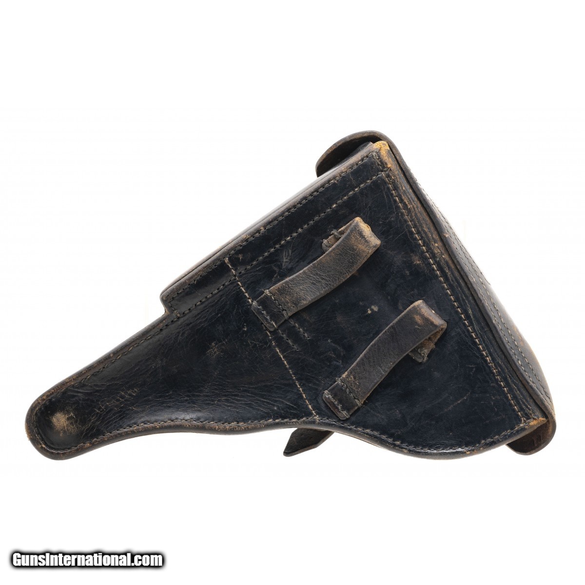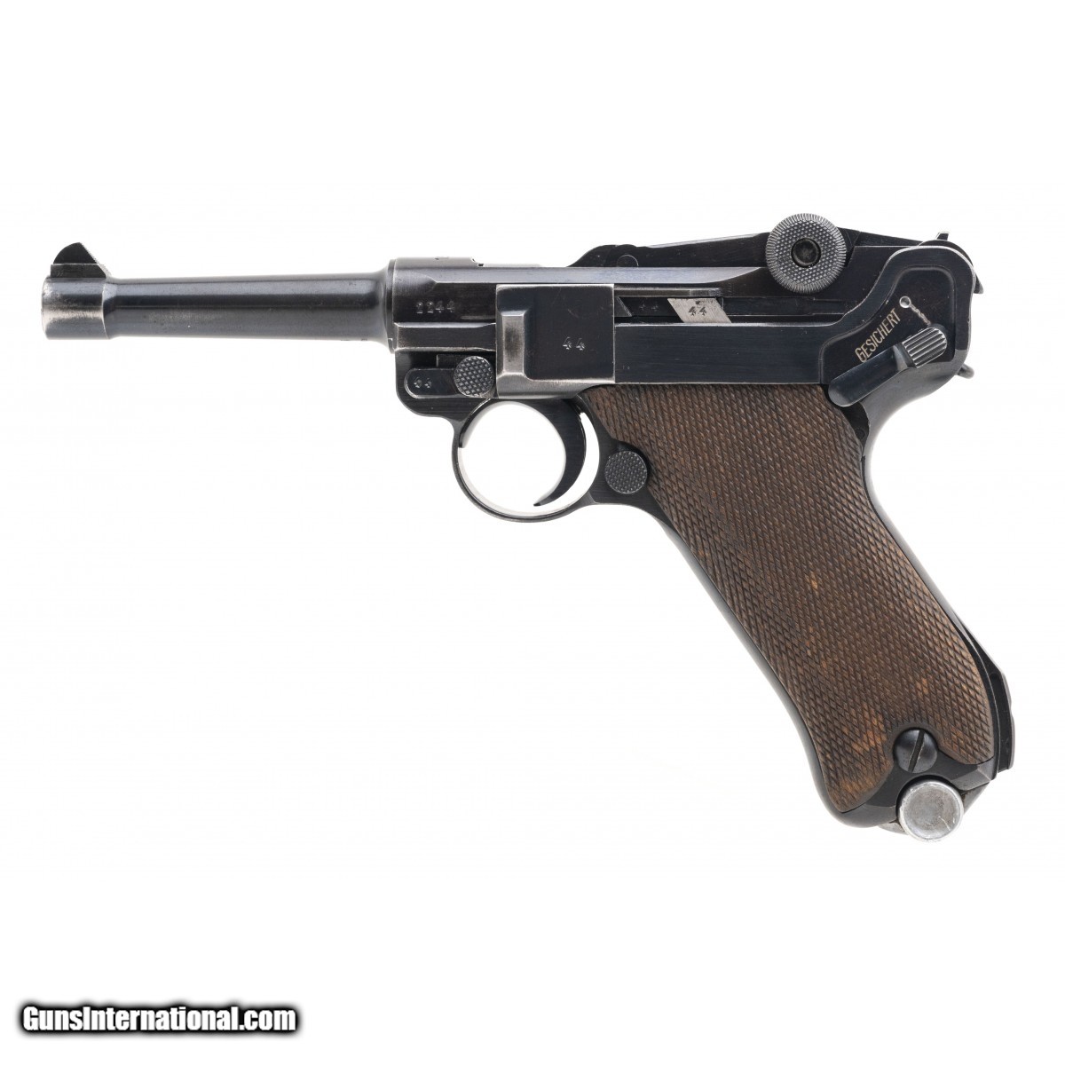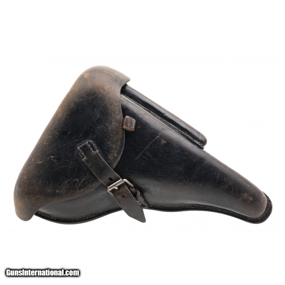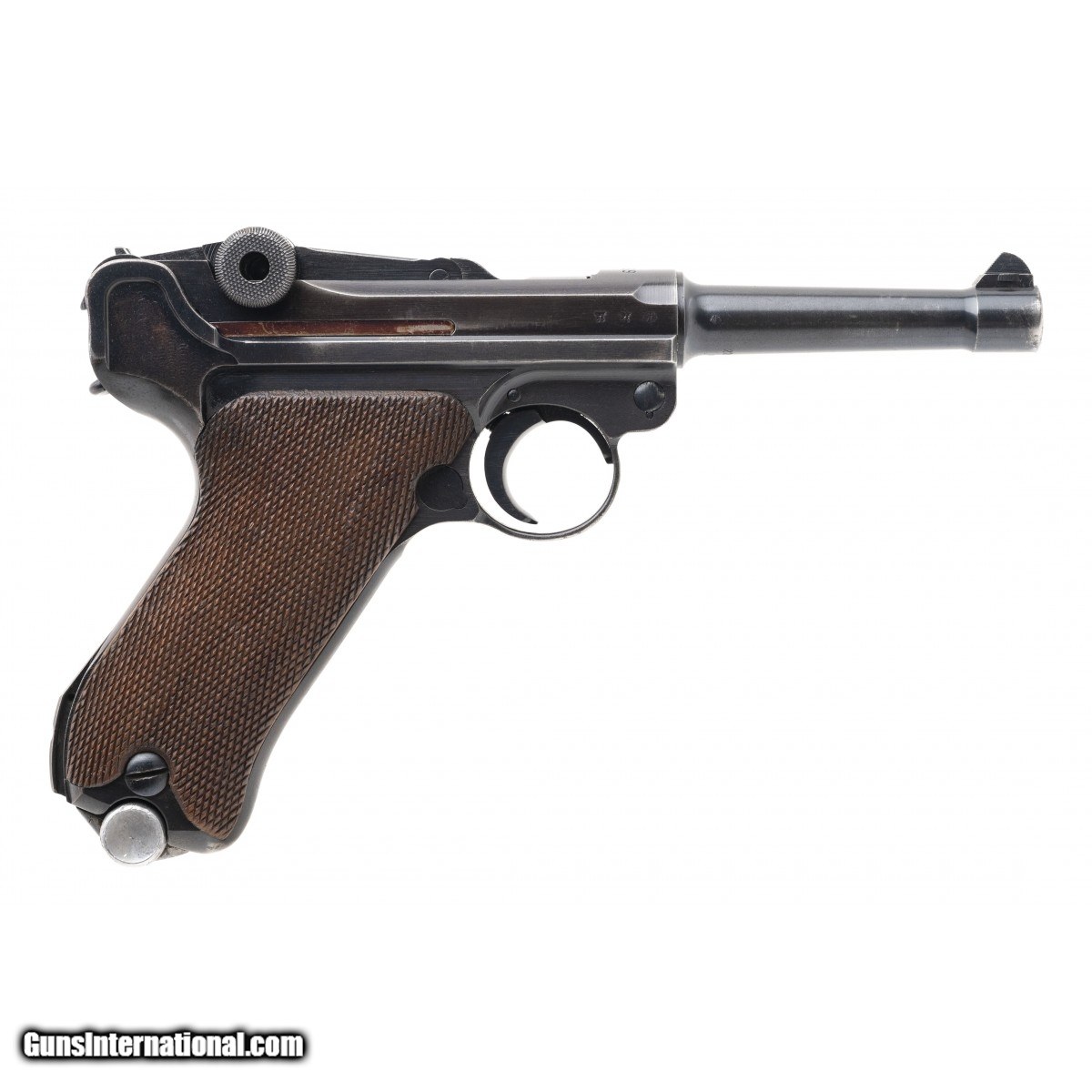 Serial No. 2244o, made in 1939, 9mm, 4"" round barrel. Finish rates 96% with thinning visible along the sharp edges. Serial numbers are matching including grips and extra magazine, left side grip has a light strike of ""4"" while the right side has a strong ""44"" . Bore is bright and shiny with strong rifling visible. Wooden checkered grips show very light handling wear, texture is crips. Holster is overall very good plus condition with minor wear visible, take down tool is included inside with extra matching magazine!
