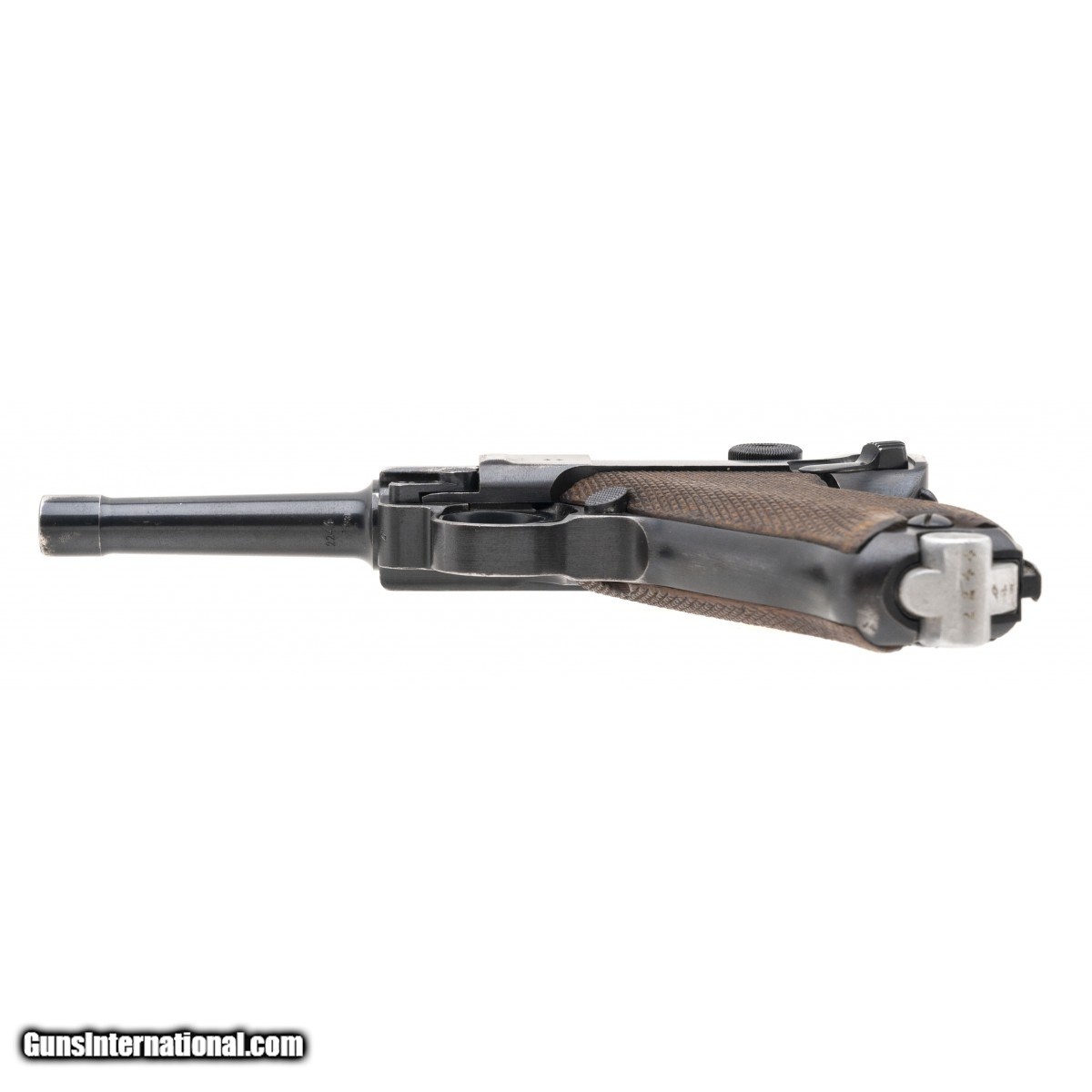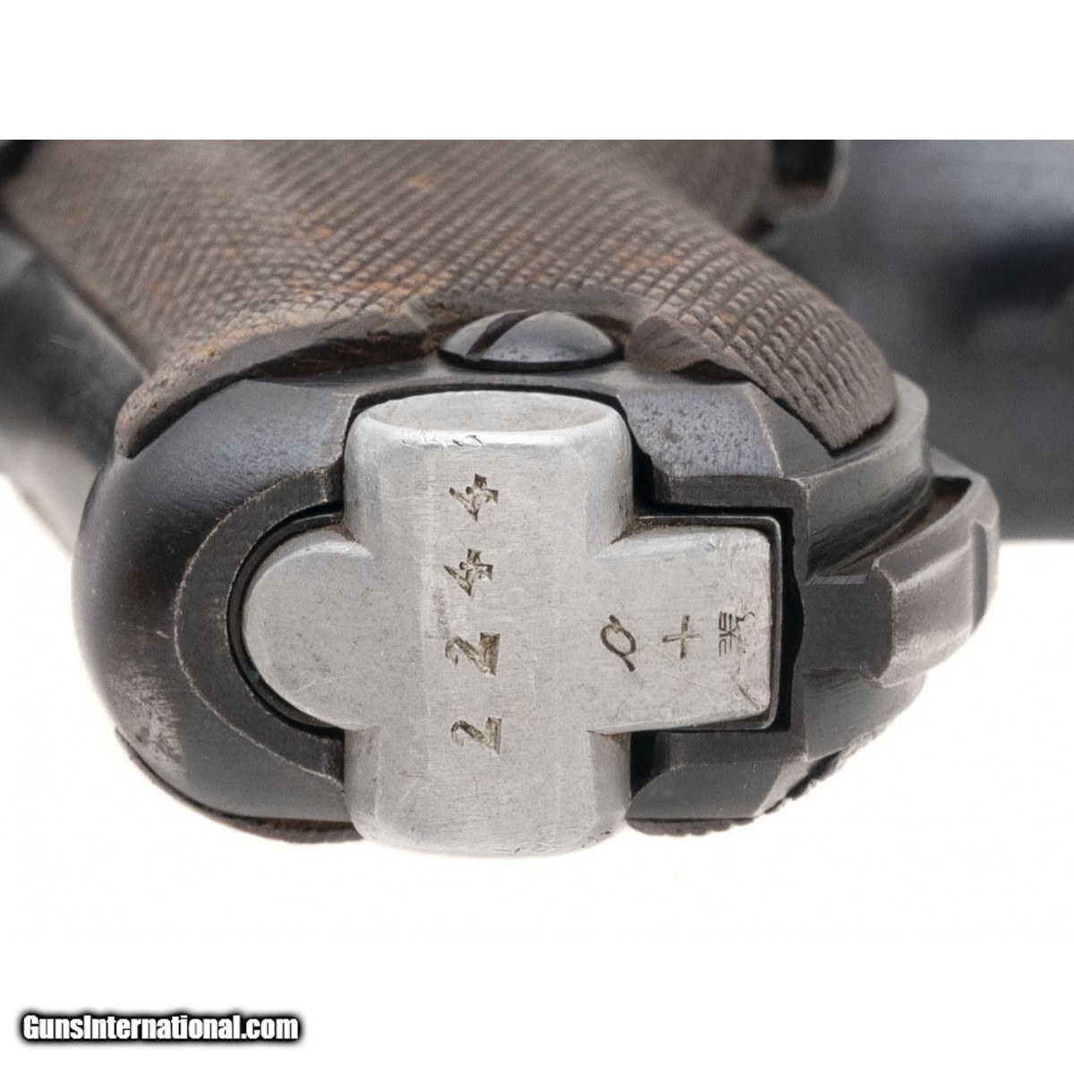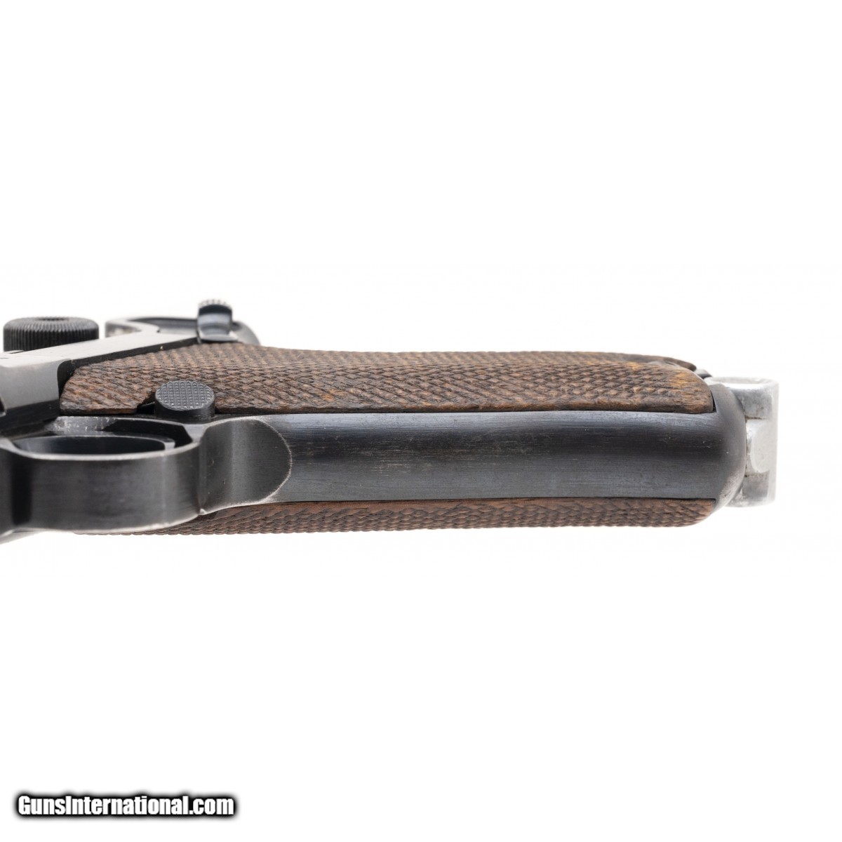 Description: " Serial No. 2244o, made in 1939, 9mm, 4"" round barrel. Finish rates 96% with thinning visible along the sharp edges. Serial numbers are matching including grips and extra magazine, left side grip has a light strike of ""4"" while the right side has a strong ""44"" . Bore is bright and shiny with strong rifling visible. Wooden checkered grips show very light handling wear, texture is crips. Holster is overall very good plus condition with minor wear visible, take down tool is included inside with extra matching magazine! SOLD Curio/Relic: Yes |