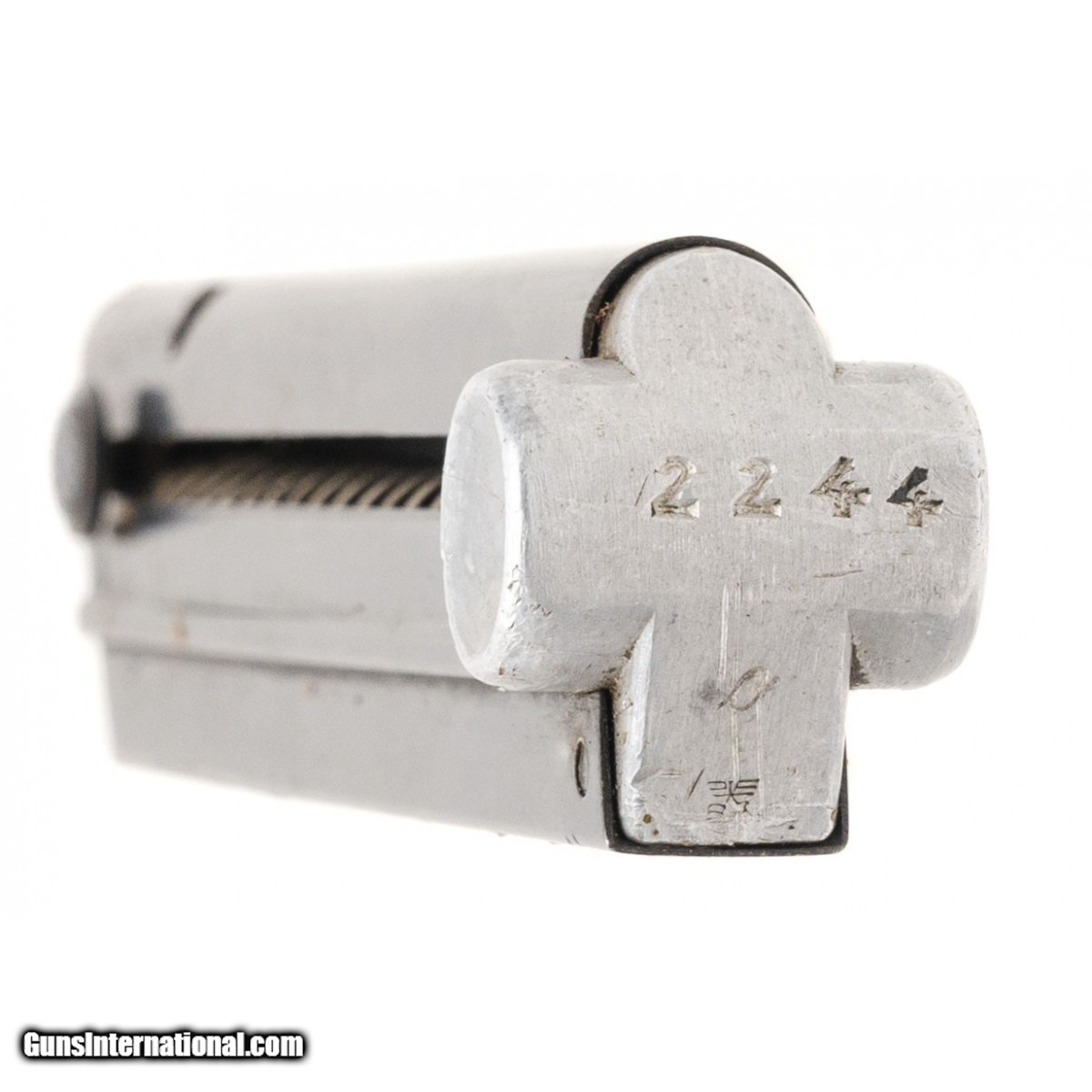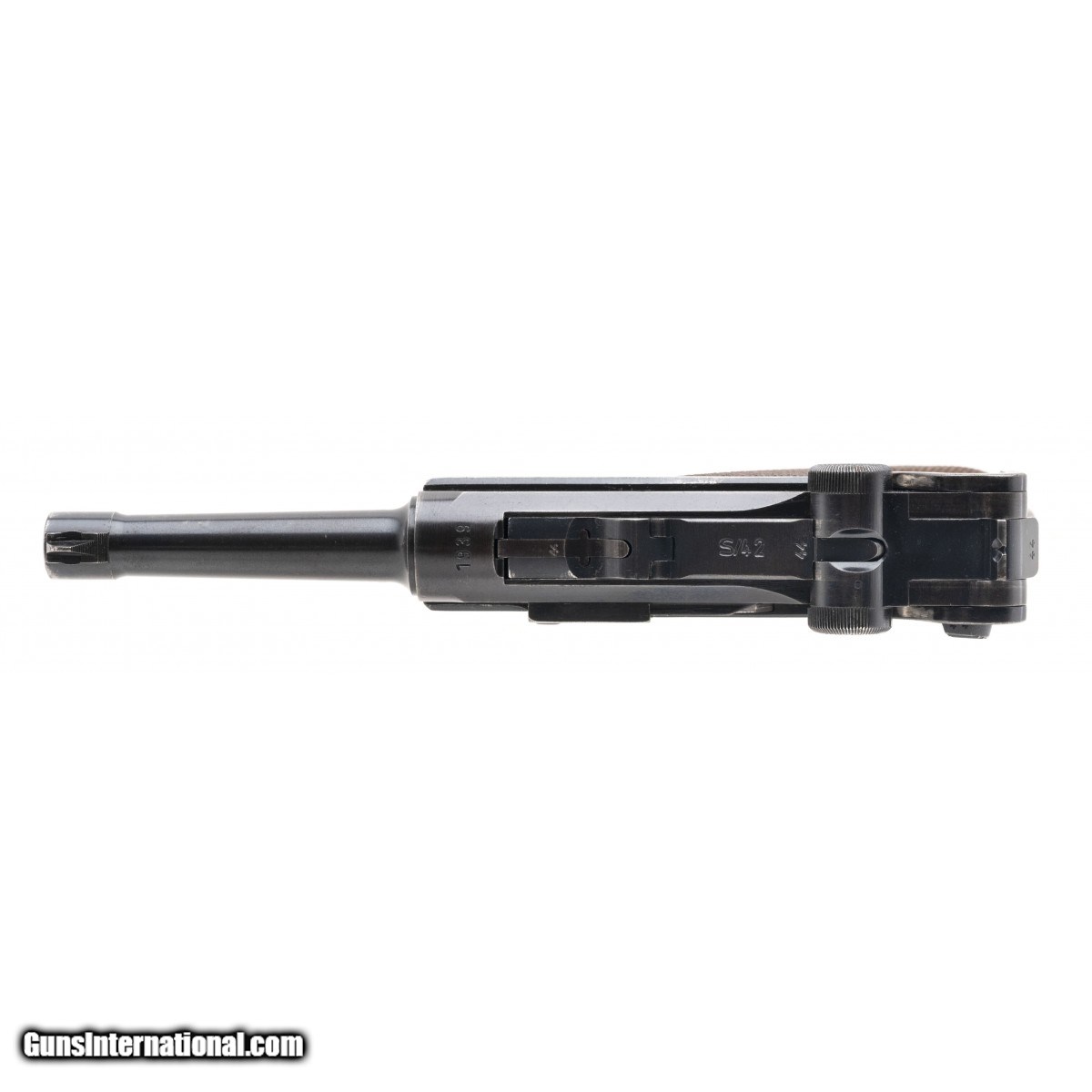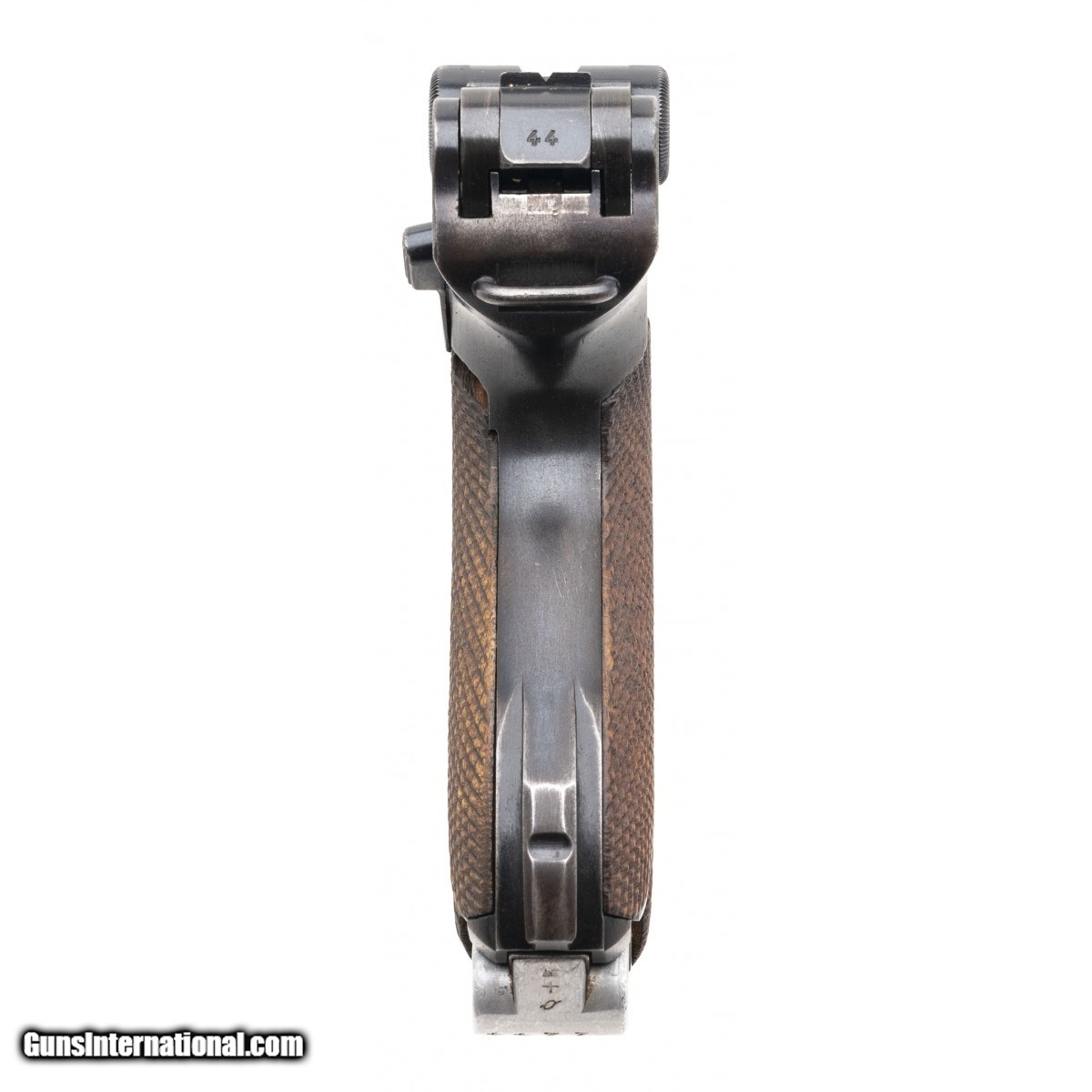 Description: " Serial No. 2244o, made in 1939, 9mm, 4"" round barrel. Finish rates 96% with thinning visible along the sharp edges. Serial numbers are matching including grips and extra magazine, left side grip has a light strike of ""4"" while the right side has a strong ""44"" . Bore is bright and shiny with strong rifling visible. Wooden checkered grips show very light handling wear, texture is crips. Holster is overall very good plus condition with minor wear visible, take down tool is included inside with extra matching magazine! SOLD Curio/Relic: Yes |