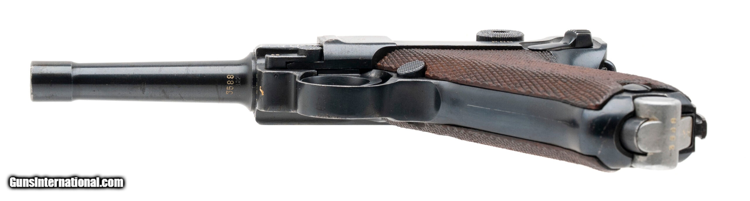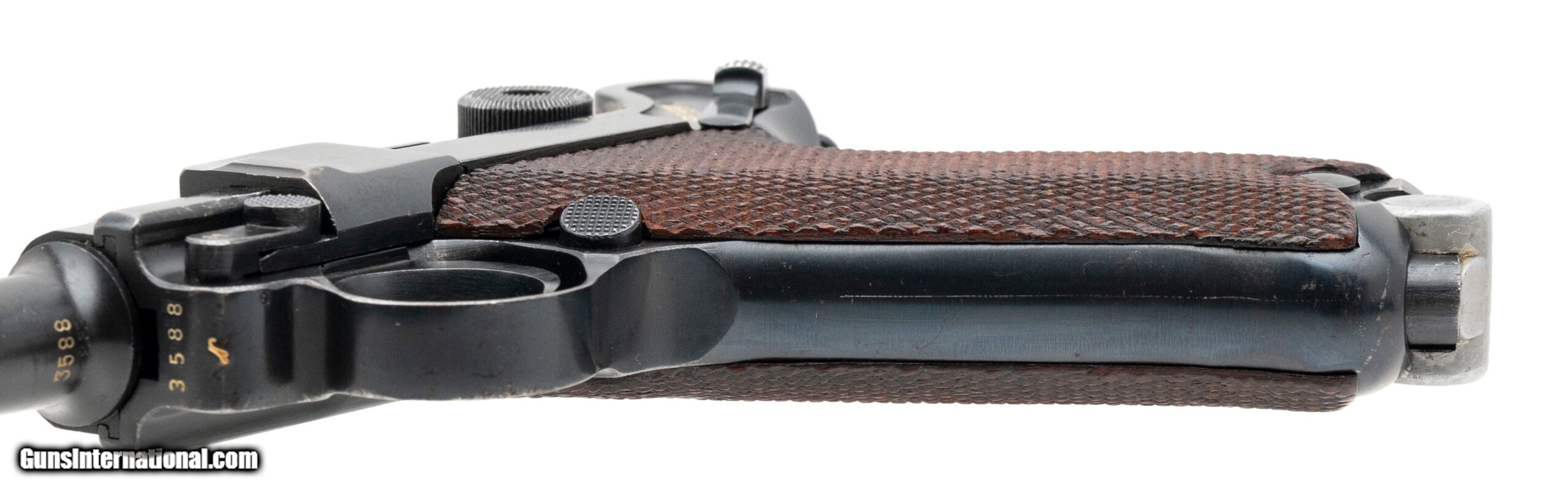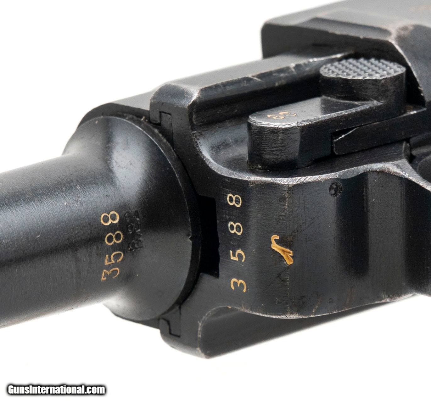 Description: "Serial number 3588X. Made in 1941. 9mm caliber with a 4" barrel. This is a military accepted luger with the Eagle 665 proof marks. This gun is all matching including the magazine. This gun is in excellent condition with almost all of the blue as restored. Very good WWII military luger! SOLD Curio/Relic: Yes |