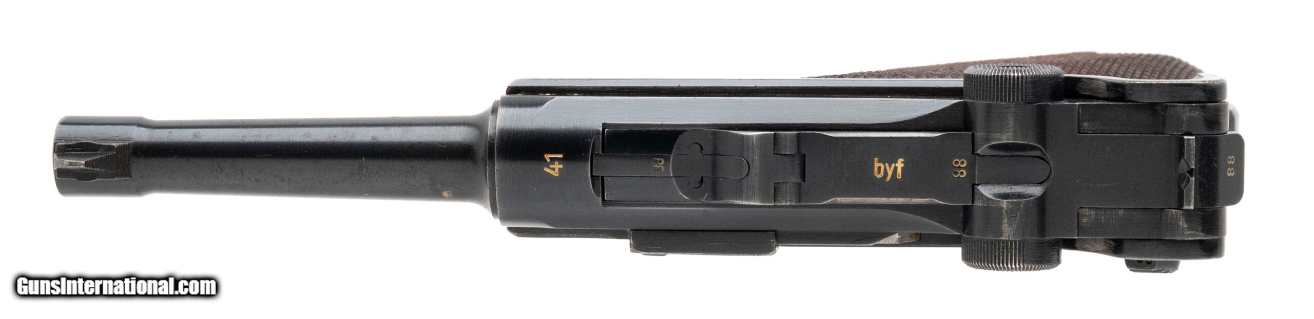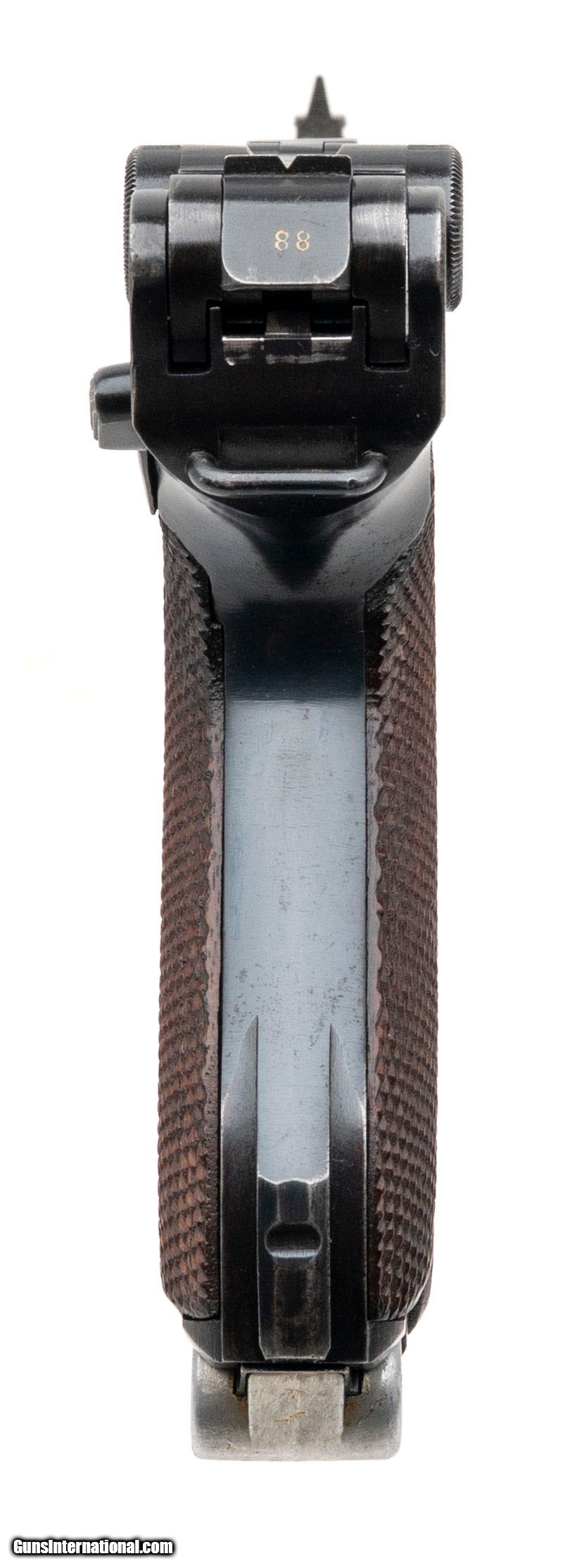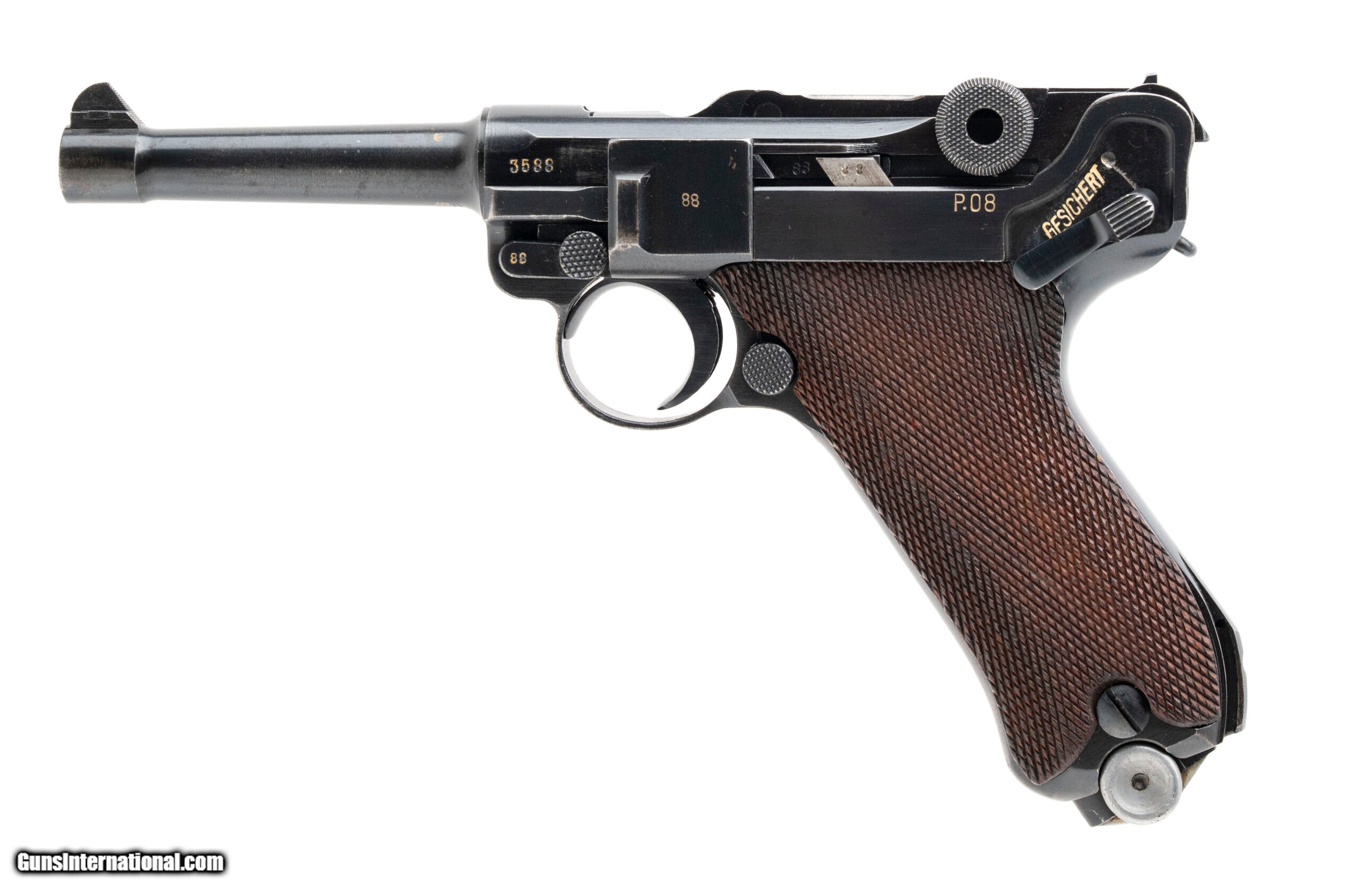 Description: "Serial number 3588X. Made in 1941. 9mm caliber with a 4" barrel. This is a military accepted luger with the Eagle 665 proof marks. This gun is all matching including the magazine. This gun is in excellent condition with almost all of the blue as restored. Very good WWII military luger! SOLD Curio/Relic: Yes |