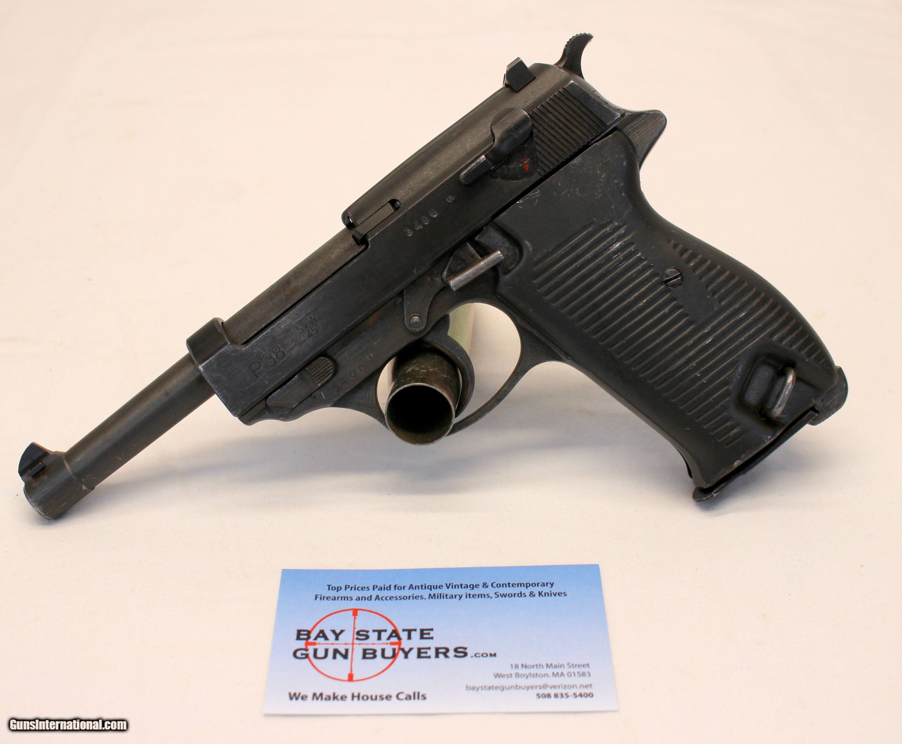 Description: We are offering for sale a very collectible 1945 Mauser P38 FRENCH MADE pistol chambered in 9mm. This gun is known as the GREY GHOST due to the phosphate finish and parkerized grey sheet metal grips. This is an H block with 3400 serial number. Right side has 5 pointed French star marking. FULLY MATCHING NUMBERS GUN! The barrel is very good with crisp rifling. Finish is very good with some scattered surface wear. Slide and frame are very good with light surface wear. Gun functions flawlessly. ALL NUMBERS MATCHING! The parkerized sheet metal grips are good with scattered surface, age wear noted. Original "38" marked magazine. SCARCE EXAMPLE! SHIPPING IS $29.95 USPS PRIORITY WITH INSURANCE **** PLEASE NOTE: WE ONLY ACCEPT MASTERCARD AND VISA AS PAYMENT OPTIONS (please note we charge a non-negotiable 3% CC fee) **** **** WE TAKE CREDIT CARD PAYMENT OVER THE PHONE. WE DO NOT TAKE PAYMENT THROUGH THIS **** PLEASE LOOK AT ALL PHOTOGRAPHS FOR CONDITION Please know the legality of any weapon in your state before . If a gun can’t be transferred to you we will charge a 15% re-stocking fee. We are in the shop MODAY, WEDNESDAY, THURSDAY, FRIDAY and SATURDAY 8am-4pm EST. We will be in touch within 24 hours of your purchase. Please be ready to provide CC information. Please have your FFL email a copy of their license to: . No Face To Face Transfers! Please note: Clicking "buy" does not guarantee that this gun is yours, However clicking “Buy” will reserve this gun for you, if it hasn’t been sold in store. We will try to do our best to remove the posts as efficiently as possible, but sometimes delays may ensue. “Buy” is your safest bet to reserve a gun. Also please add 6.25% MA state sales tax (if from MA) and 3% credit card shop courtesy fee for all out of state buyers Before calling with concerns read these conditions and meet them accordingly. SOLD |