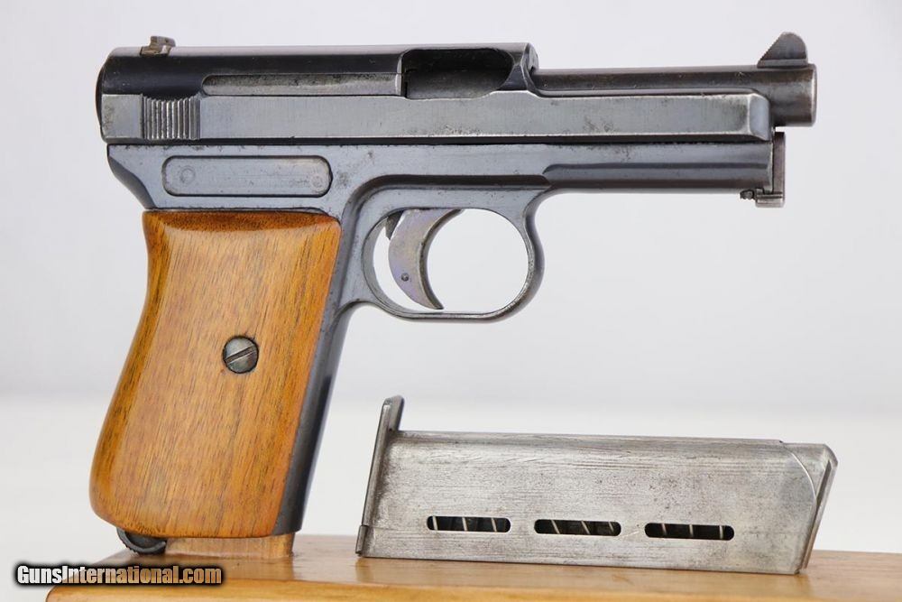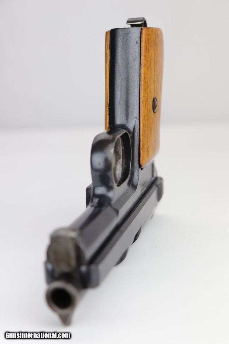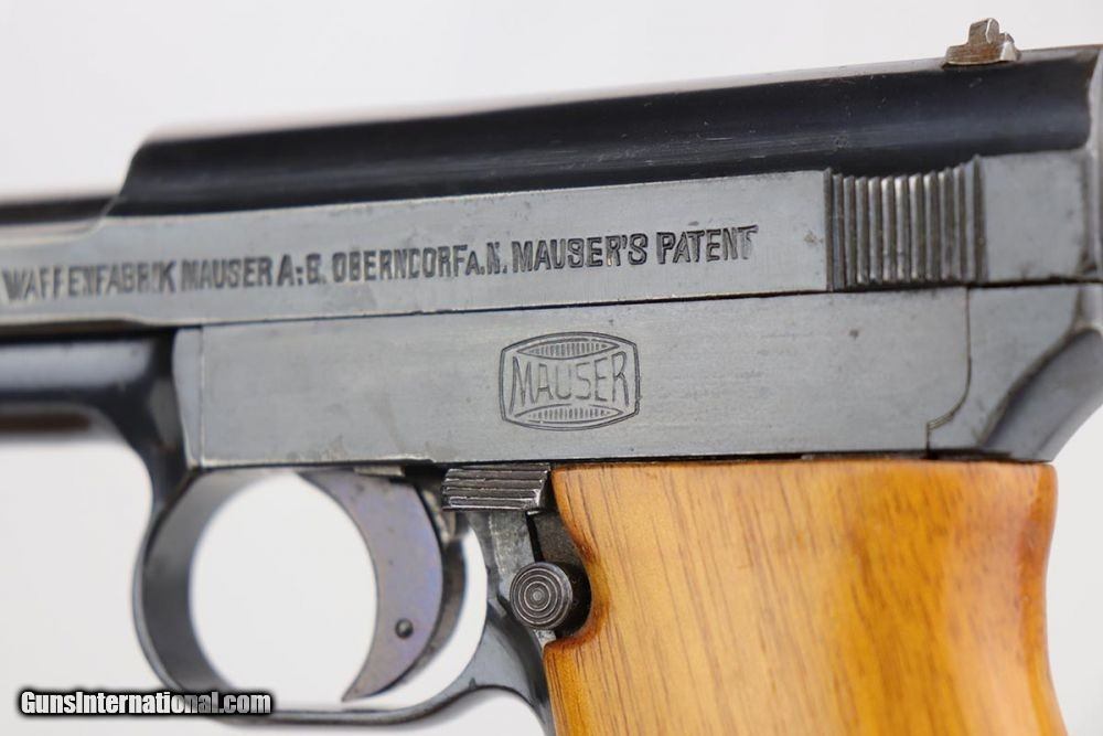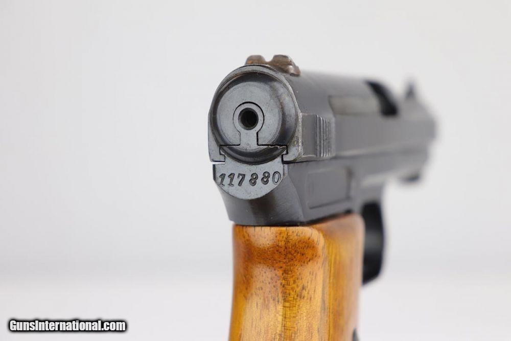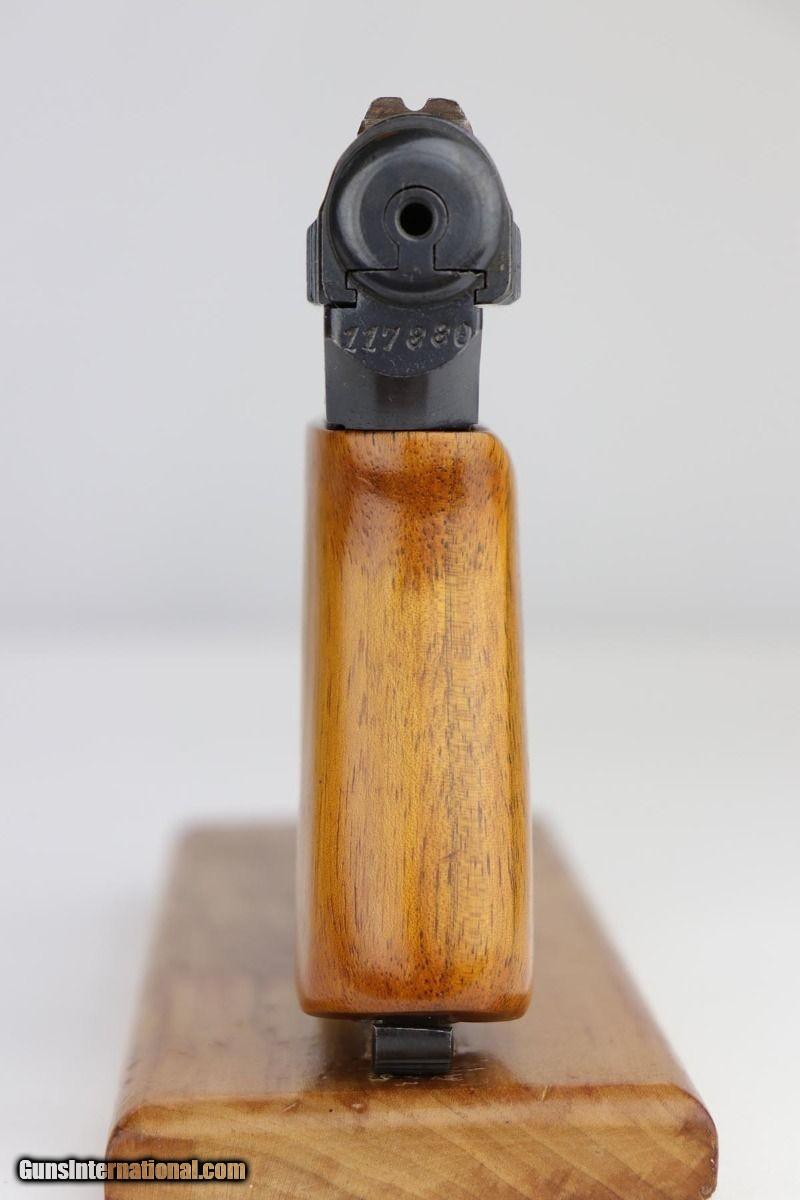 Description: This is a nice example of an original Mauser Model 1914 pistol that was issued to the German Military, as indicated by the crown marking in front of the rear sight. Blue rates at 97-98% minor high point thinning, and a couple minor areas of pinpricking. Crown/U proof on slide. Bore is shiny with good rifling but has some freckling throughout. Wood grip in excellent condition. SOLD Curio/Relic: Yes Manufacturer: Mauser Model: M1914 Serial Number: 117880 Caliber Info: 7.65mm Condition: 97-98% Bore Condition: 7/10 |