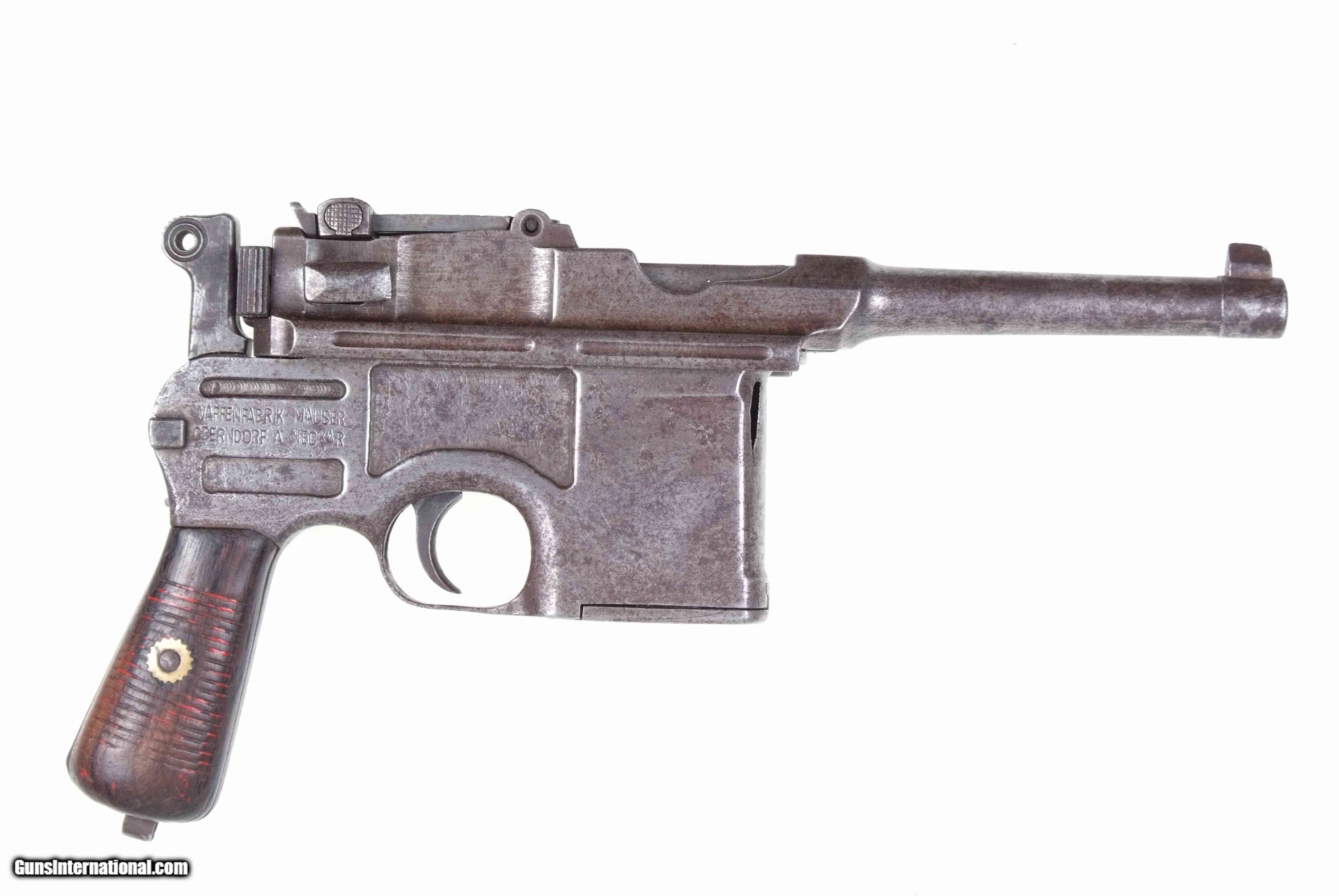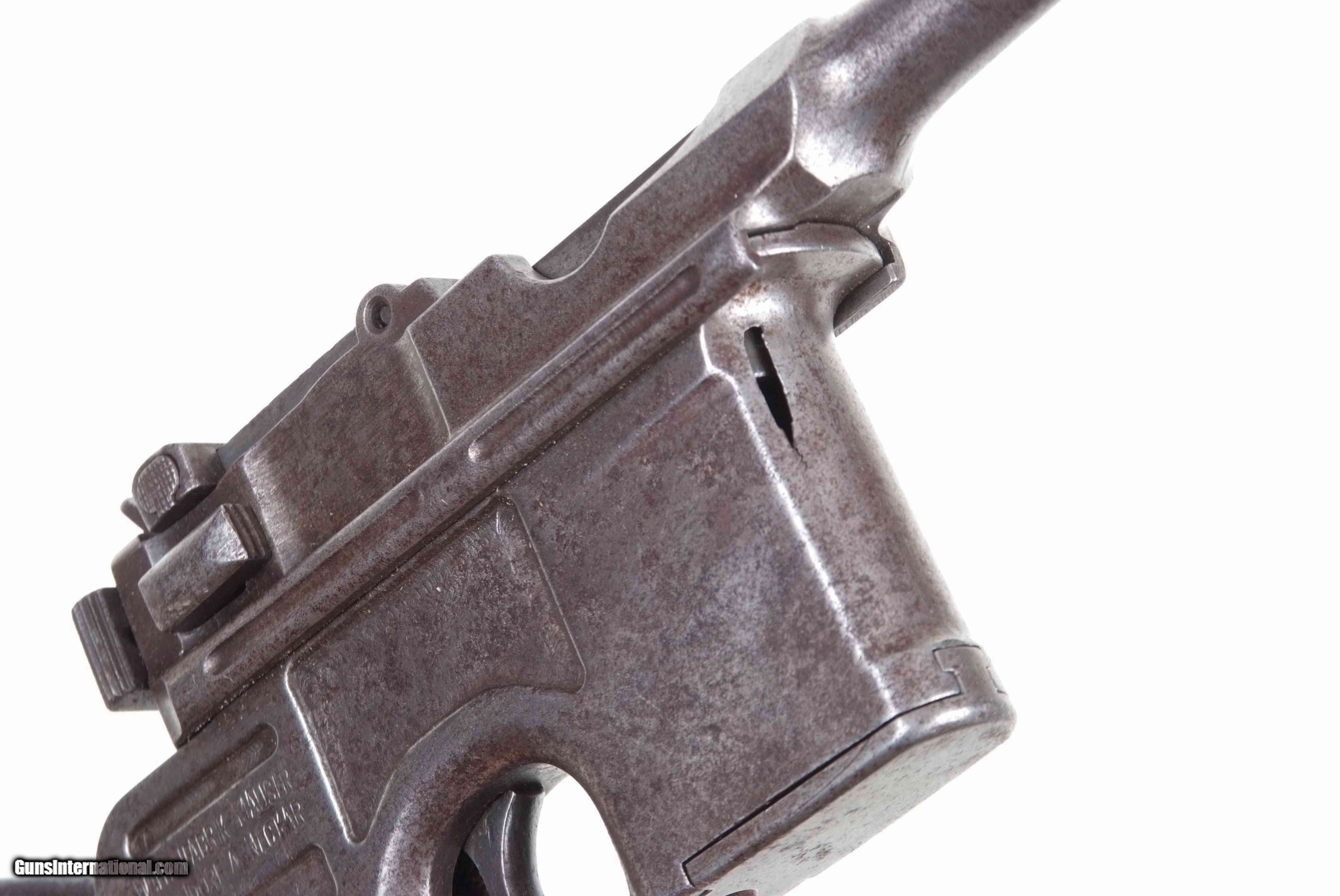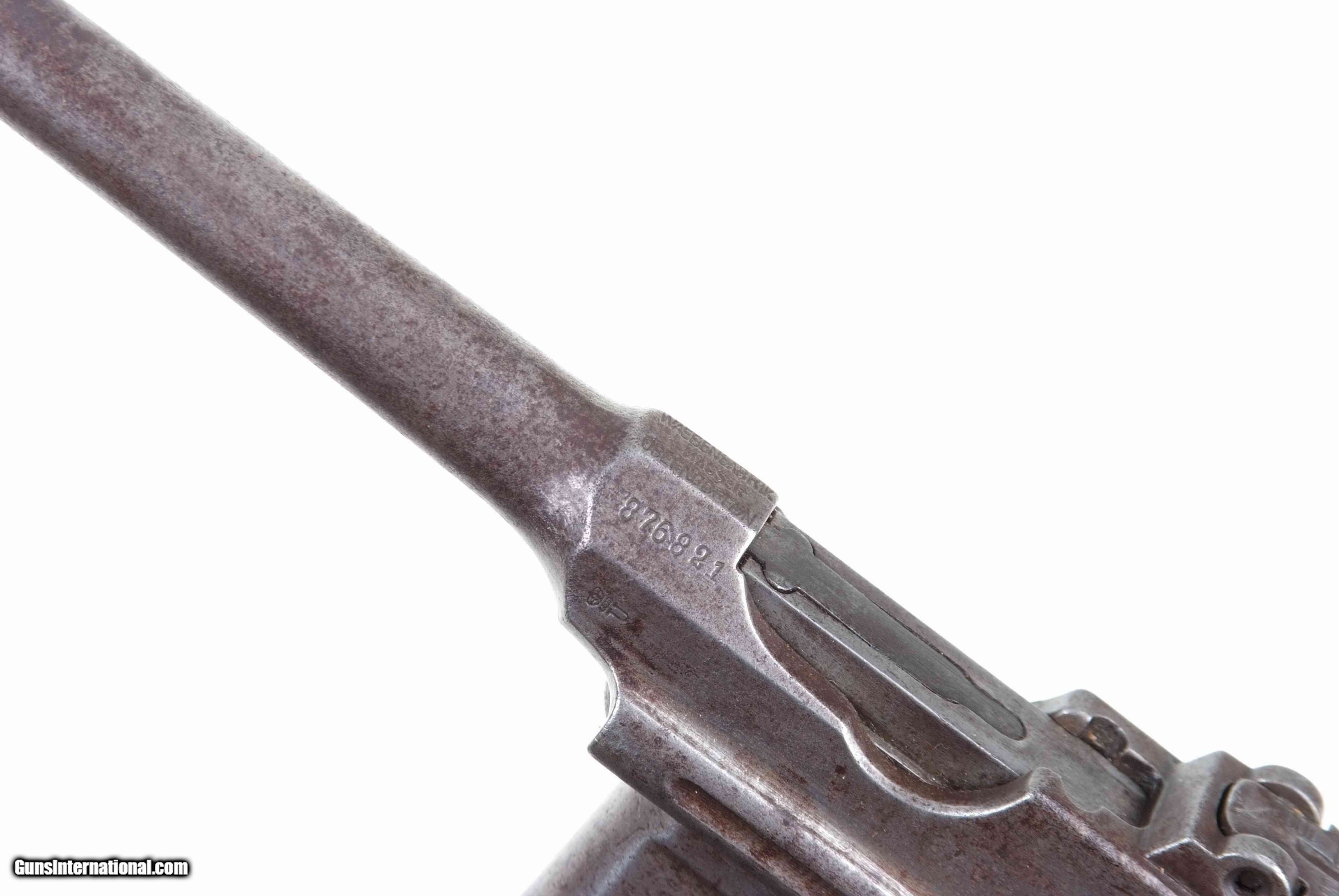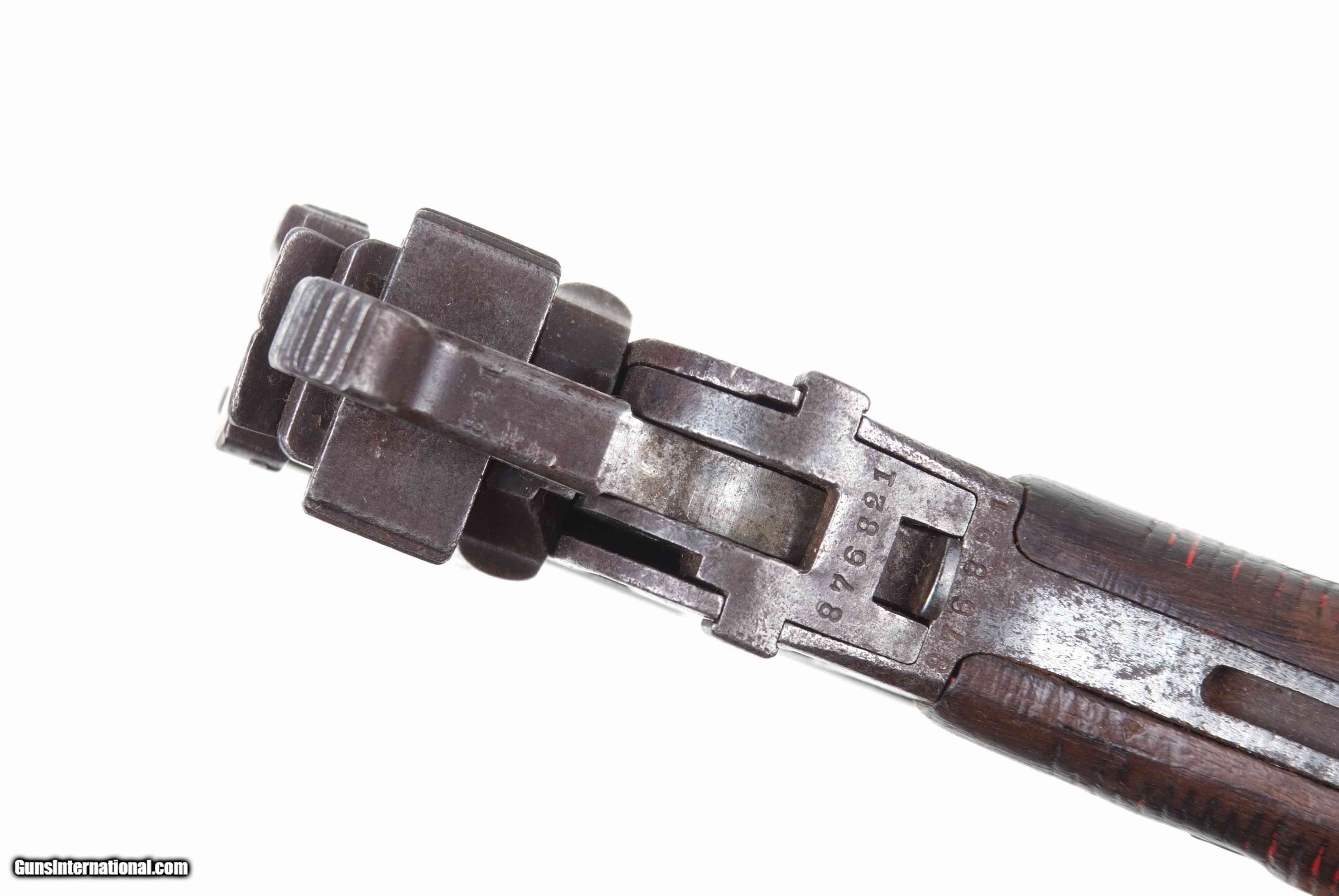 Description: Chinese manufactured copy of a late Mauser Banner Bolo, this one with a 6 digit serial number and a large Mauser banner. The gun is matching including the bolt stop in which the "8" was omitted, though grips were not removed. Safety missing. As per the Mauser, this copy has a 4" barrel, a fixed front sight and a slip-in rear sight graduated from 50-1000. Short extractor and two lug firing pin. Chamber with spurious 3-line pseudo-Mauser address. Full serial number on left chamber flat and C/C/U on left side of barrel extension. Full serial number repeated on subframe and frame. Last few digits on the bolt, bolt stop, hammer, transfer bar, and locking block. Walnut grips. No lanyard ring. Synopsis: Chinese copy of a Mauser Banner Bolo in 7.63mm. Condition: Generously G- with most blue now faded to a uniform gray with extensive patchy discolorations and shallow pitting as imaged. Shrapnel damage to upper portion of magazine well. Trigger return spring is weak and hammer needs some prodding/manipulation to fall. Missing safety. Dull bore with sharp rifling. If you want a nice gun or one to fire on the range, this is not for you. SOLD AS A HISTORIC ARTIFACT. NOT TO BE FIRED! NOT TO BE FIRED! NOT TO BE FIRED! ~~Insured shipping fee of $55; most packages shipped using FedEx 2nd Day.~~ SOLD Manufacturer: Chinese Serial Number: 876821 Caliber Info: 7.63mm |