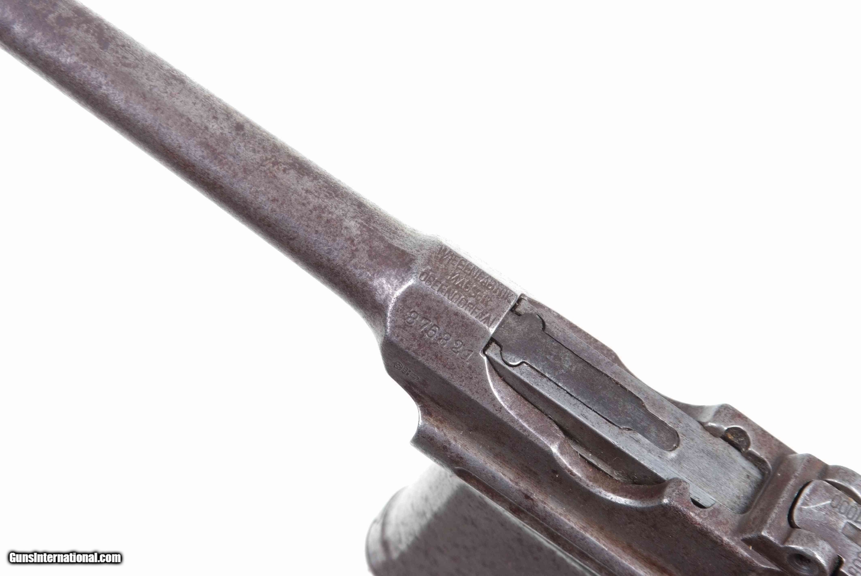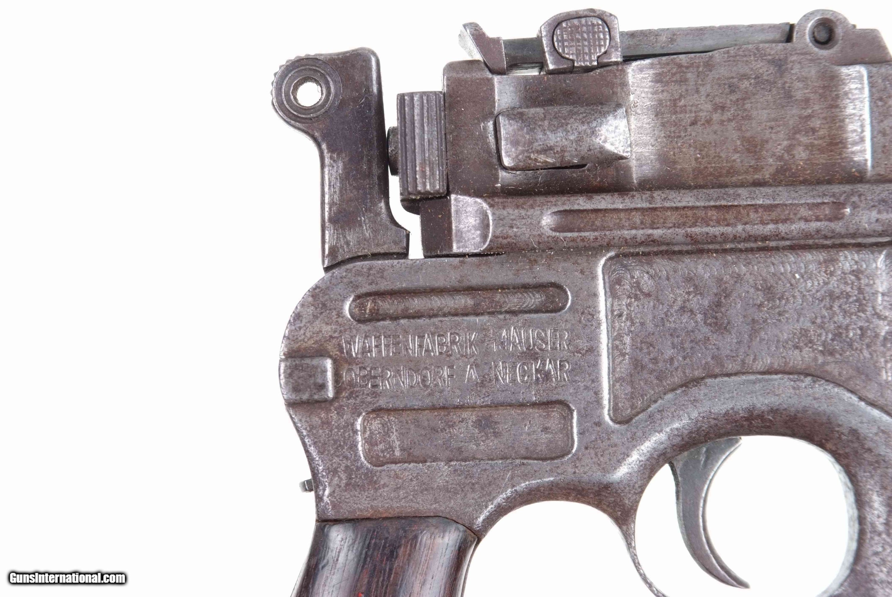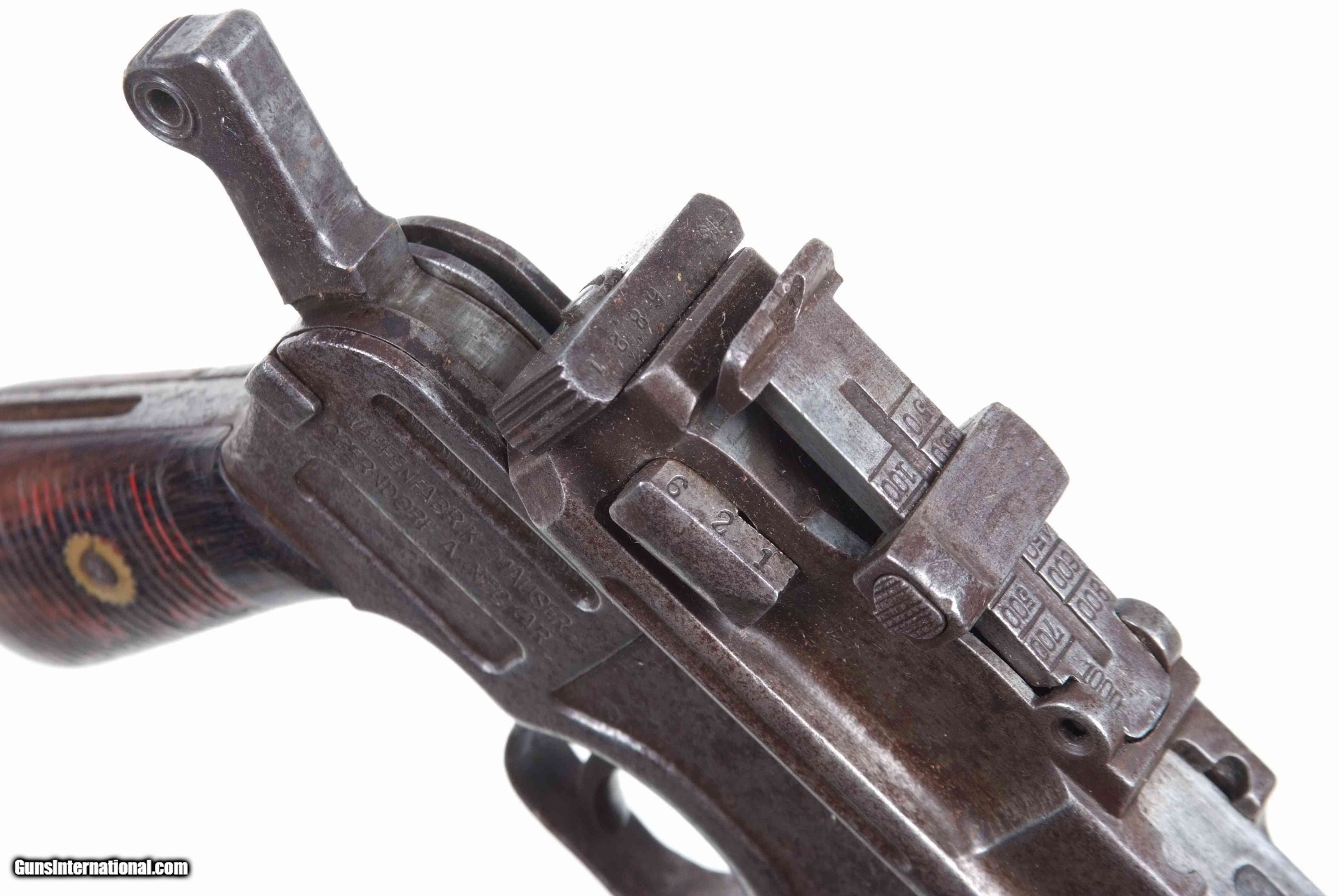 Description: Description: Chinese manufactured copy of a late Mauser Banner Bolo, this one with a 6 digit serial number and a large Mauser banner. The gun is matching including the bolt stop in which the "8" was omitted, though grips were not removed. Safety missing. As per the Mauser, this copy has a 4" barrel, a fixed front sight and a slip-in rear sight graduated from 50-1000. Short extractor and two lug firing pin. Chamber with spurious 3-line pseudo-Mauser address. Full serial number on left chamber flat and C/C/U on left side of barrel extension. Full serial number repeated on subframe and frame. Last few digits on the bolt, bolt stop, hammer, transfer bar, and locking block. Walnut grips. No lanyard ring. Synopsis: Chinese copy of a Mauser Banner Bolo in 7.63mm. Condition: Generously G- with most blue now faded to a uniform gray with extensive patchy discolorations and shallow pitting as imaged. Shrapnel damage to upper portion of magazine well. Trigger return spring is weak and hammer needs some prodding/manipulation to fall. Missing safety. Dull bore with sharp rifling. If you want a nice gun or one to fire on the range, this is not for you. SOLD AS A HISTORIC ARTIFACT. NOT TO BE FIRED! NOT TO BE FIRED! NOT TO BE FIRED! SOLD Manufacturer: Chinese Serial Number: 876821 Caliber Info: 7.63mm |