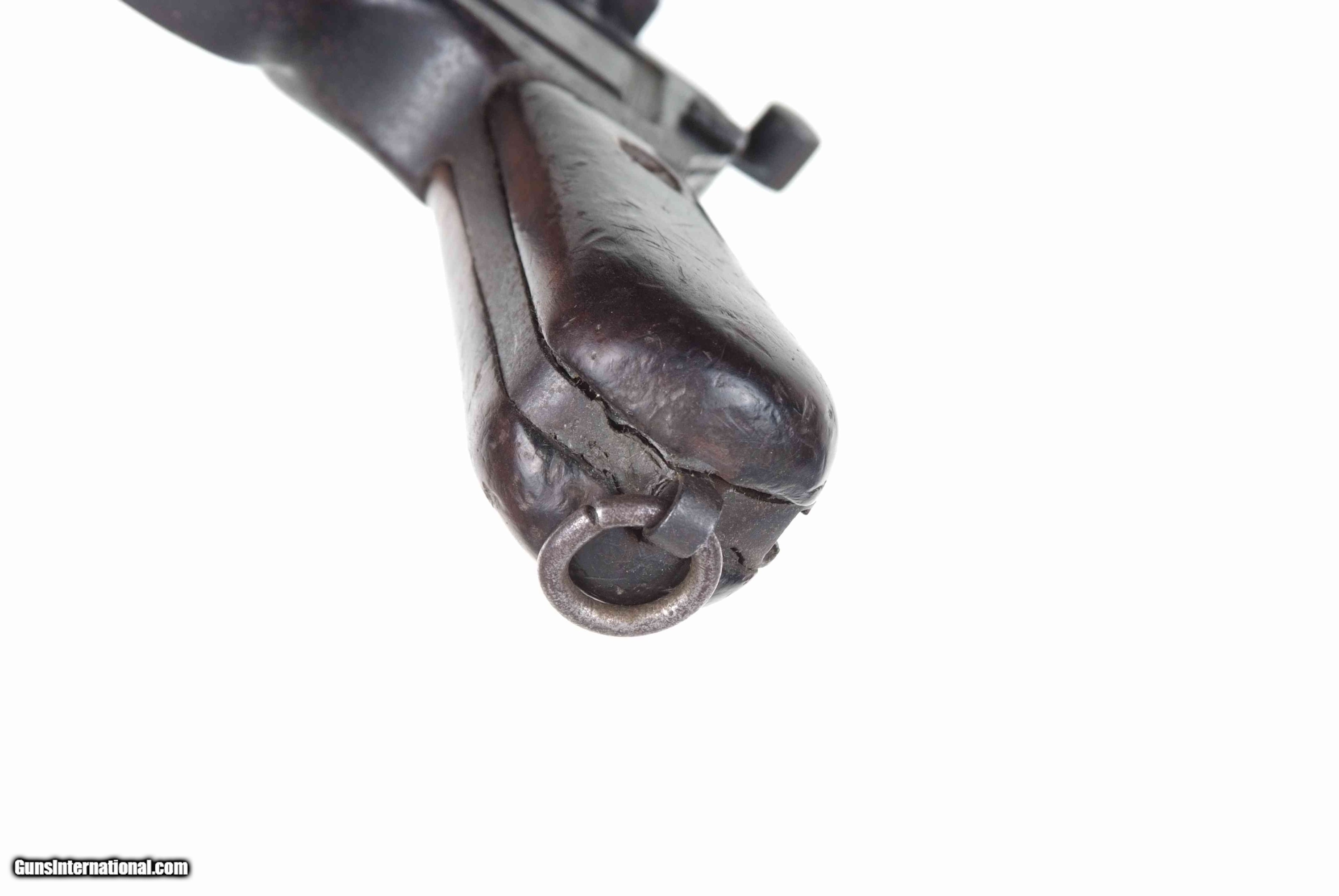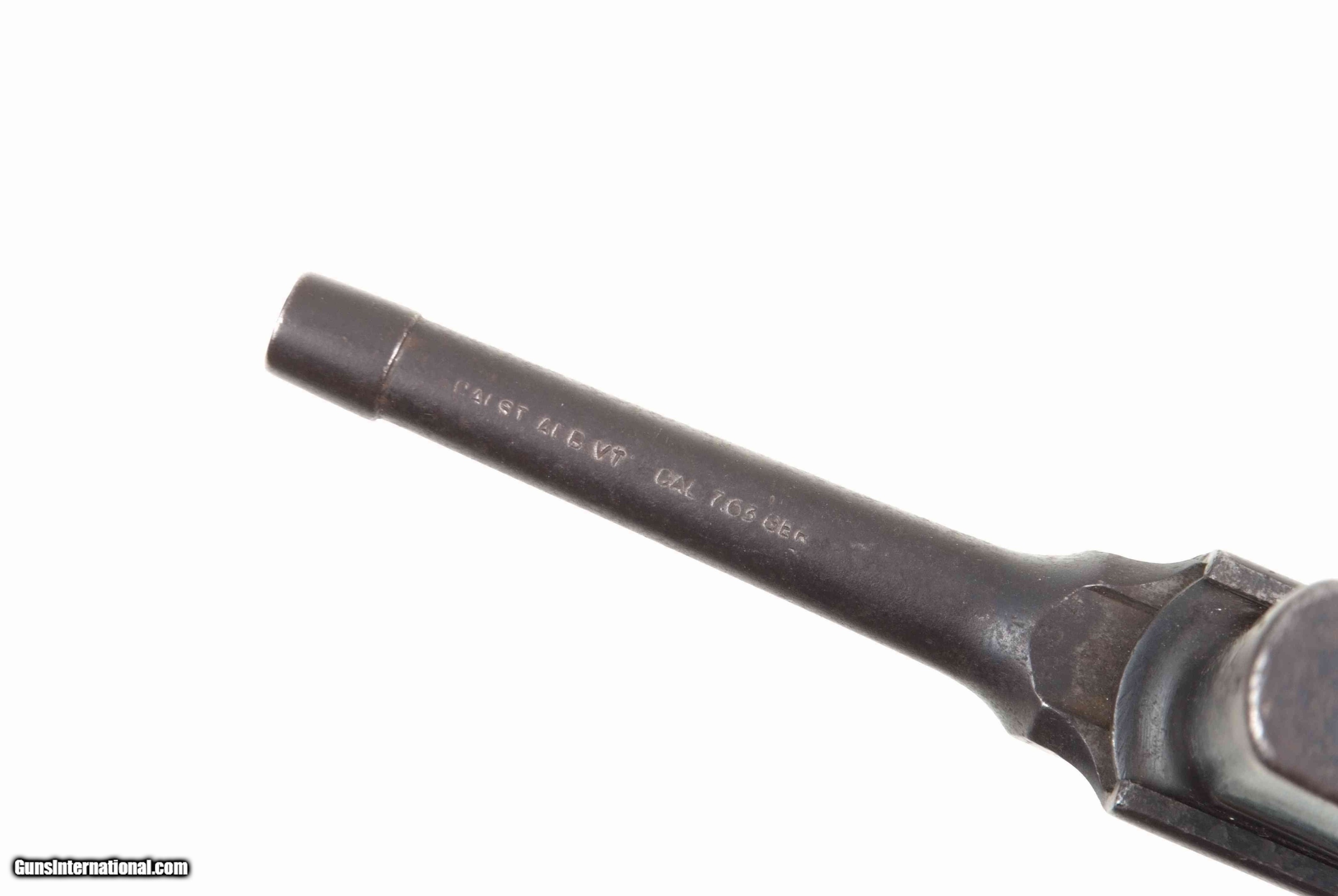 Description: Chinese manufactured copy of an Early Post-War Mauser Bolo but with solid rails. As per the Mauser, this copy has a 4" barrel, a fixed front sight and a slip-in rear sight graduated from 50-1000. Short extractor and two lug firing pin. Chamber with a spurious 3-line pseudo-Mauser address, partially effaced. Full serial number on left side of barrel extension. No proof marks. Import marked under barrel. Full serial number repeated on subframe and frame. Last few digits on the bolt stop and hammer. Bolt is unnumbered. No disassembly was performed. Period replacement grips. Lanyard ring present. Synopsis: Chinese copy of an Early Post-War Mauser Bolo in 7.63mm. Condition: Good as redipped/reblued. Scattered pitting as photographed. Comparable condition grips. Dull eroded bore with very shallow rifling. Excellent manual mechanics, though in full cock, hammer needs to be slightly retracted to engage safety. If you want a nice gun or one to fire on the range, this is not for you. A very representative Chinese Warlord pistol. SOLD AS A HISTORIC ARTIFACT. NOT TO BE FIRED! NOT TO BE FIRED! NOT TO BE FIRED! ~~Insured shipping fee of $55; most packages shipped using FedEx 2nd Day.~~ SOLD Manufacturer: Chinese Serial Number: 698322 Caliber Info: 7.63mm |