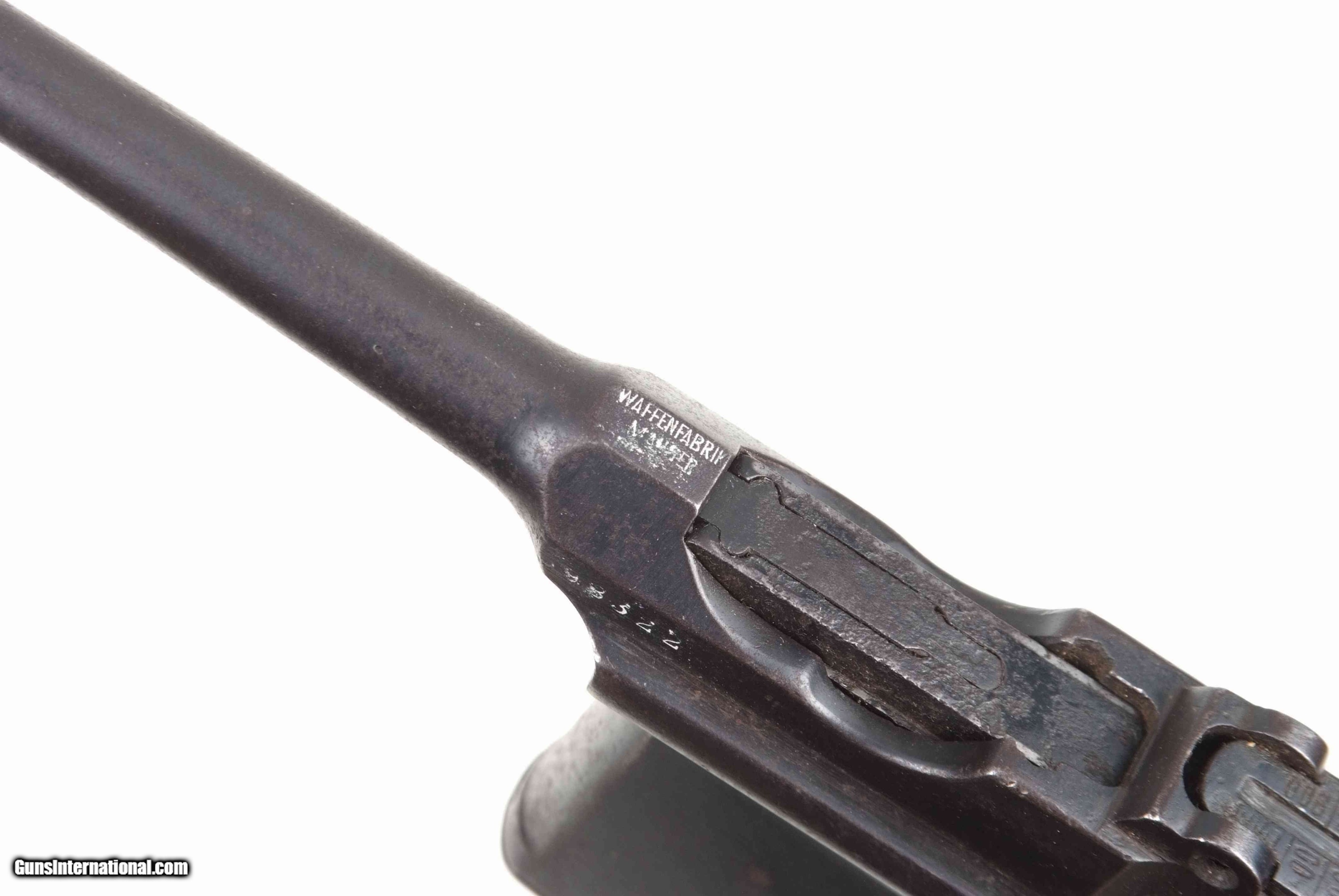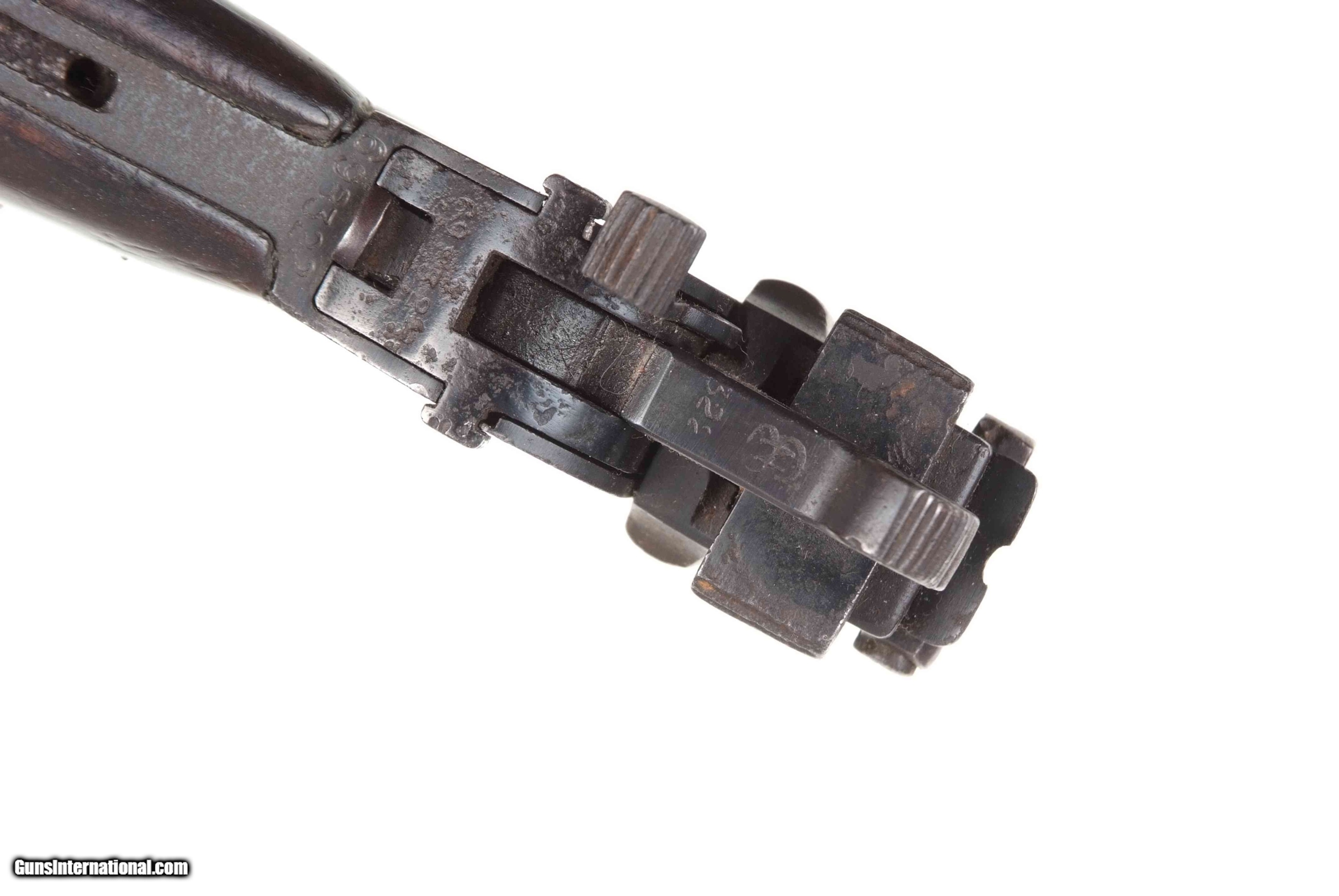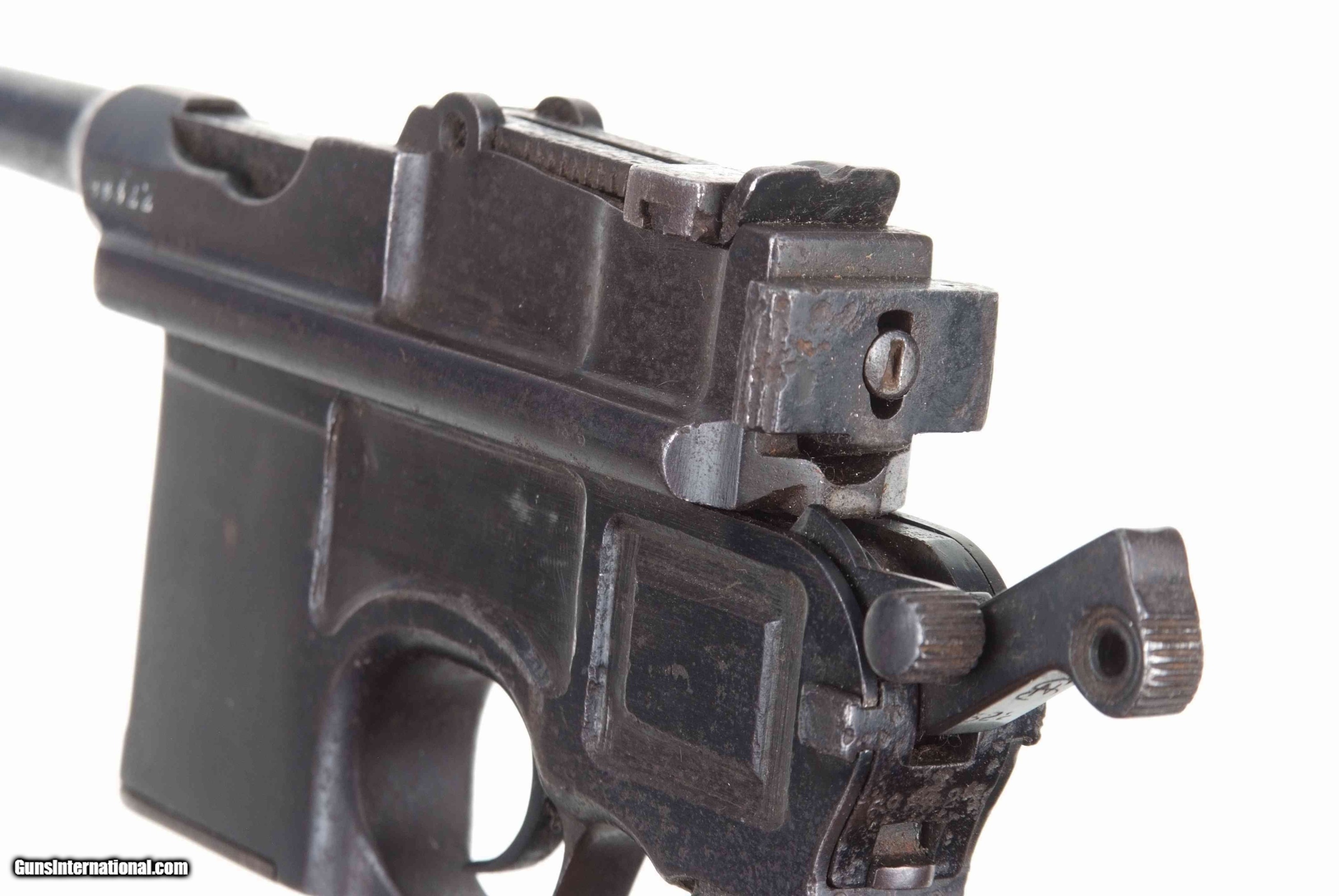 Description: Description: Chinese manufactured copy of an Early Post-War Mauser Bolo but with solid rails. As per the Mauser, this copy has a 4" barrel, a fixed front sight and a slip-in rear sight graduated from 50-1000. Short extractor and two lug firing pin. Chamber with a spurious 3-line pseudo-Mauser address, partially effaced. Full serial number on left side of barrel extension. No proof marks. Import marked under barrel. Full serial number repeated on subframe and frame. Last few digits on the bolt stop and hammer. Bolt is unnumbered. No disassembly was performed. Period replacement grips. Lanyard ring present. Synopsis: Chinese copy of an Early Post-War Mauser Bolo in 7.63mm. Condition: Good as redipped/reblued. Scattered pitting as photographed. Comparable condition grips. Dull eroded bore with very shallow rifling. Excellent manual mechanics, though in full cock, hammer needs to be slightly retracted to engage safety. If you want a nice gun or one to fire on the range, this is not for you. A very representative Chinese Warlord pistol. SOLD AS A HISTORIC ARTIFACT. NOT TO BE FIRED! NOT TO BE FIRED! NOT TO BE FIRED! SOLD Manufacturer: Chinese Serial Number: 698322 Caliber Info: 7.63mm |