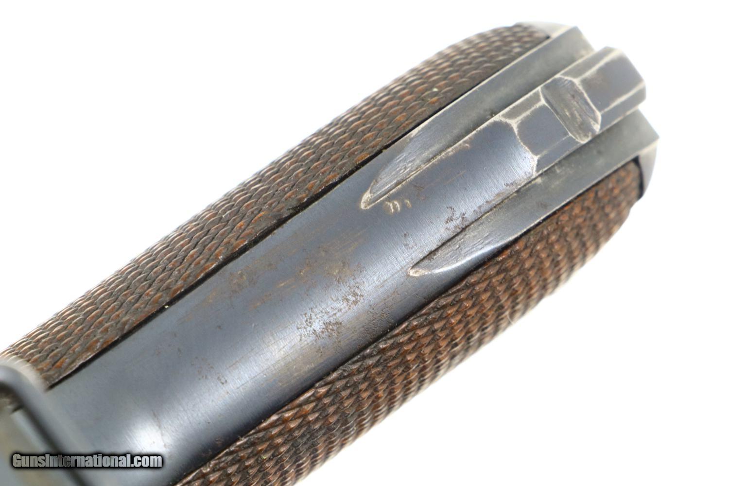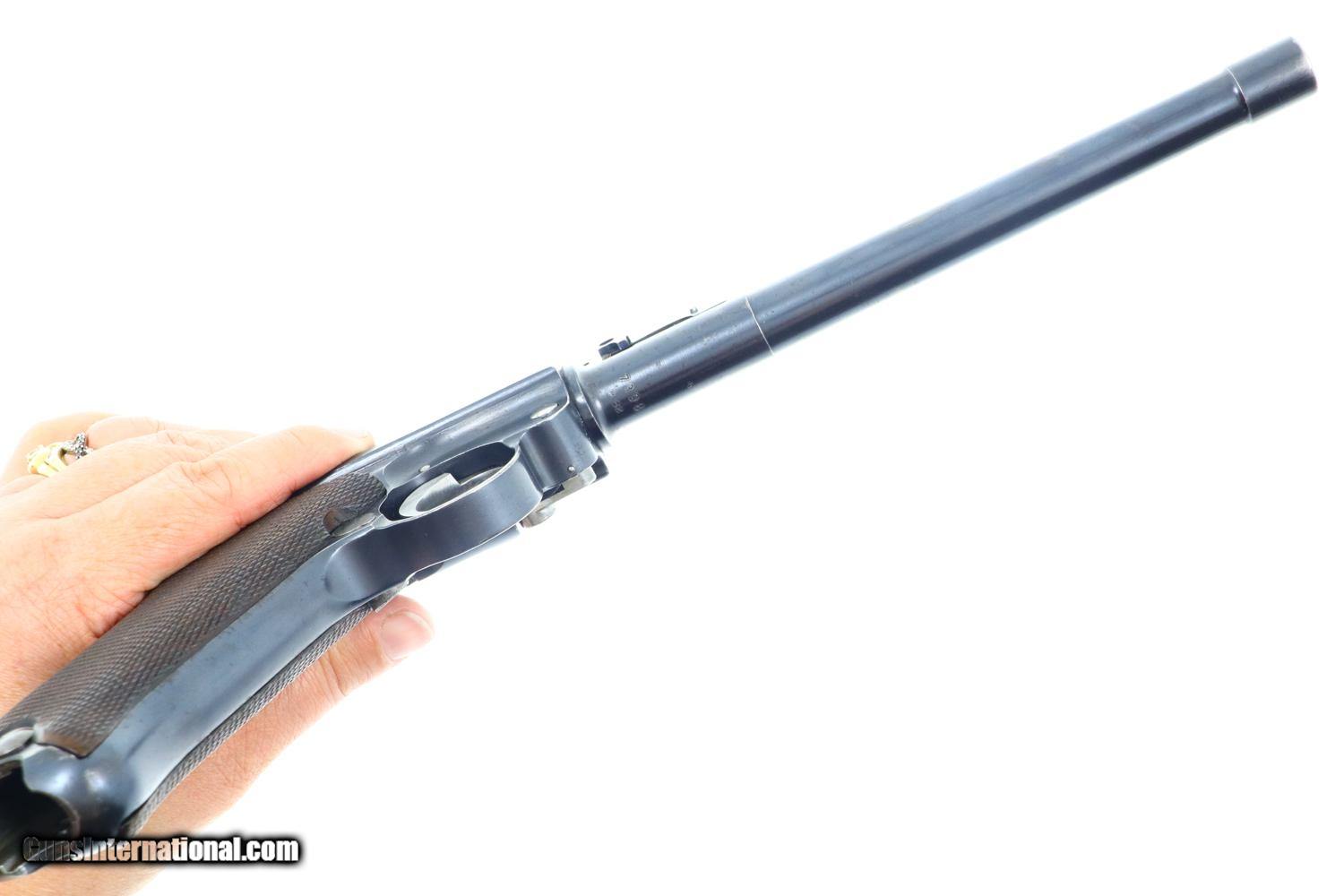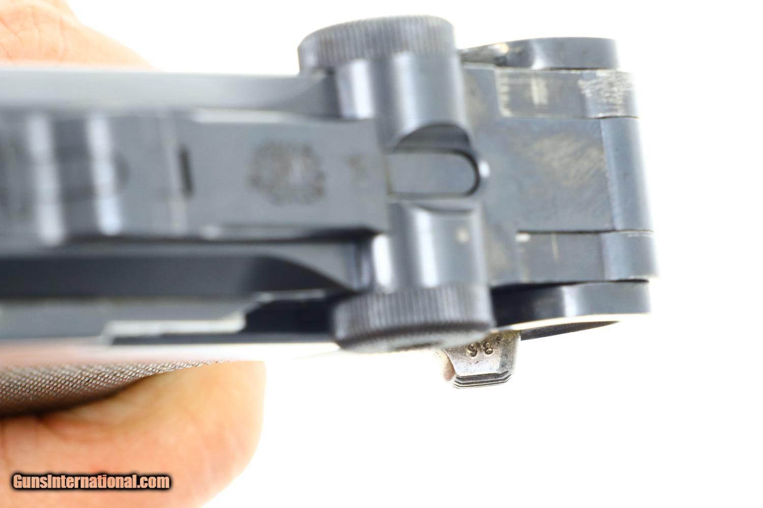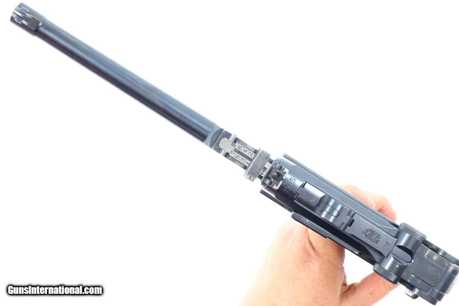 Description: Synopsis: Scarce DWM, 1915 Artillery Luger, German Military WWI, correct magazine. Description: 1915 was the second year that DWM made Artillery Lugers. All the early pistols, as per this example, fitted with fine tune front and rear sights. This standard configuration Artillery Luger from WWI, caliber 9mmP, has an 8 inch barrel and a rear sight fitted the usual 1-8 stops for cursor elevation. Chamber dated 1915 with intertwined DWM on front toggle link. Usual proofs on right side of barrel extention. Full serial number on forward frame, under barrel, and left side of barrel extention. Last two digits on all usual small parts. All matching, including the grips, except the magazine that has a correct but unmarked walnut plug. Condition: VG with sharp edge wear and spotting, especially on the barrel, as one would expect for a pistol made and used throughout most of WWI. Comparable condition straw, largely faded, that shows no evidence of enhancement. Dark grips, with slightly blunted checkering, the left panel missing the usual small chip just below the safety lever. Near excellent magazine. Near mirror bore. Perfect manual mechanics. A very nice and original DWM Artillery Luger from early WWI! ~~Insured shipping fee of $75; most packages shipped using FedEx 2nd Day.~~ SOLD Curio/Relic: Yes Manufacturer: DWM Serial Number: 7398 Caliber Info: 9mmP |