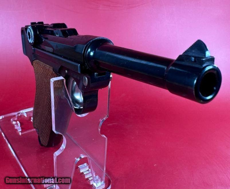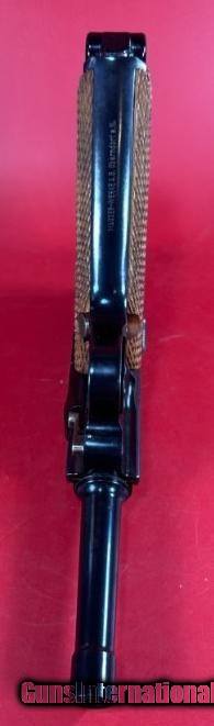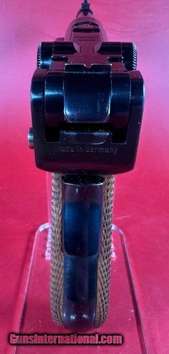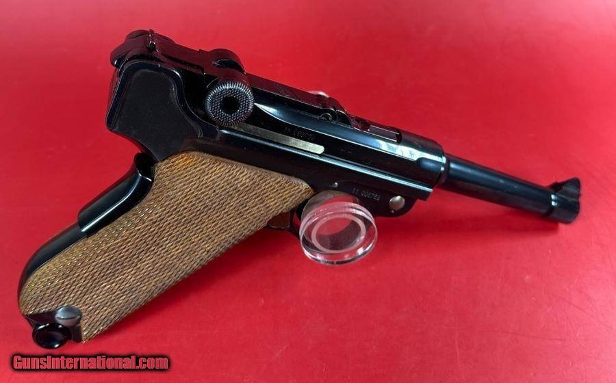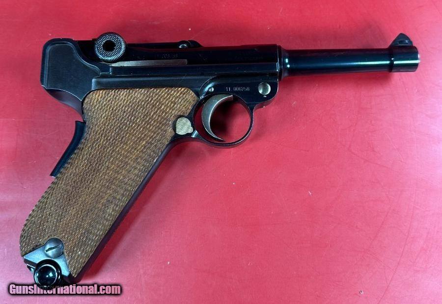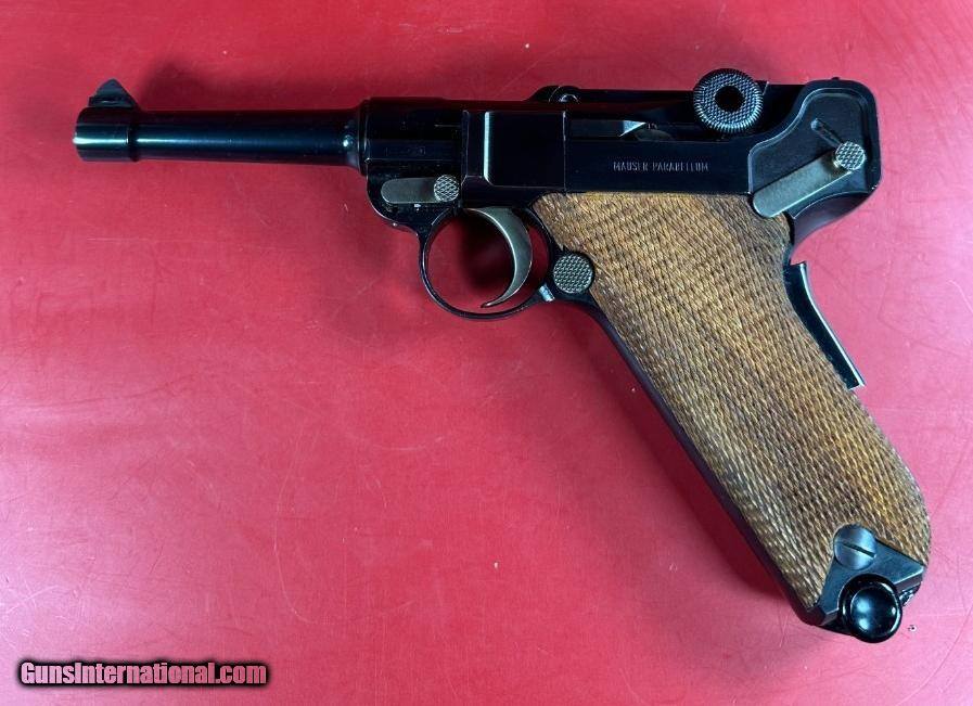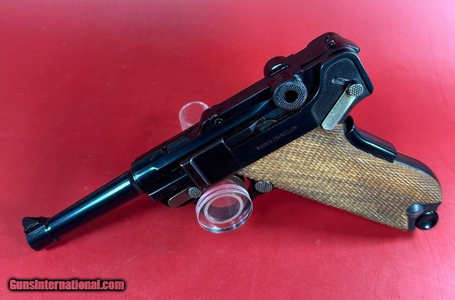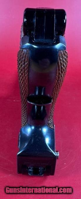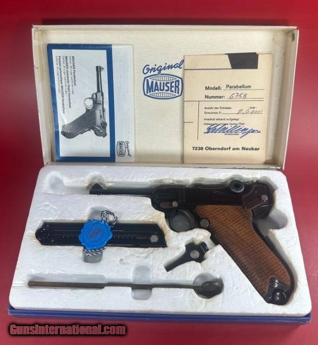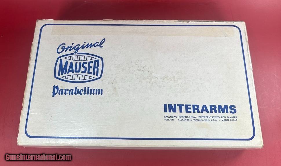 Description: After WWII, the demand for Luger pistols gradually picked back-up and copies of the original Luger pistols were made by Mauser as well as Stoeger. This pistol was made by Mauser and imported by Interarms. It has a grip safety as well as a manual safety and an American Eagle seal stamped on the top of the chamber ring. For sale Mint condition West German made Mauser-Werke “Original Mauser” Parabellum 9MM pistol with original matching box, manual, test target, two magazines and tools. Perfect original high polish blue finish with perfect mechanics and shiny bore. Box is numbered and matches the pistol. This gun will make a great addition to any collection. Manufacturer: Mauser-Werke A.G. Oberndorf a.N Caliber: 9mm Luger Finish: Blue Barrel Length: 4" Optics/Sights: Serrated Ramp Front with U-Notch Rear Stock/Grips: Fully Checkered Walnut Grips Action: Semi-Automatic Markings: Standard / The top of the frame is stamped with the American Eagle Seal. The left side of the frame is stamped “Mauser Parabellum 9mm Luger”. The left side of the frame is also stamped with an “FBM” proof mark. The top of the barrel is stamped “9mm Luger” with the “FBM” proof mark. The toggle is stamped "Original Mauser". The right side of the frame is stamped “Interarms Alexandria, Virginia”. The rear of the frame is stamped “Made In Germany”. The fore strap of the grip frame is marked “MAUSER-WERKE A.G. Oberndorf a.N Layaway and no interest payment plan are available. SOLD Handgun Caliber: 9x19mm Parabellum (9mm Luger, 9x19mm NATO) |