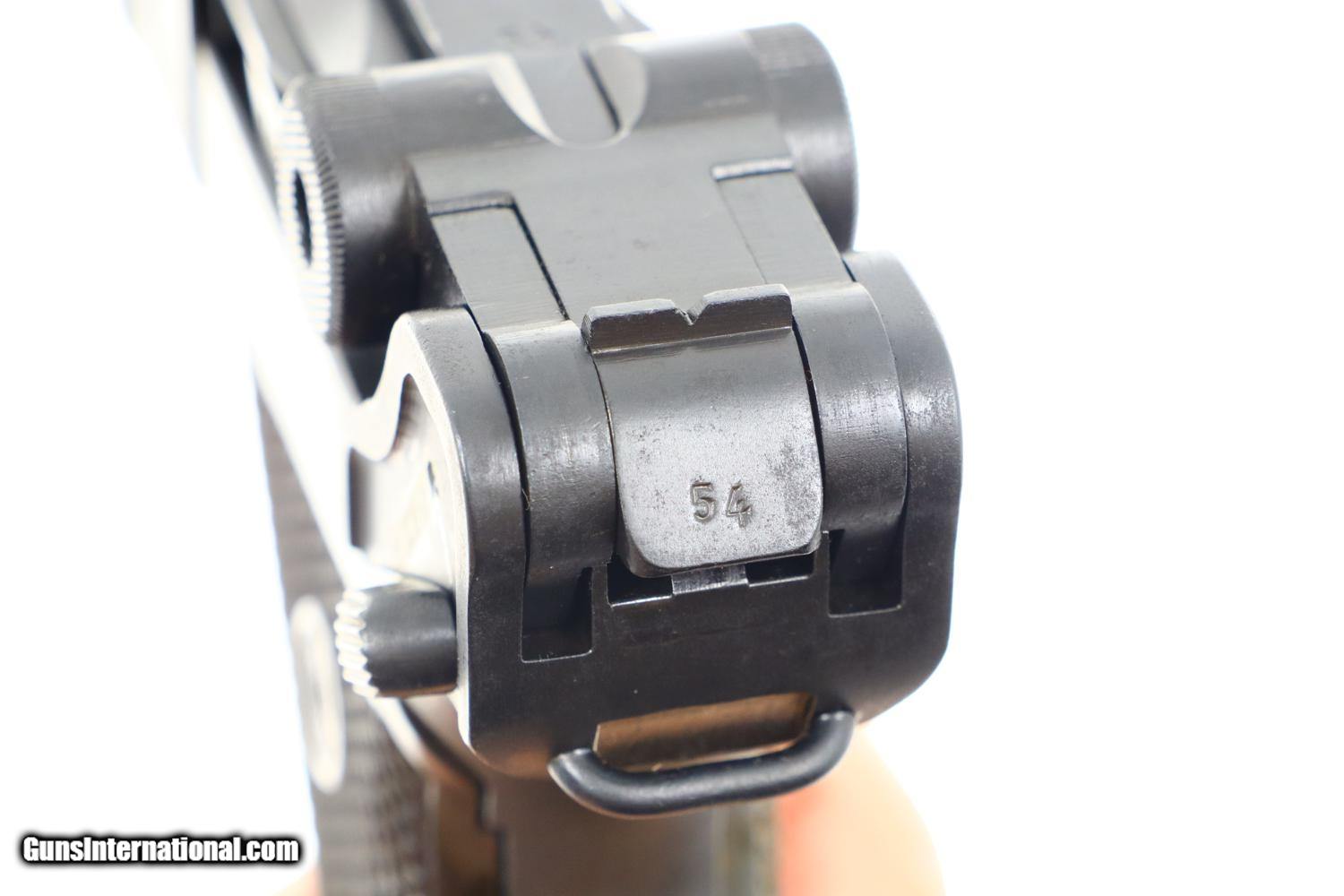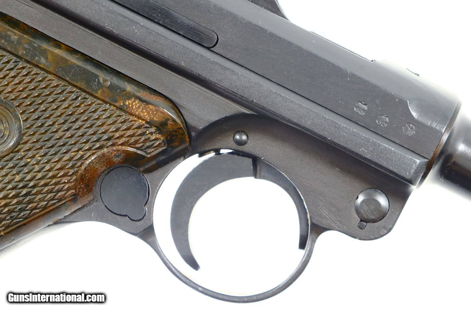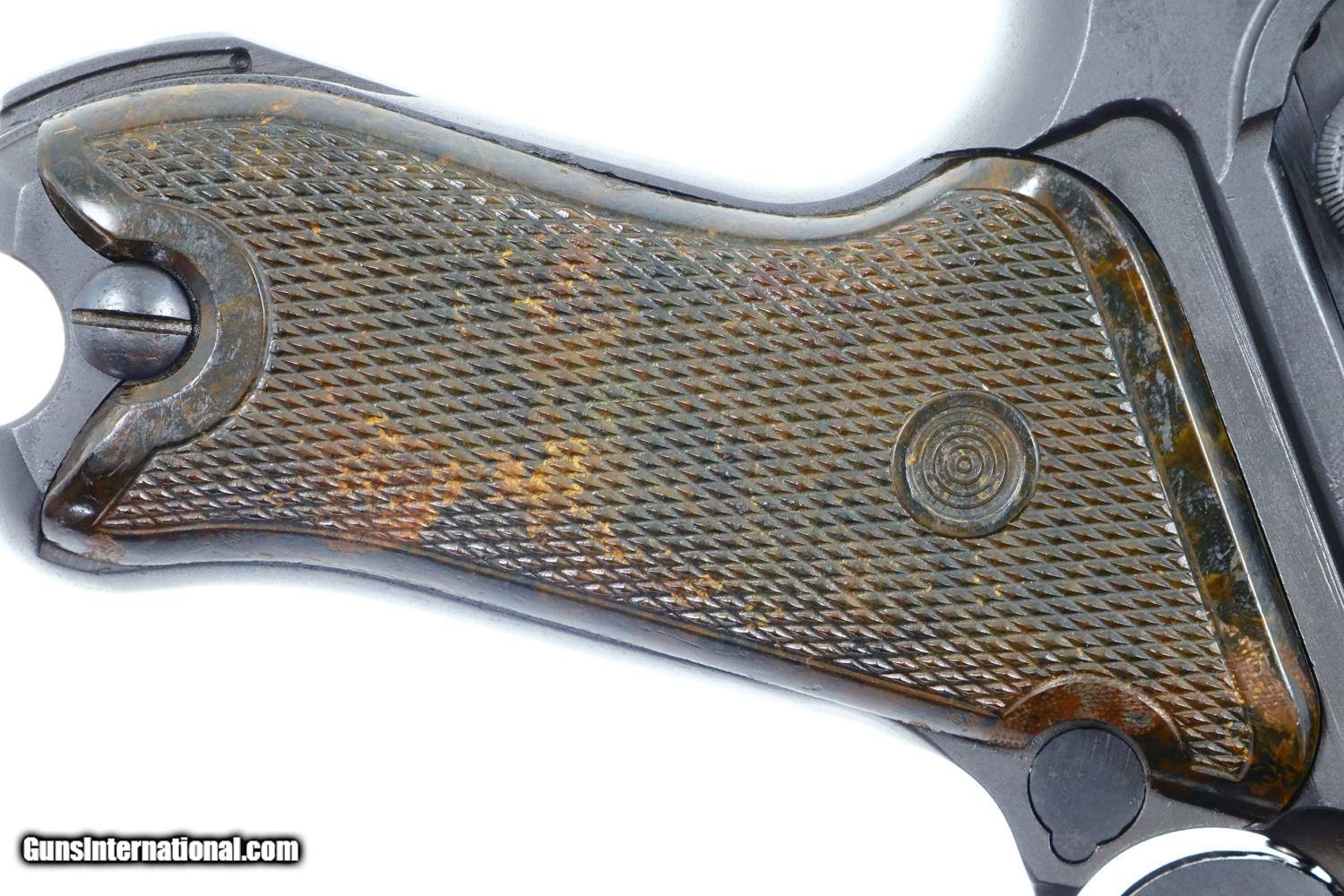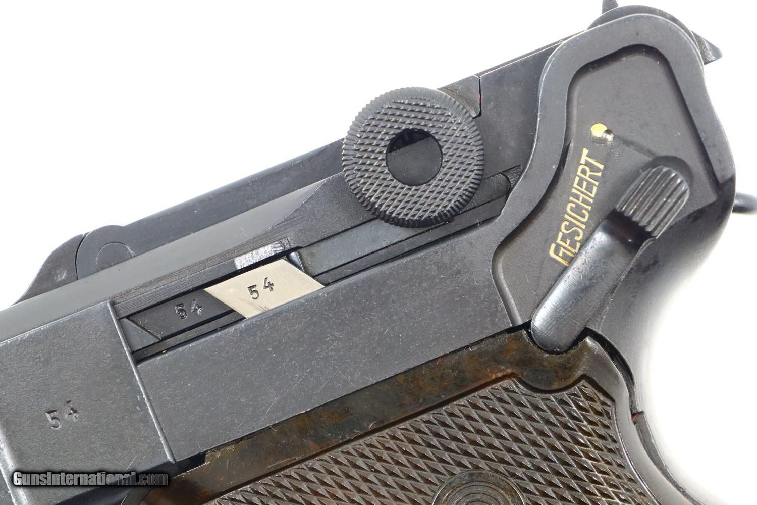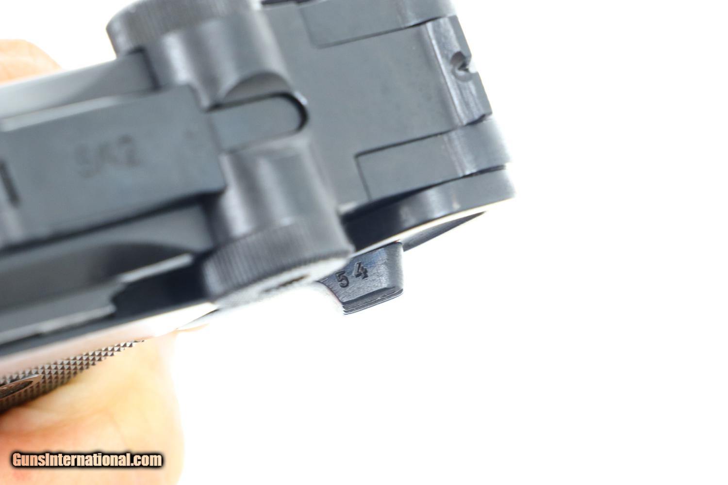 Description: Synopsis: German Mauser P08 Luger, 1937 dated VOPO rework. Description: Mauser Luger, 1937 chamber date, S/42 code, typical VOPO rework with correct magazine. SN: 7854t. Cal: 9mmP. Standard configuration military Luger with 4” barrel having drift adjustable front sight and fixed “V” notch rear sight. 1937 chamber date, middle toggle link marked with S/42 code. Full serial number with letter suffix on front of frame with the serial number repeated on left side of receiver. Usual Waffenamt acceptances on right side of receiver. Disassembly shows all matching numbers except for firing pin number 17, and an unnumbered extractor, rear toggle pin, and holdopen. Condition: Approximately 98-99% reworked/redipped salt blue as typical for a VOPO rework. Comparable condition grips and magazine. Bright bore with sharp rifling. Perfect manual mechanics. ~~Insured shipping fee of $55; most packages shipped using FedEx 2nd Day.~~ SOLD Manufacturer: Mauser Serial Number: 7854 Caliber Info: 9mmP |
