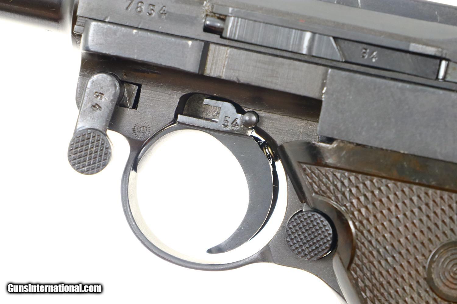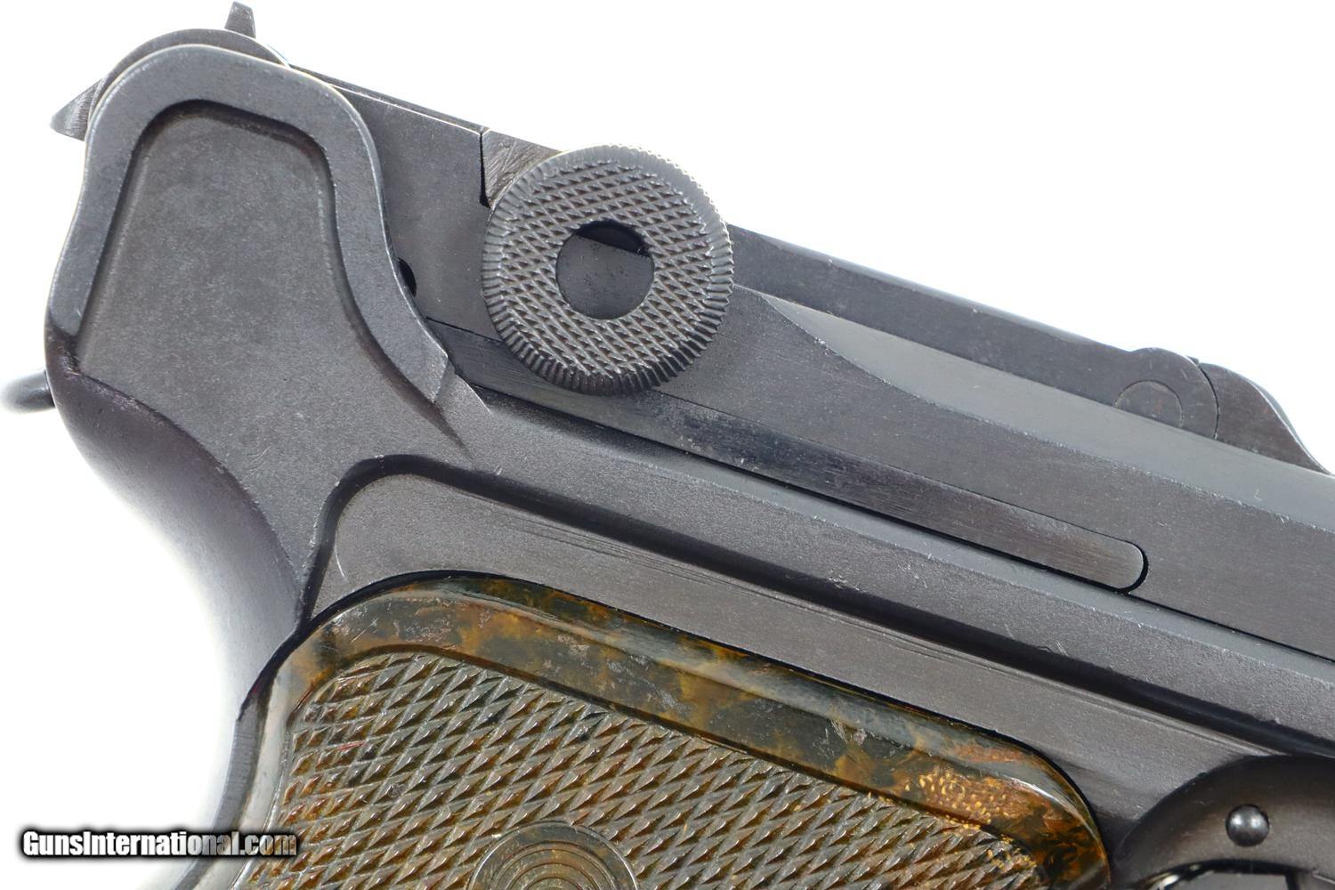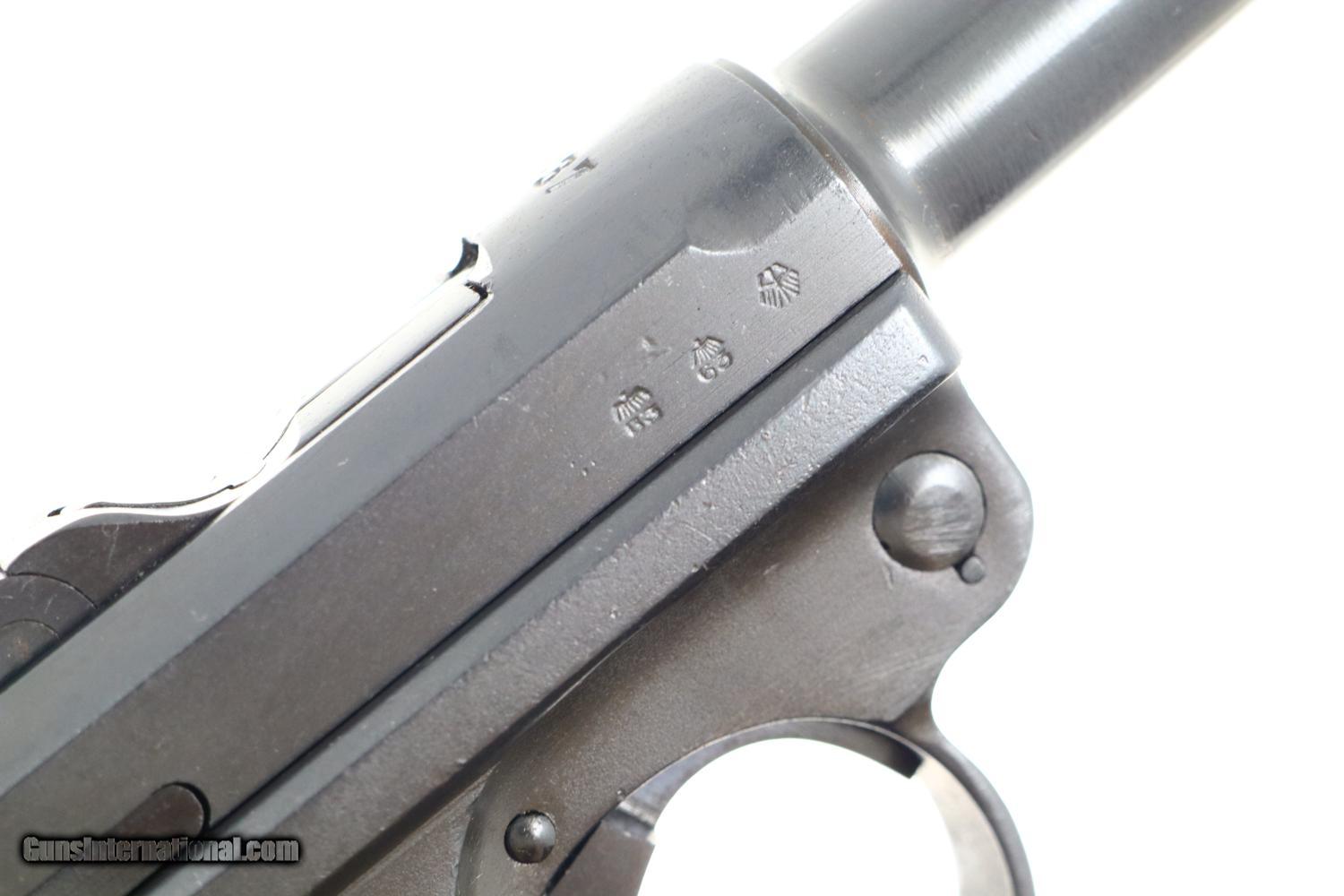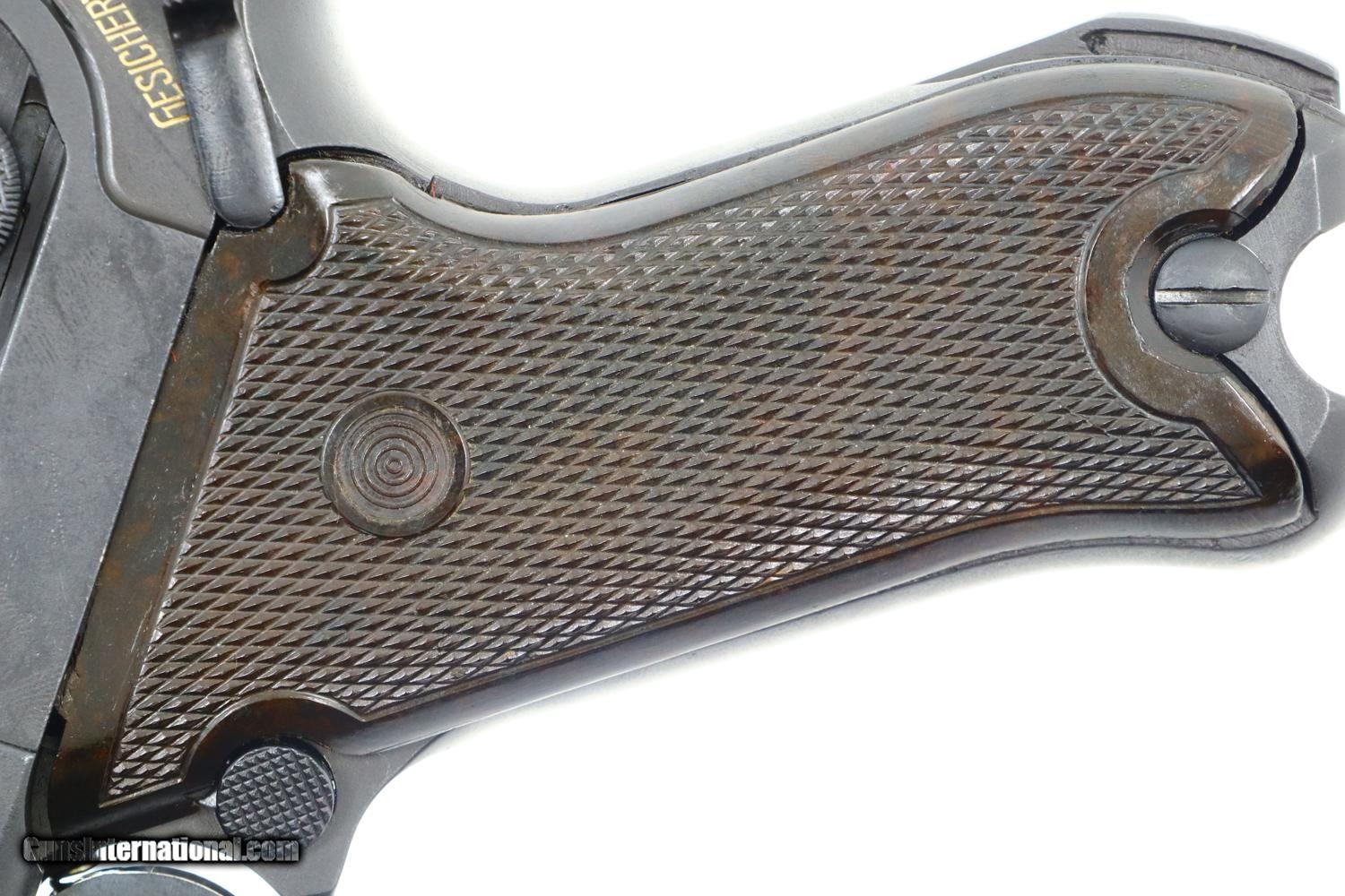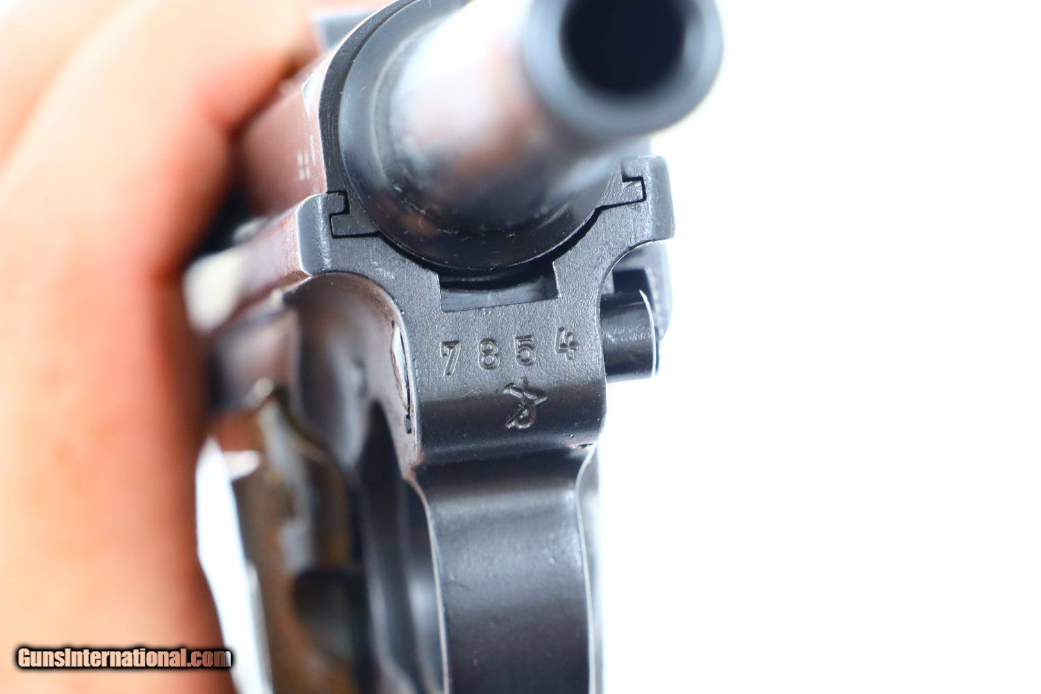 Description: Synopsis: German Mauser P08 Luger, 1937 dated VOPO rework. Description: Mauser Luger, 1937 chamber date, S/42 code, typical VOPO rework with correct magazine. SN: 7854t. Cal: 9mmP. Standard configuration military Luger with 4” barrel having drift adjustable front sight and fixed “V” notch rear sight. 1937 chamber date, middle toggle link marked with S/42 code. Full serial number with letter suffix on front of frame with the serial number repeated on left side of receiver. Usual Waffenamt acceptances on right side of receiver. Disassembly shows all matching numbers except for firing pin number 17, and an unnumbered extractor, rear toggle pin, and holdopen. Condition: Approximately 98-99% reworked/redipped salt blue as typical for a VOPO rework. Comparable condition grips and magazine. Bright bore with sharp rifling. Perfect manual mechanics. ~~Insured shipping fee of $55; most packages shipped using FedEx 2nd Day.~~ SOLD Manufacturer: Mauser Serial Number: 7854 Caliber Info: 9mmP |
