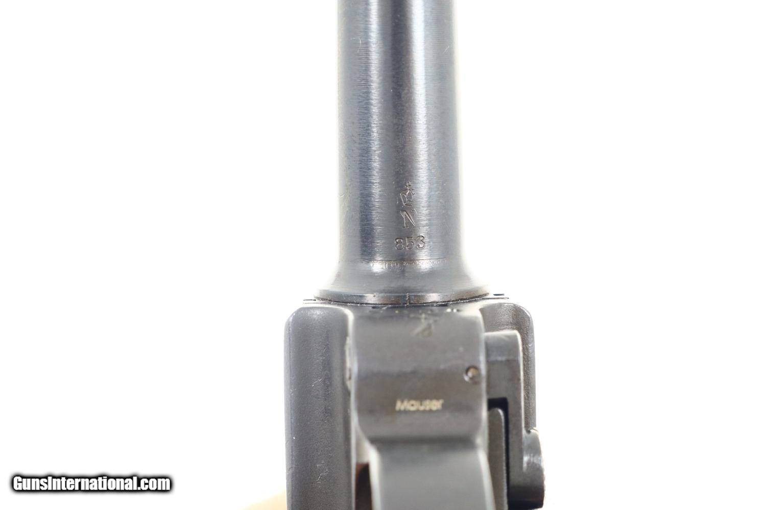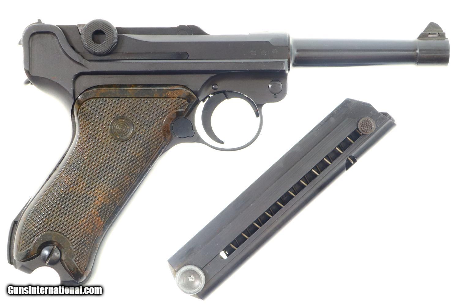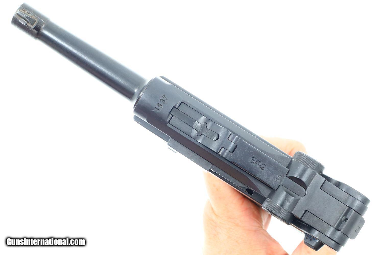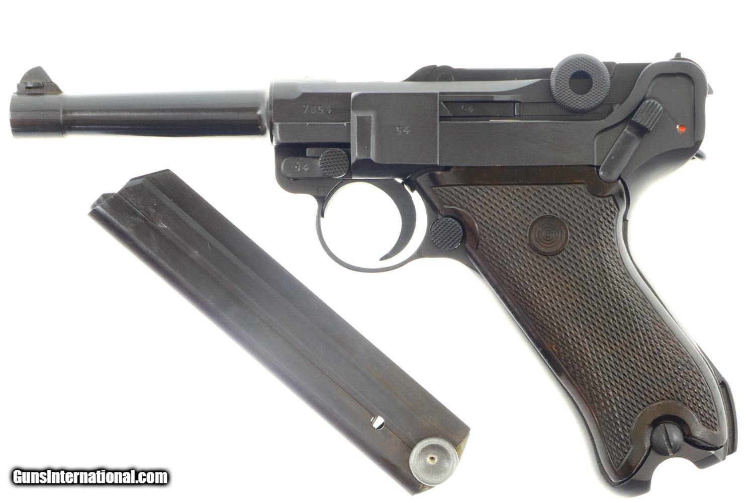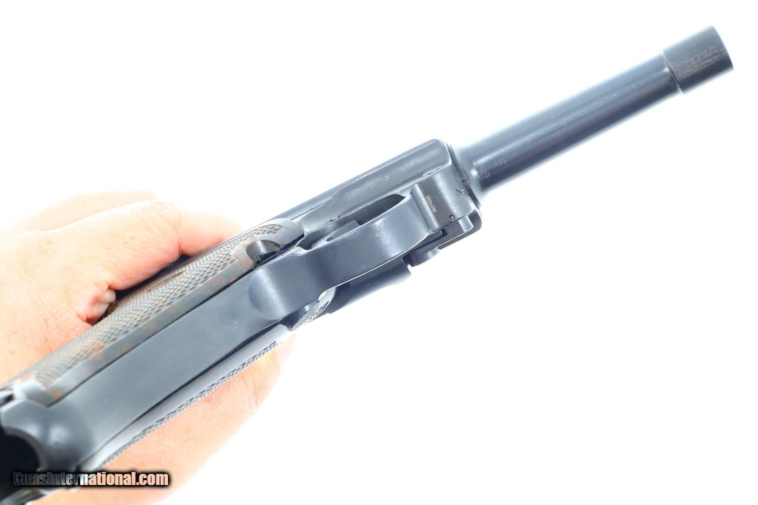 Description: Synopsis: German Mauser P08 Luger, 1937 dated VOPO rework. Description: Mauser Luger, 1937 chamber date, S/42 code, typical VOPO rework with correct magazine. SN: 7854t. Cal: 9mmP. Standard configuration military Luger with 4” barrel having drift adjustable front sight and fixed “V” notch rear sight. 1937 chamber date, middle toggle link marked with S/42 code. Full serial number with letter suffix on front of frame with the serial number repeated on left side of receiver. Usual Waffenamt acceptances on right side of receiver. Disassembly shows all matching numbers except for firing pin number 17, and an unnumbered extractor, rear toggle pin, and holdopen. Condition: Approximately 98-99% reworked/redipped salt blue as typical for a VOPO rework. Comparable condition grips and magazine. Bright bore with sharp rifling. Perfect manual mechanics. ~~Insured shipping fee of $55; most packages shipped using FedEx 2nd Day.~~ SOLD Manufacturer: Mauser Serial Number: 7854 Caliber Info: 9mmP |