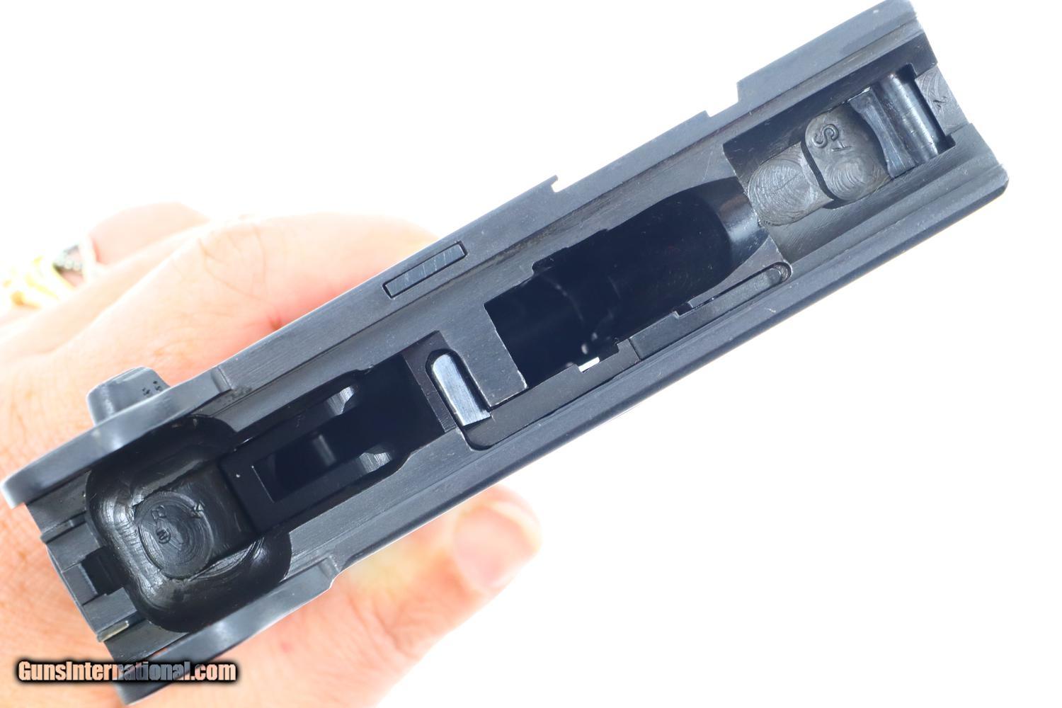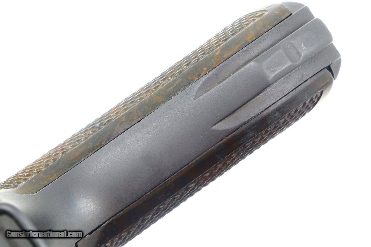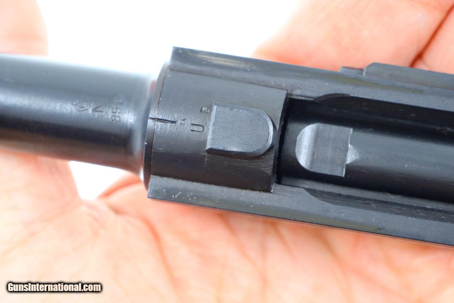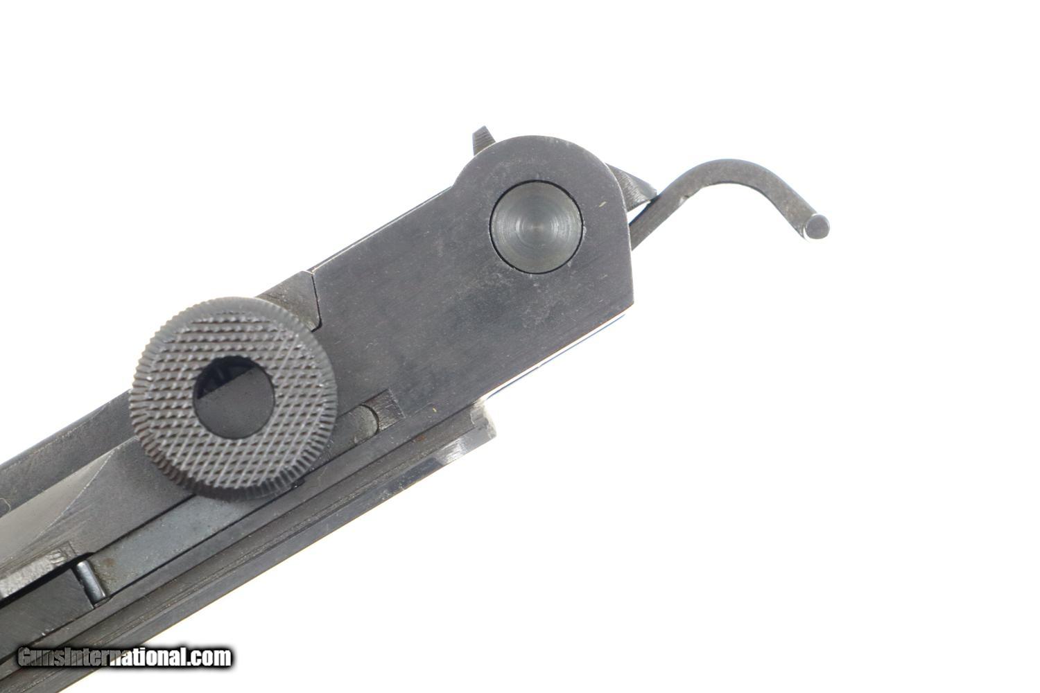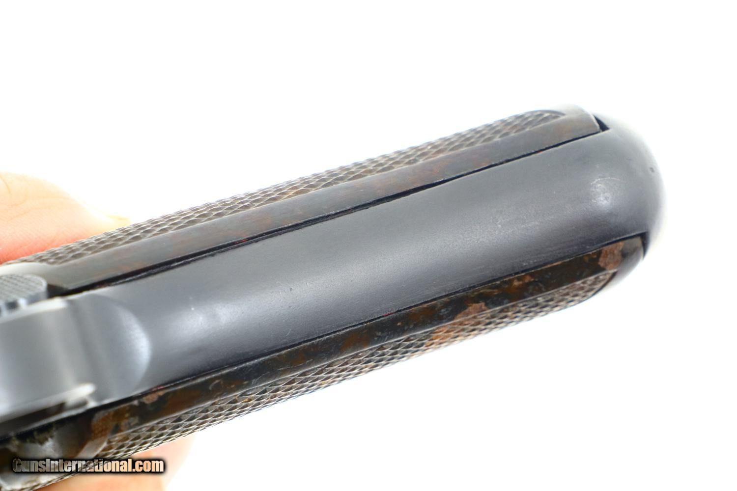 Description: Synopsis: German Mauser P08 Luger, 1937 dated VOPO rework. Description: Mauser Luger, 1937 chamber date, S/42 code, typical VOPO rework with correct magazine. SN: 7854t. Cal: 9mmP. Standard configuration military Luger with 4” barrel having drift adjustable front sight and fixed “V” notch rear sight. 1937 chamber date, middle toggle link marked with S/42 code. Full serial number with letter suffix on front of frame with the serial number repeated on left side of receiver. Usual Waffenamt acceptances on right side of receiver. Disassembly shows all matching numbers except for firing pin number 17, and an unnumbered extractor, rear toggle pin, and holdopen. Condition: Approximately 98-99% reworked/redipped salt blue as typical for a VOPO rework. Comparable condition grips and magazine. Bright bore with sharp rifling. Perfect manual mechanics. ~~Insured shipping fee of $55; most packages shipped using FedEx 2nd Day.~~ SOLD Manufacturer: Mauser Serial Number: 7854 Caliber Info: 9mmP |