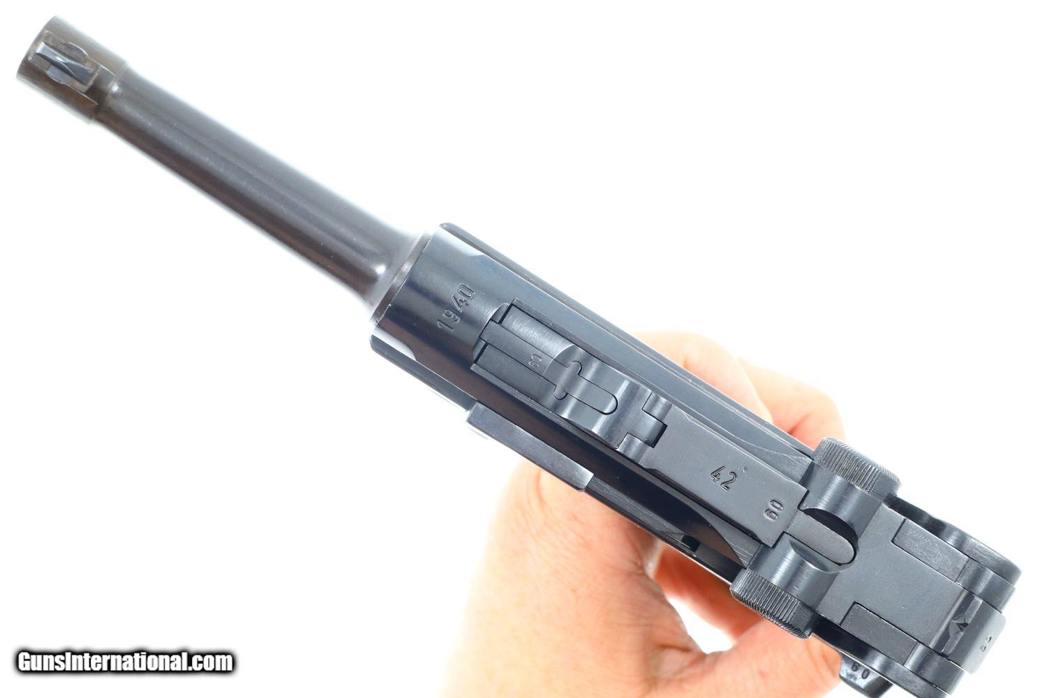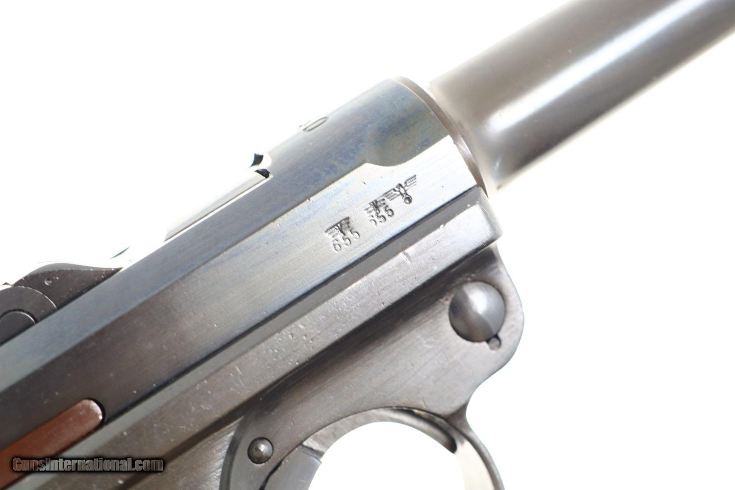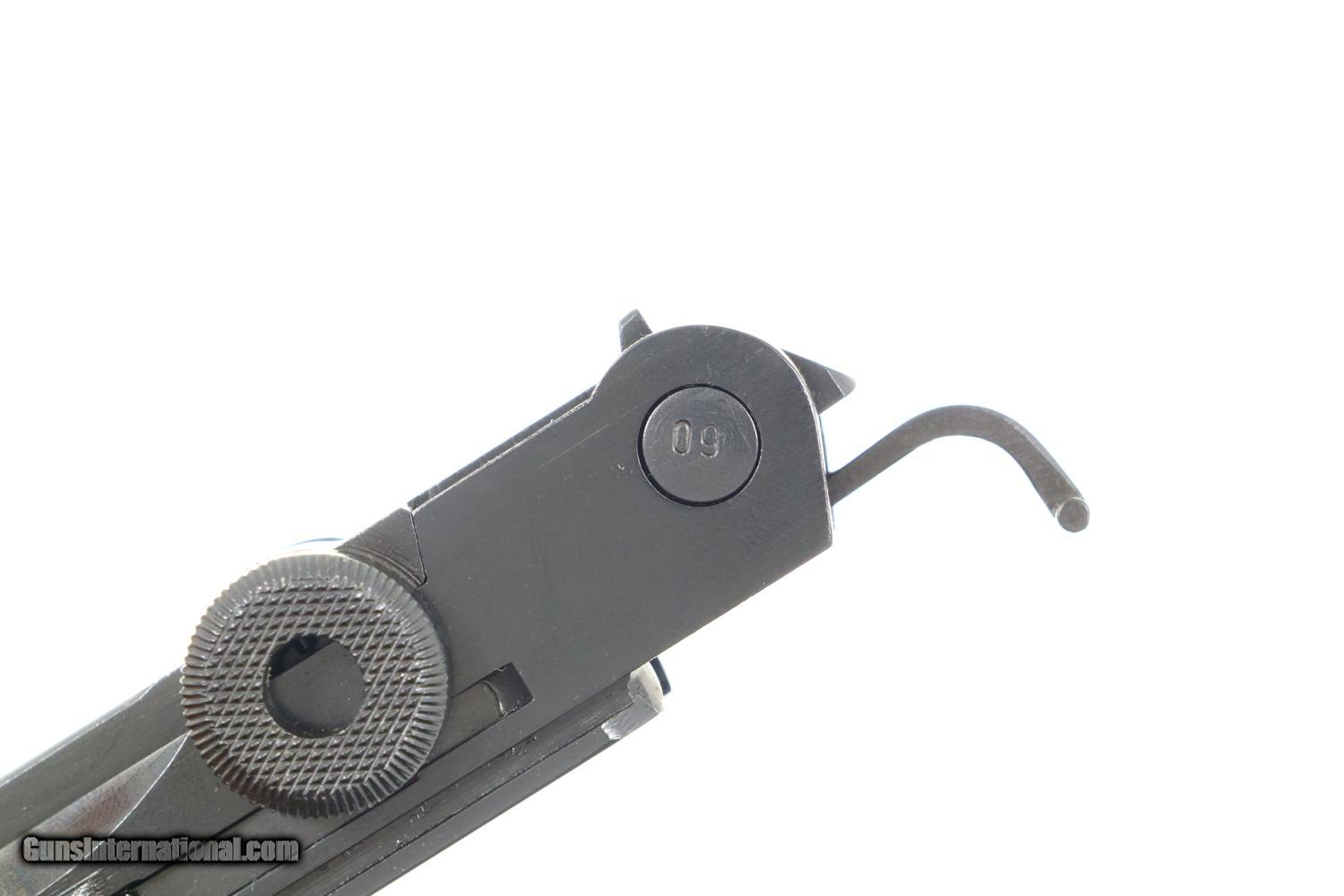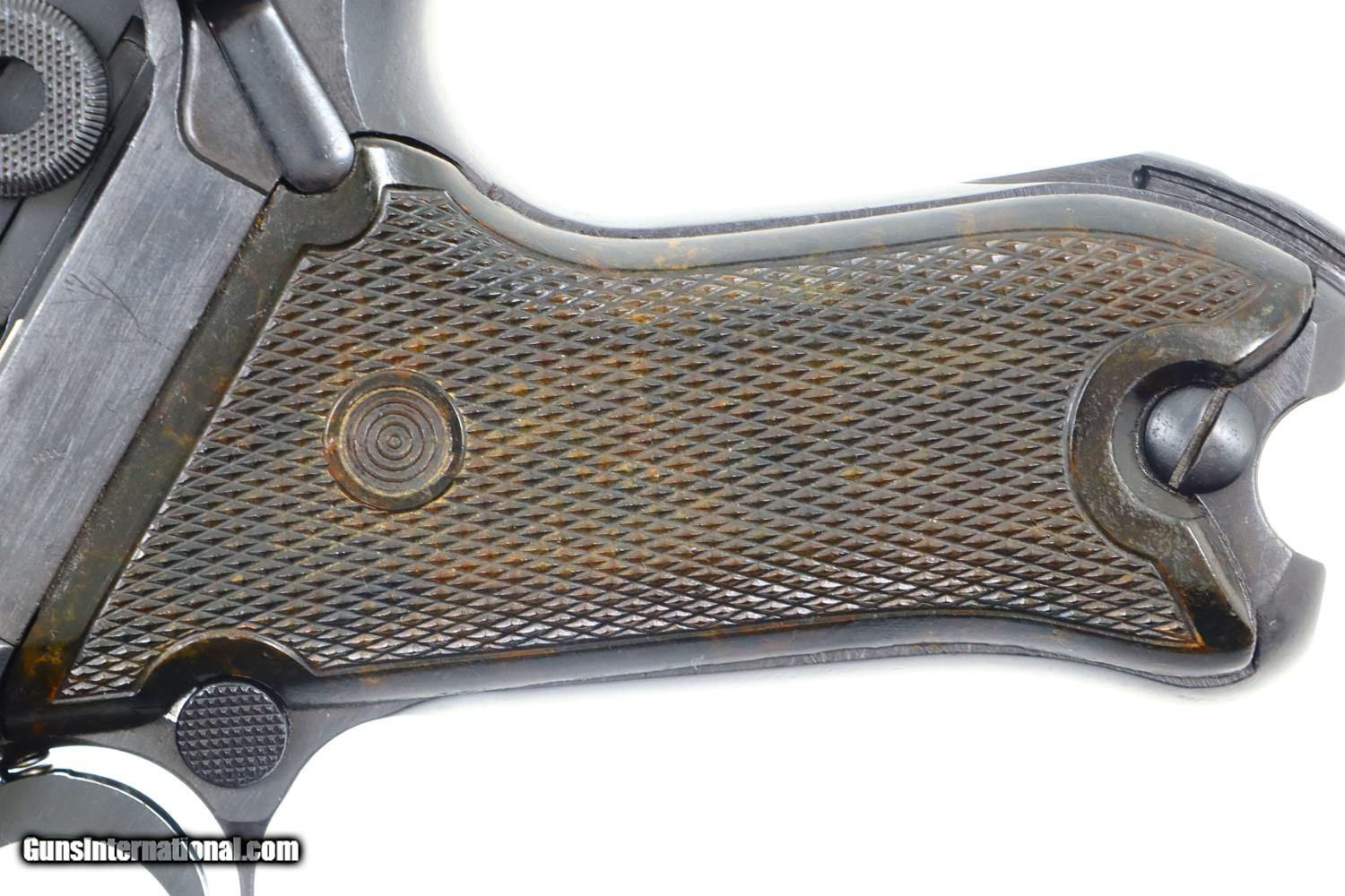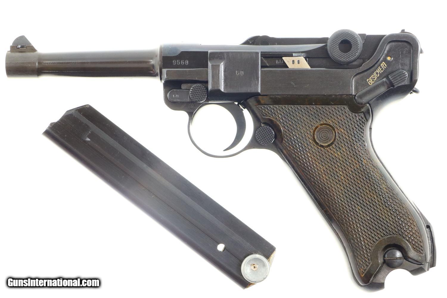 Description: Synopsis: German Mauser P08 Luger, 1940 dated VOPO rework. Description: Mauser Luger, 1940 chamber date, 42 code with plastic grips. Standard configuration military Luger with 4” barrel having drift adjustable front sight and fixed “V” notch rear sight. 1940 chamber date, middle toggle link marked with 42 code. Full serial number with letter suffix on front of frame with the serial number repeated on left side of receiver. Usual Waffenamt acceptances on right side of receiver. Disassembly shows all small parts matching except the unnumbered barrel and unnumbered plastic grips. Postwar extruded magazine with plug numbered 9560. Condition: Approximately 99% reworked/re-dipped salt blue. Comparable condition VOPO grips and magazine. Mirror bright bore with very sharp rifling. Perfect manual mechanics. ~~Insured shipping fee of $55; most packages shipped using FedEx 2nd Day.~~ SOLD Manufacturer: Mauser Serial Number: 9560c Caliber Info: 9mmP |