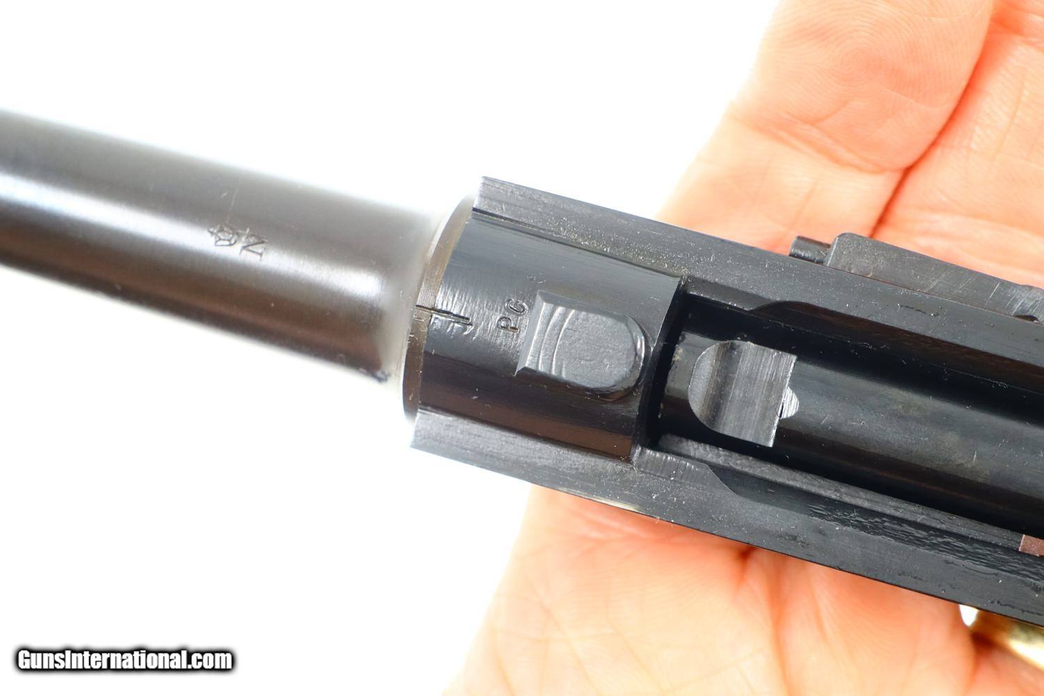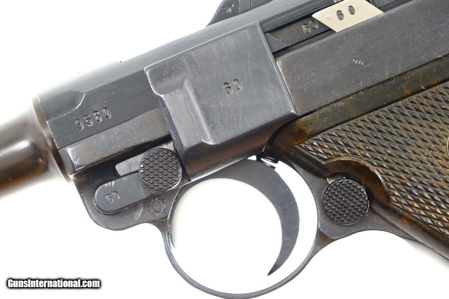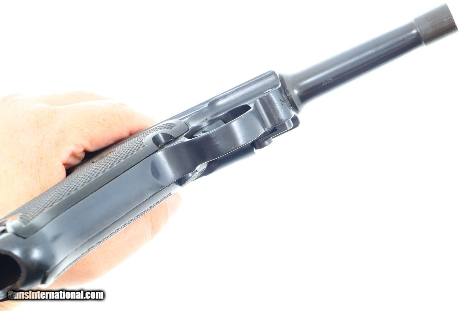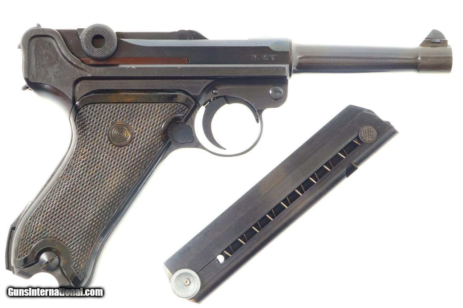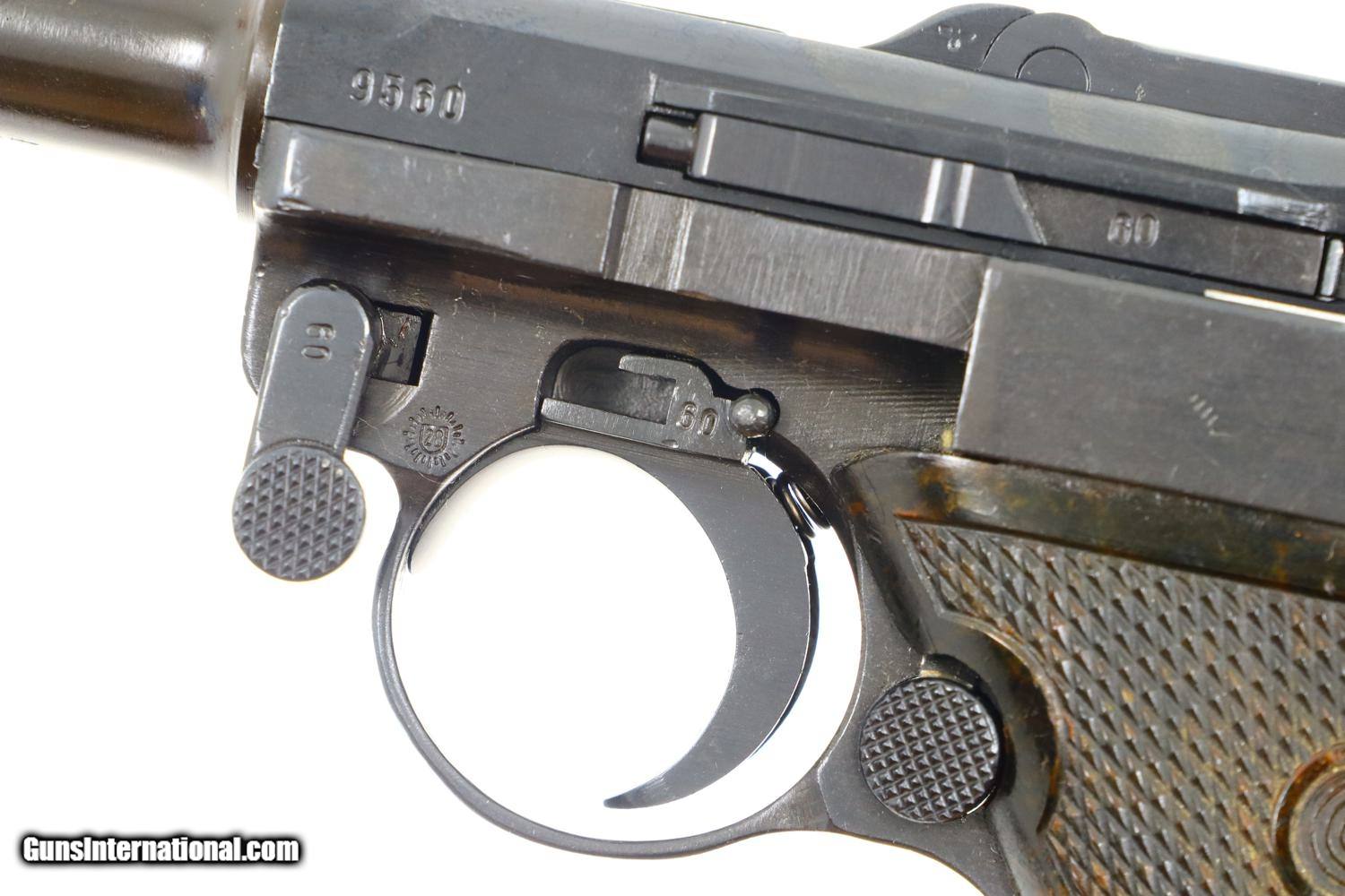 Description: Synopsis: German Mauser P08 Luger, 1940 dated VOPO rework. Description: Mauser Luger, 1940 chamber date, 42 code with plastic grips. Standard configuration military Luger with 4” barrel having drift adjustable front sight and fixed “V” notch rear sight. 1940 chamber date, middle toggle link marked with 42 code. Full serial number with letter suffix on front of frame with the serial number repeated on left side of receiver. Usual Waffenamt acceptances on right side of receiver. Disassembly shows all small parts matching except the unnumbered barrel and unnumbered plastic grips. Postwar extruded magazine with plug numbered 9560. Condition: Approximately 99% reworked/re-dipped salt blue. Comparable condition VOPO grips and magazine. Mirror bright bore with very sharp rifling. Perfect manual mechanics. ~~Insured shipping fee of $55; most packages shipped using FedEx 2nd Day.~~ SOLD Manufacturer: Mauser Serial Number: 9560c Caliber Info: 9mmP |