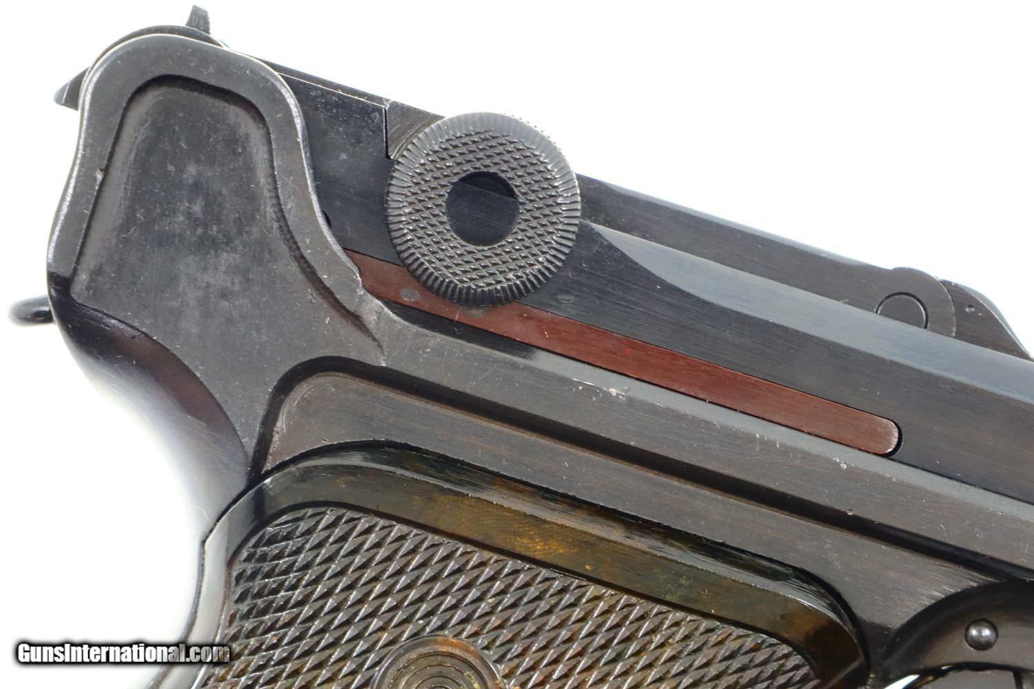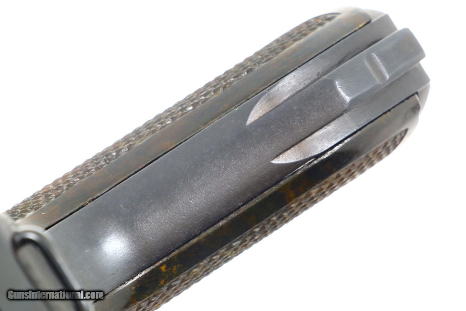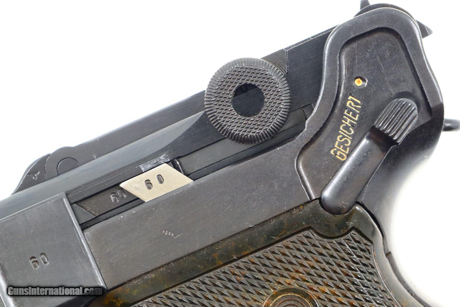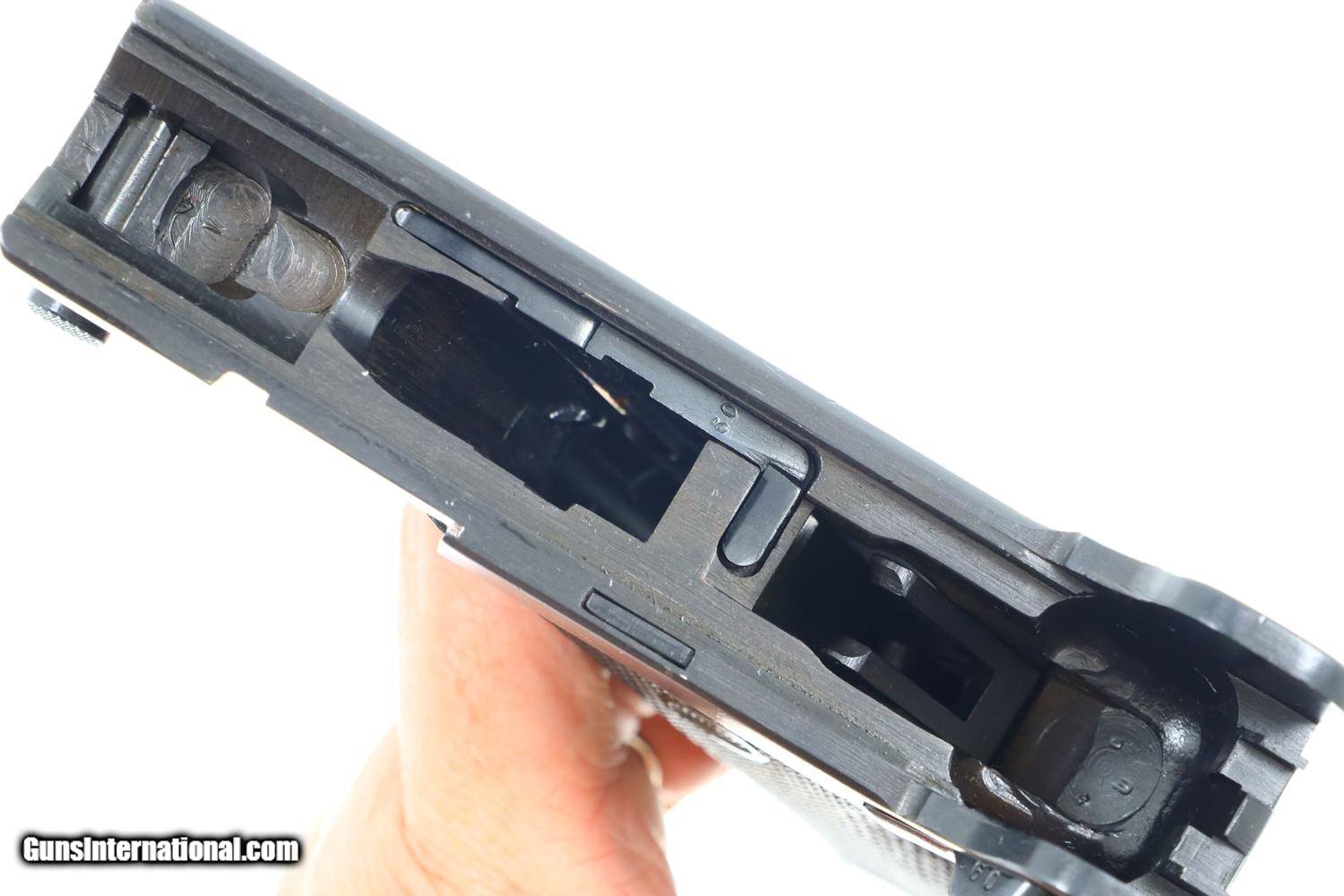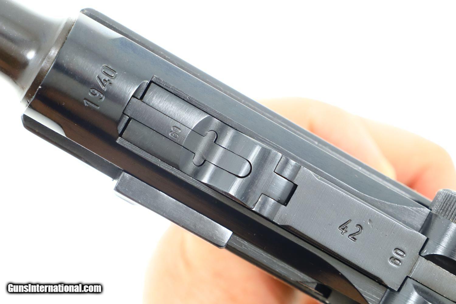 Description: Synopsis: German Mauser P08 Luger, 1940 dated VOPO rework. Description: Mauser Luger, 1940 chamber date, 42 code with plastic grips. Standard configuration military Luger with 4” barrel having drift adjustable front sight and fixed “V” notch rear sight. 1940 chamber date, middle toggle link marked with 42 code. Full serial number with letter suffix on front of frame with the serial number repeated on left side of receiver. Usual Waffenamt acceptances on right side of receiver. Disassembly shows all small parts matching except the unnumbered barrel and unnumbered plastic grips. Postwar extruded magazine with plug numbered 9560. Condition: Approximately 99% reworked/re-dipped salt blue. Comparable condition VOPO grips and magazine. Mirror bright bore with very sharp rifling. Perfect manual mechanics. ~~Insured shipping fee of $55; most packages shipped using FedEx 2nd Day.~~ SOLD Manufacturer: Mauser Serial Number: 9560c Caliber Info: 9mmP |