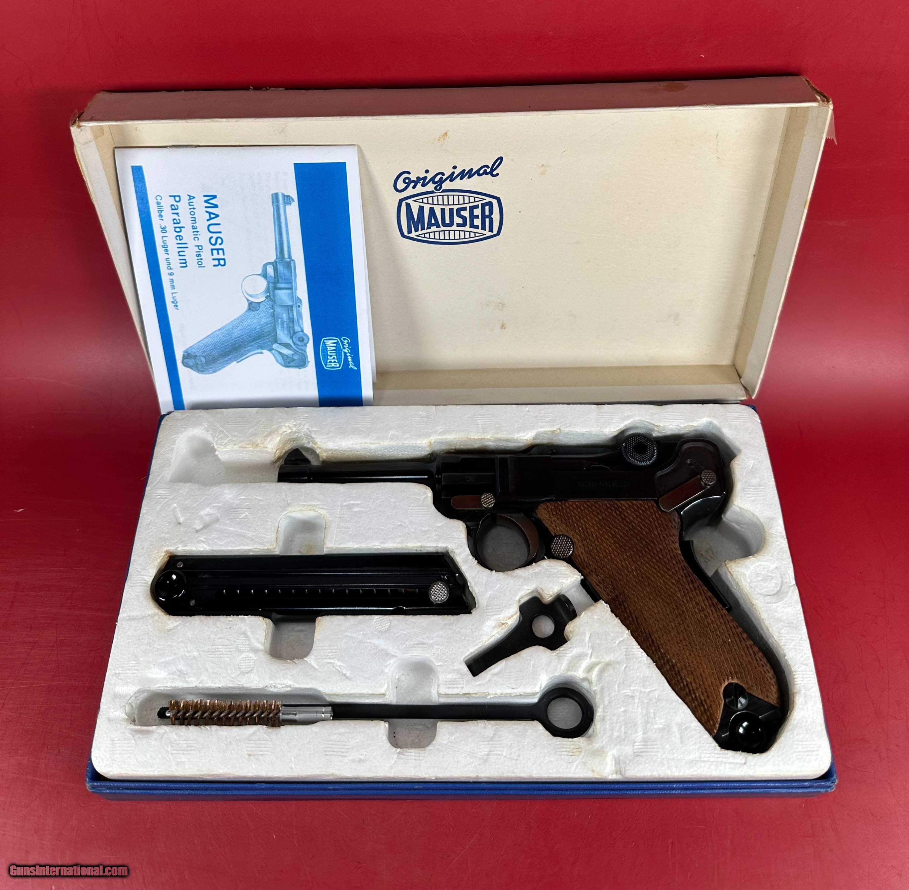 Description: After WWII, the demand for Luger pistols gradually picked back-up and copies of the original Luger pistols were made by Mauser as well as Stoeger. This pistol was made by Mauser. For sale Near Mint condition West German made Mauser-Werke “Original Mauser” American Eagle Parabellum 9mm Luger pistol 4" BBL with original matching box, manual, two magazines and tools. It has a grip safety as well as a manual safety. Perfect original high polish blue finish with perfect mechanics and shiny bore. Finish and grips are about 99%. Box is numbered and matches the pistol. This gun will make a great addition to any collection. C&R eligible. Manufacturer: Mauser-Werke A.G. Oberndorf a.N Caliber: 9,mm Luger Finish: Blue Barrel Length: 4" Optics/Sights: Serrated Ramp Front with U-Notch Rear Stock/Grips: Fully Checkered Walnut Grips Action: Semi-Automatic Layaway and no interest payment plan are available. SOLD Handgun Caliber: 9x19mm Parabellum (9mm Luger, 9x19mm NATO) |