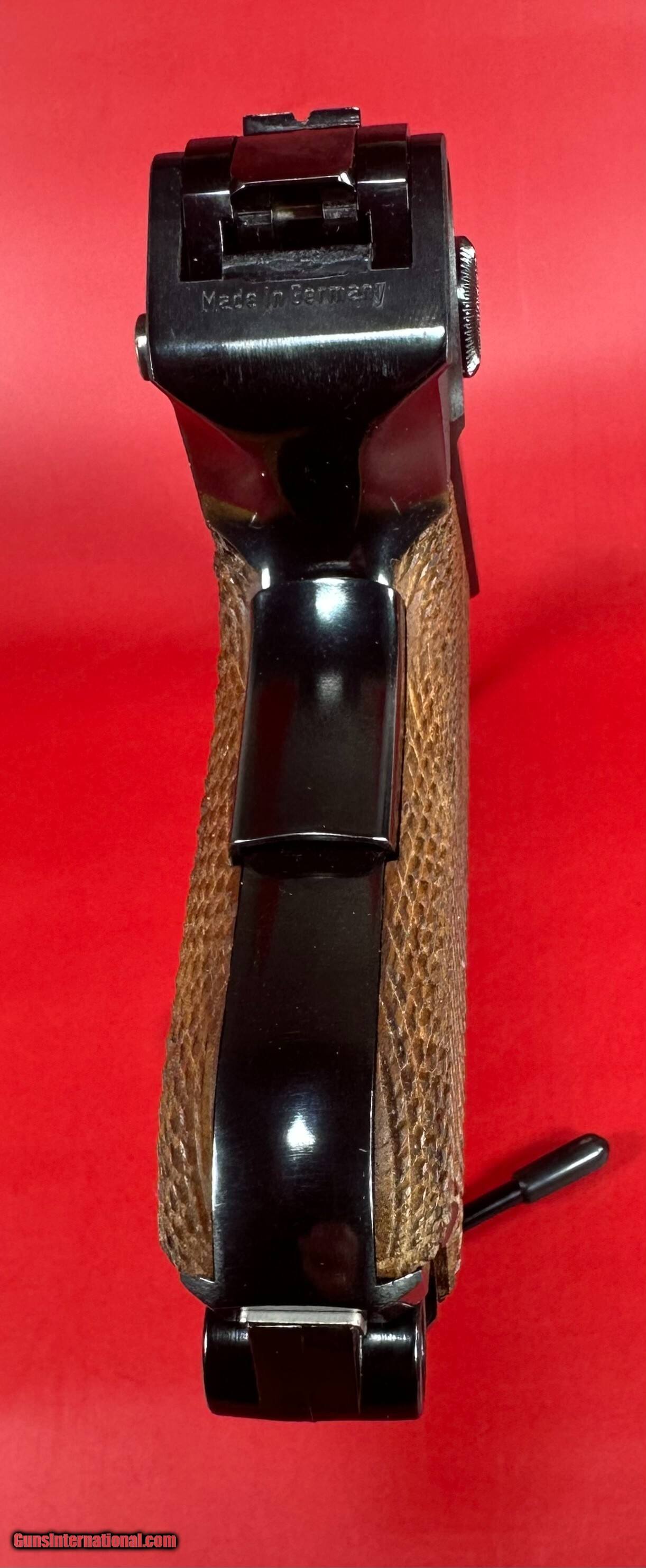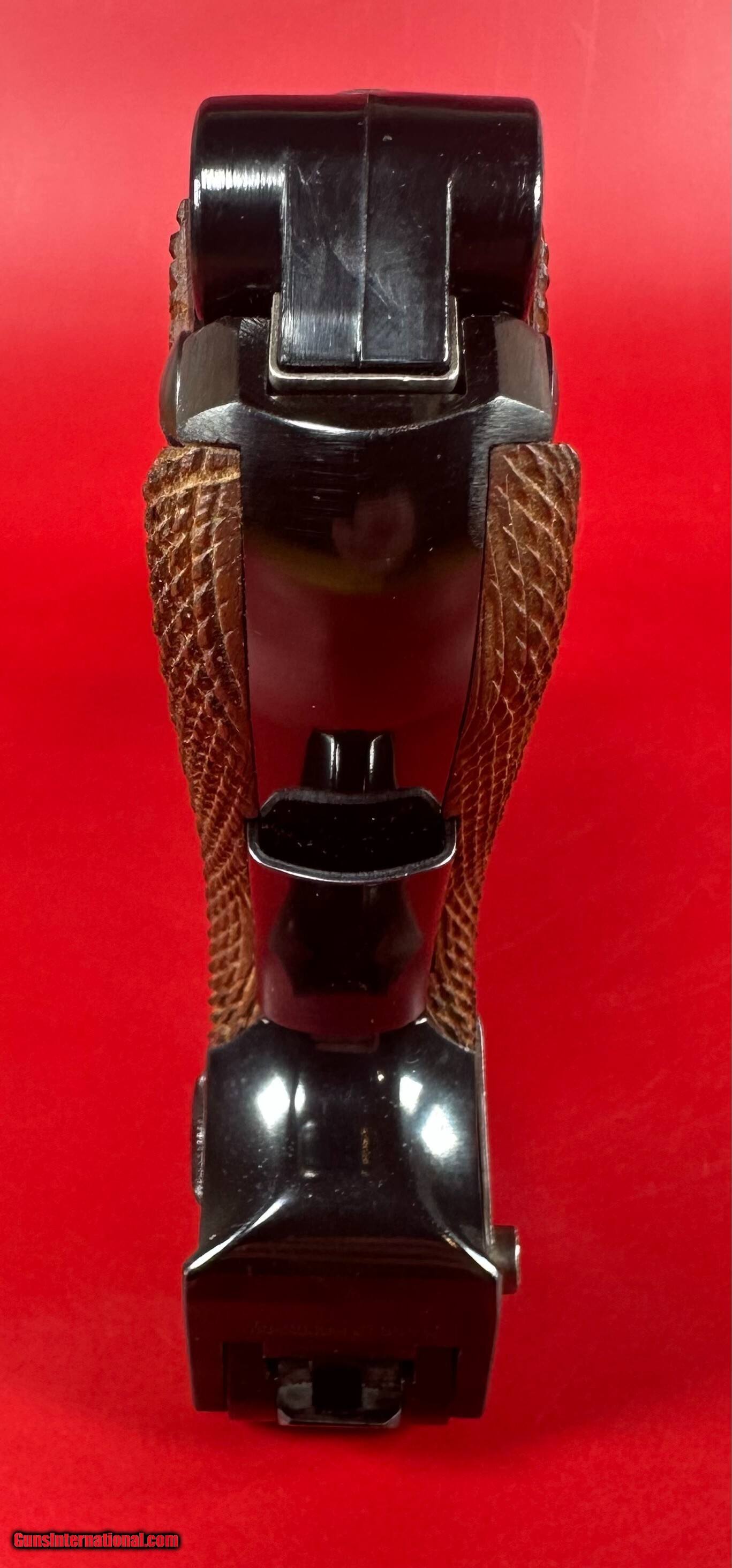 Description: After WWII, the demand for Luger pistols gradually picked back-up and copies of the original Luger pistols were made by Mauser as well as Stoeger. This pistol was made by Mauser. For sale Near Mint condition West German made Mauser-Werke “Original Mauser” American Eagle Parabellum 9mm Luger pistol 4" BBL with original matching box, manual, two magazines and tools. It has a grip safety as well as a manual safety. Perfect original high polish blue finish with perfect mechanics and shiny bore. Finish and grips are about 99%. Box is numbered and matches the pistol. This gun will make a great addition to any collection. C&R eligible. Manufacturer: Mauser-Werke A.G. Oberndorf a.N Caliber: 9,mm Luger Finish: Blue Barrel Length: 4" Optics/Sights: Serrated Ramp Front with U-Notch Rear Stock/Grips: Fully Checkered Walnut Grips Action: Semi-Automatic Layaway and no interest payment plan are available. Handgun Caliber: 9x19mm Parabellum (9mm Luger, 9x19mm NATO) Price: $2,199.00 Shipping: $39.00 Contact Seller |