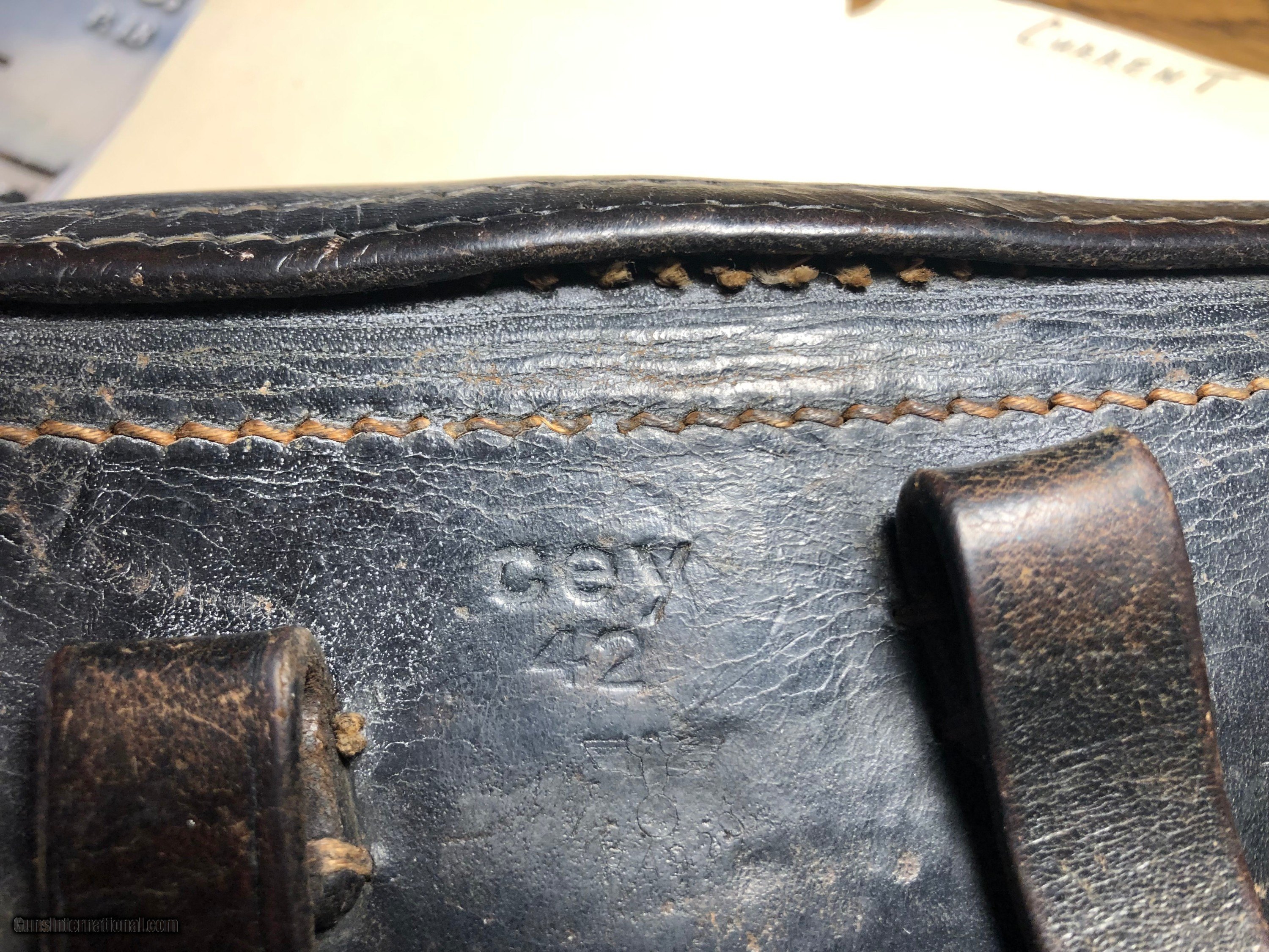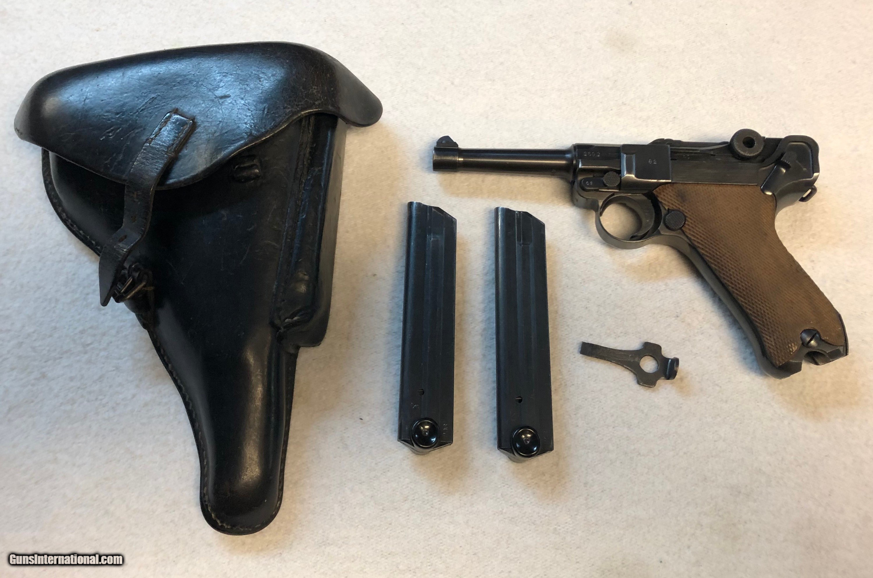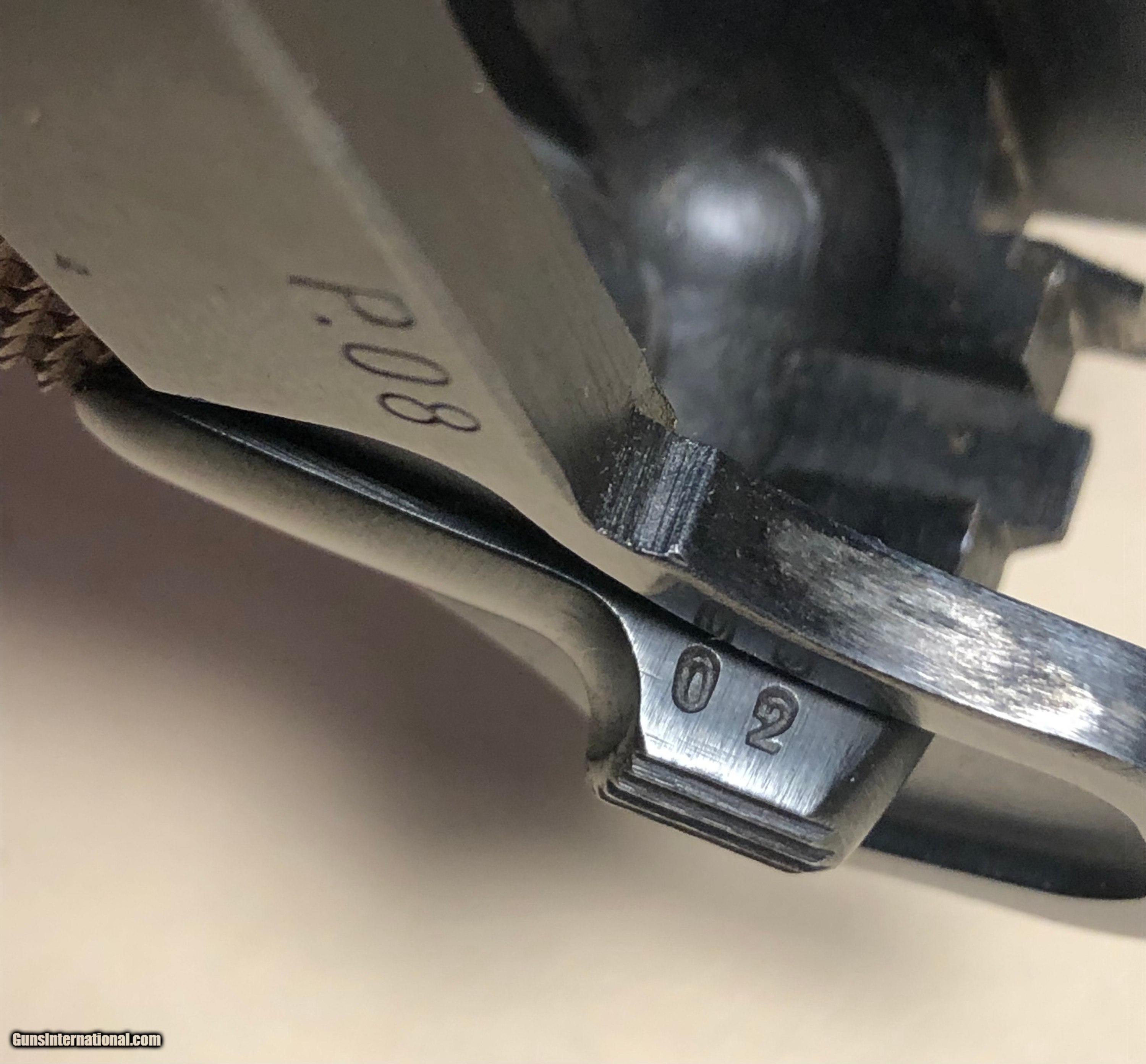 Description: This is a all matching Mauser (byf) P08 1942 Luger. S/N - 2602 h, it is in 95% condition with only very slight blue loss on high edges from the 1942 holster which is in very good condition but for some loose stiching between the belt loops on the top cover, included with the holster is a proof marked take down tool..The bore is near new. It comes with two correct un numbered fxo magazines with black plastic bottoms. The magazines look new. The grips are unmarked and very light in color. With black grips it could very well be a Black Widow. Please look at the photos as to mtching numbers. Many more photos available. $75 S&H insured to CON US. 4% C/C Fee. SOLD Curio/Relic: Yes Handgun Caliber: 9x19mm Parabellum (9mm Luger, 9x19mm NATO) Manufacturer: Mauser Model: P08 Serial Number: 2602h Bore: Excellent Condition: Excellent |