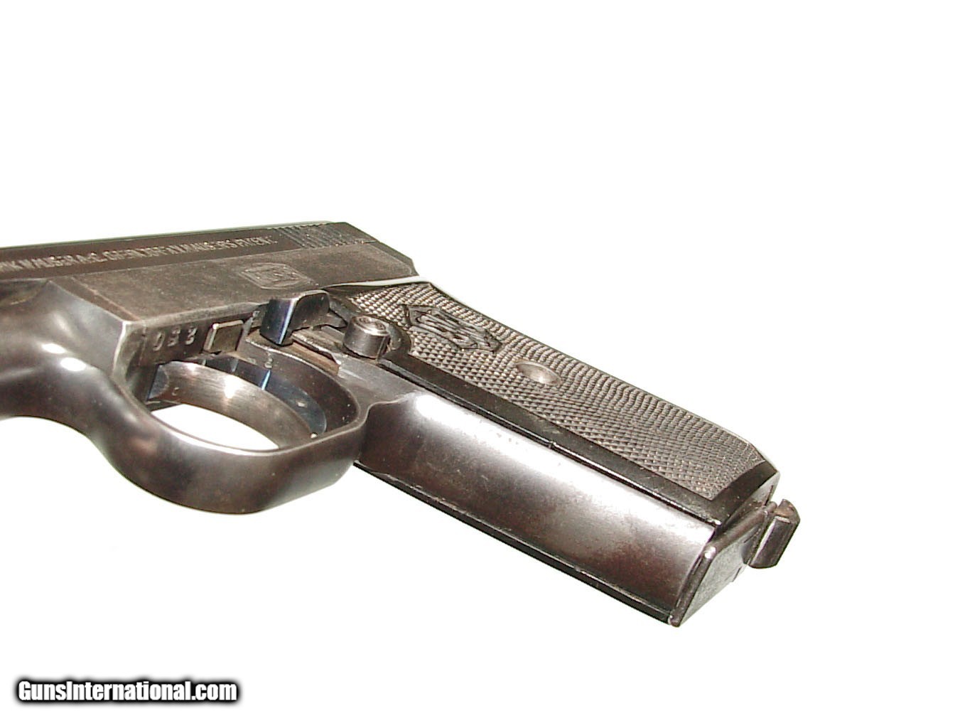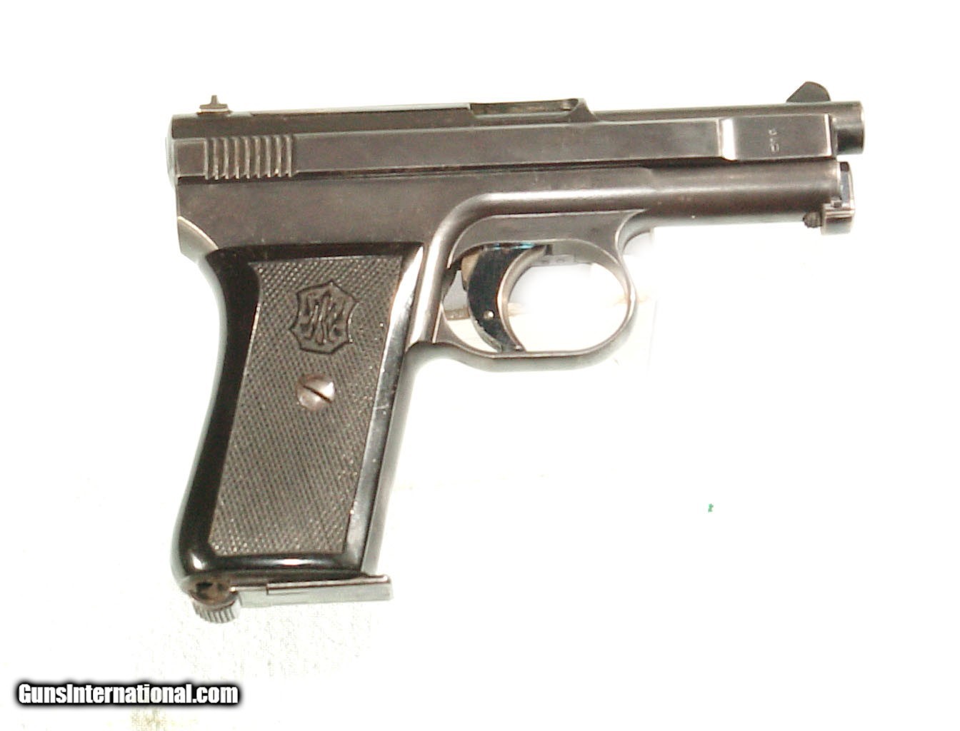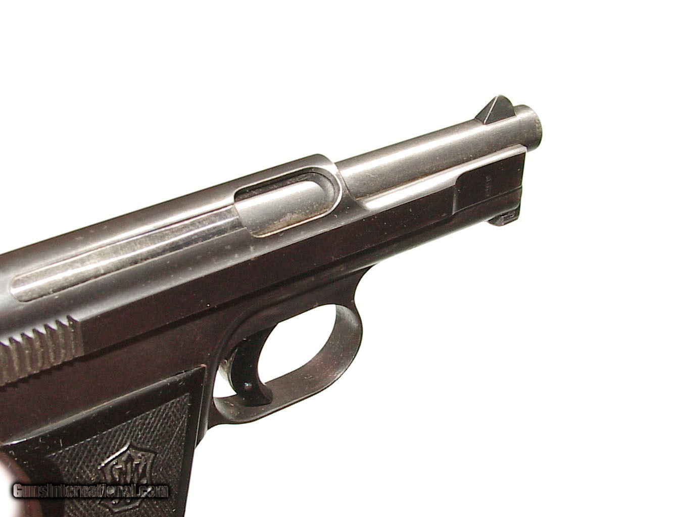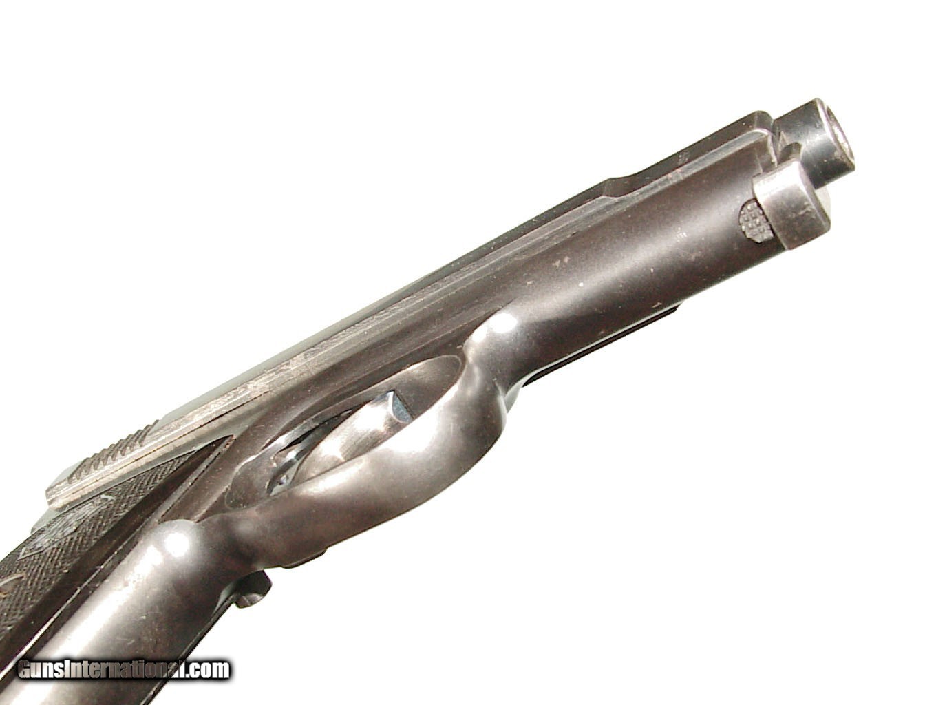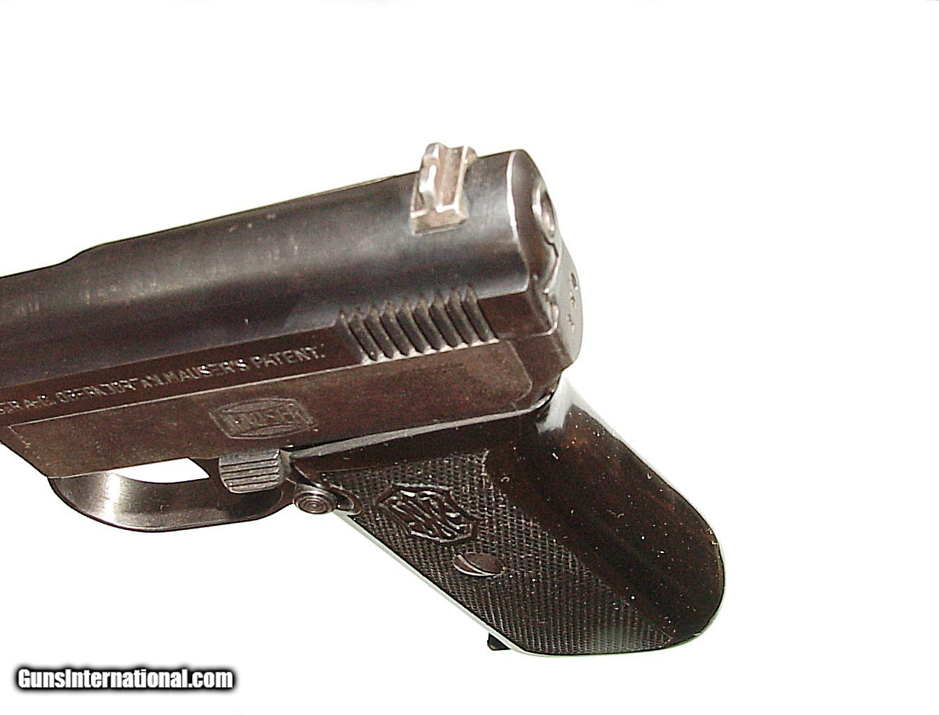 Description: .25 a.c.p caliber, 3" barrel, finished blue with checkered hardrubber grips. Single line address with the Mauser logo on the slide and the both sides of the grips. Retaining nearly all of the blue, excellent grips and mint bore. Accompanied by it's original brown leather holster with extra magazine. SOLD Curio/Relic: Yes |