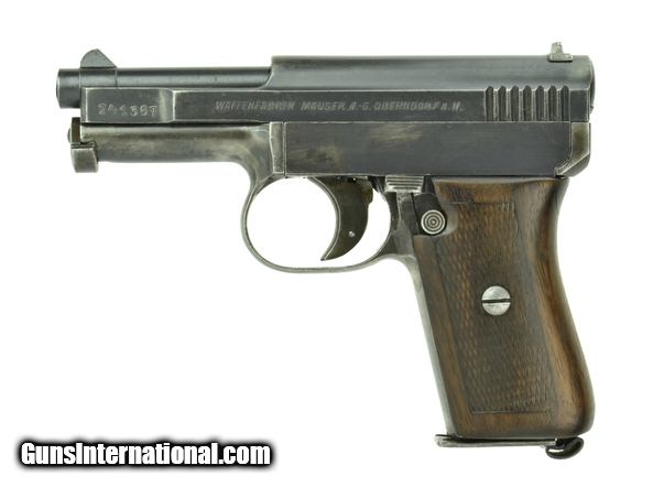 Description: Mauser 1910 .25 Auto caliber pistol. Manufactured in the 1930’s. Metal has approximately 75% original blue with patina on front grip strap. Bore has strong rifling with light frosting. Grip has a chip. Good overall condition.