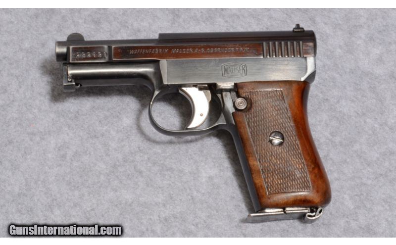 Description: This is the later version of the Mauser 1910 that is sometimes refered to as the 1910/14 by collectors. The earlier version had a pivoting takedown pin above the trigger guard and was often called a sidelatch. The later model has a cleaner profile. SOLD Caliber Info: 6.35mm (25 Cal.) Metal Condition: Excellent Wood Condition: Excellent Bore Condition: Excellent Barrels: 3 Stock: Wrap around walnut stock. Weight: 15 ozs. Sights: Fixed Extras: Comes with holster and one magazine. Item Location: Tulalip, WA |