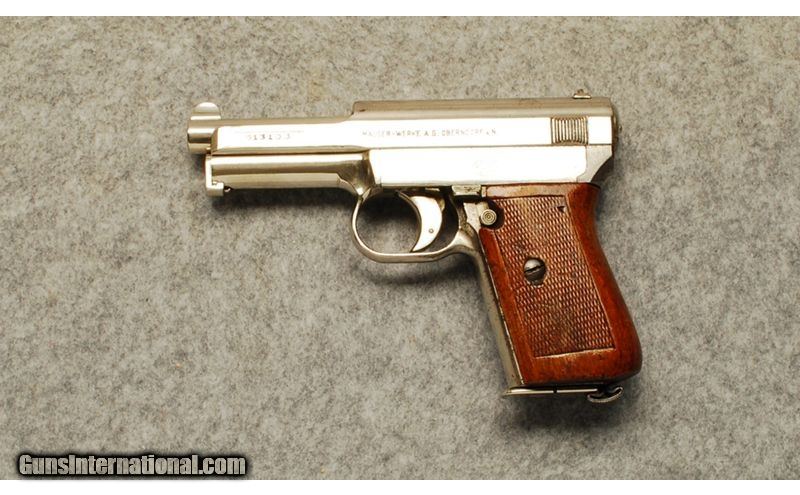Description: Here we have a good condition Mauser Model 1914 Pocket pistol chambered in 7.65mm (.32 ACP). The gun sports a very seldom encountered factory nickel finish which remains in good shape for its age, only wearing thin on the back of the gun, and with some sc .32 Auto SOLD Curio/Relic: Yes Metal Condition: Good, the factory nickel is wearing thin along the back of the pistol, and has some scattered freckling on the right hand side Wood Condition: Good, slightly worn, but free from any cracks or chips Barrels: 3.5 Triggers: Single Sights: Fixed Item Location: Scarborough, ME |